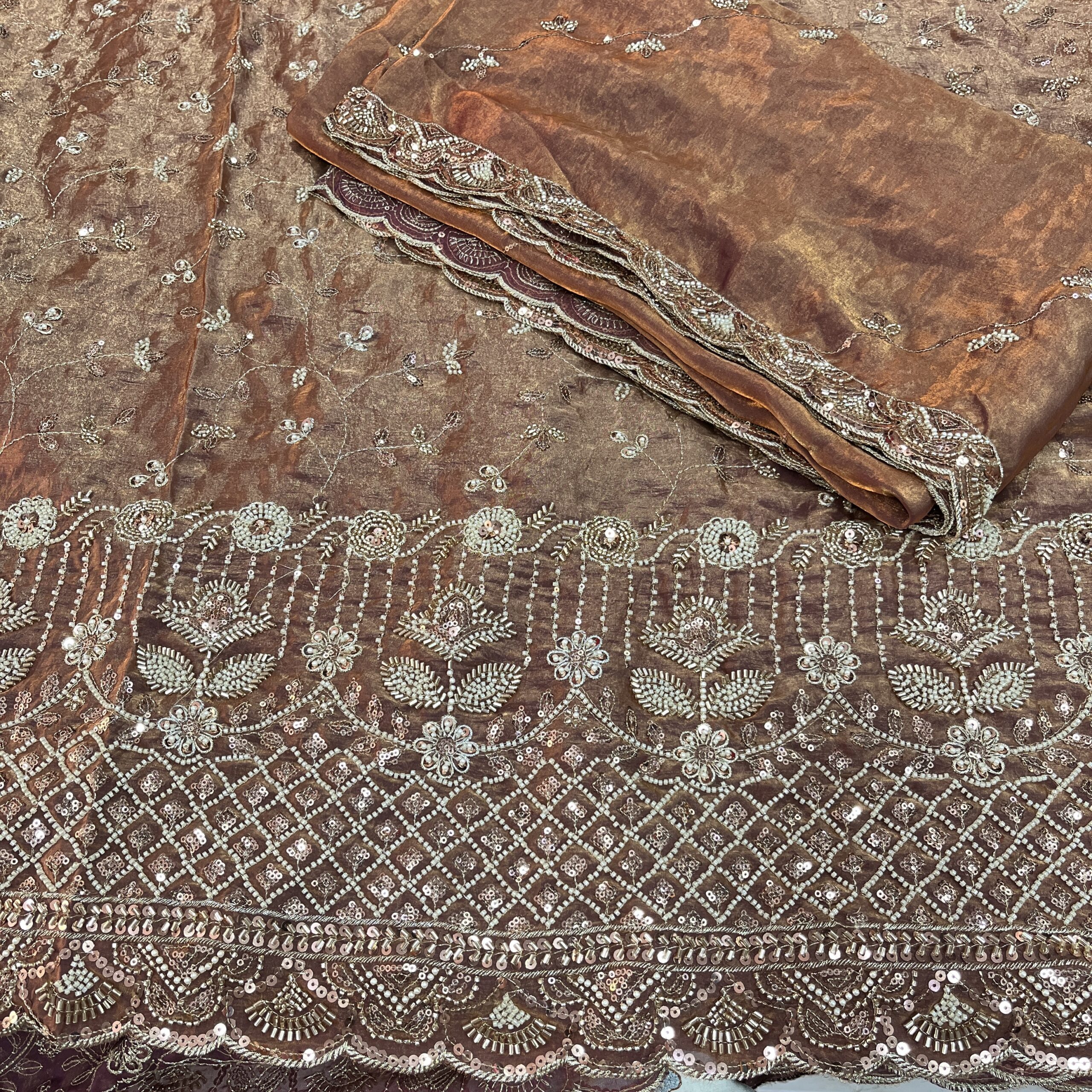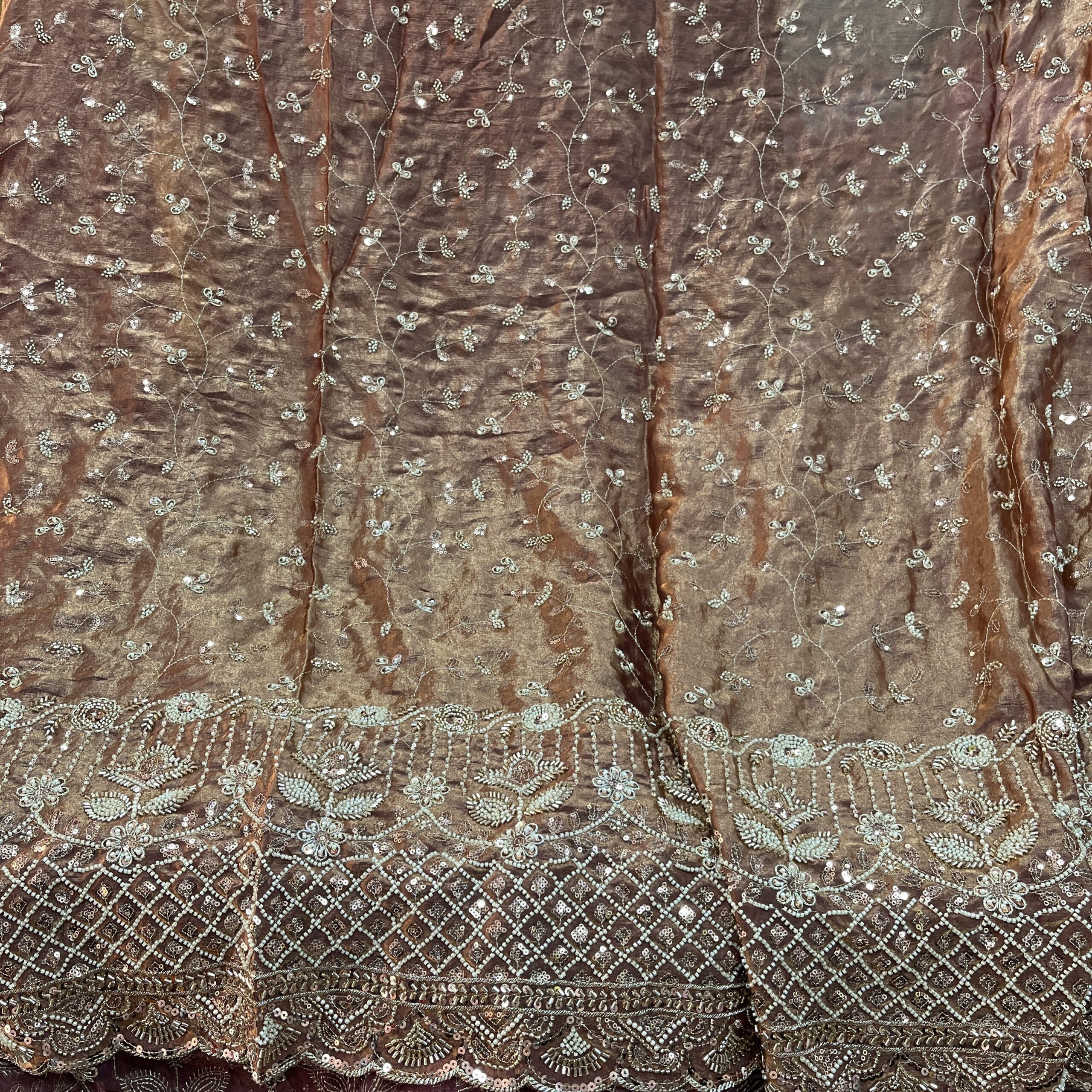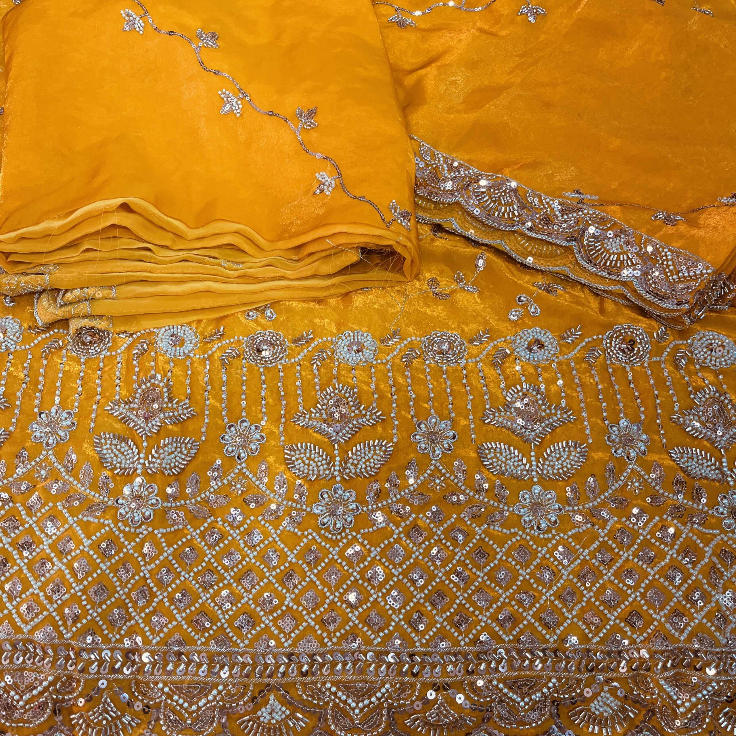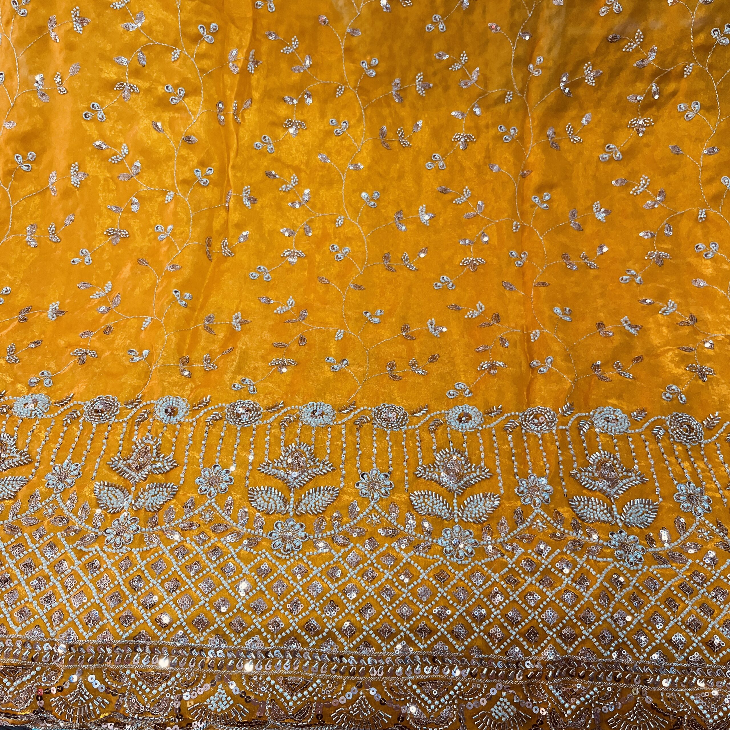 Discover luxury with our premium Fandy Silk Fabric available in 3 stunning colors featuring allover heavy jaal work with beads and cutdana hand embroidery. The rich texture and elegant surface detailing make it the perfect designer fabric for brides and bridesmaids this wedding season.