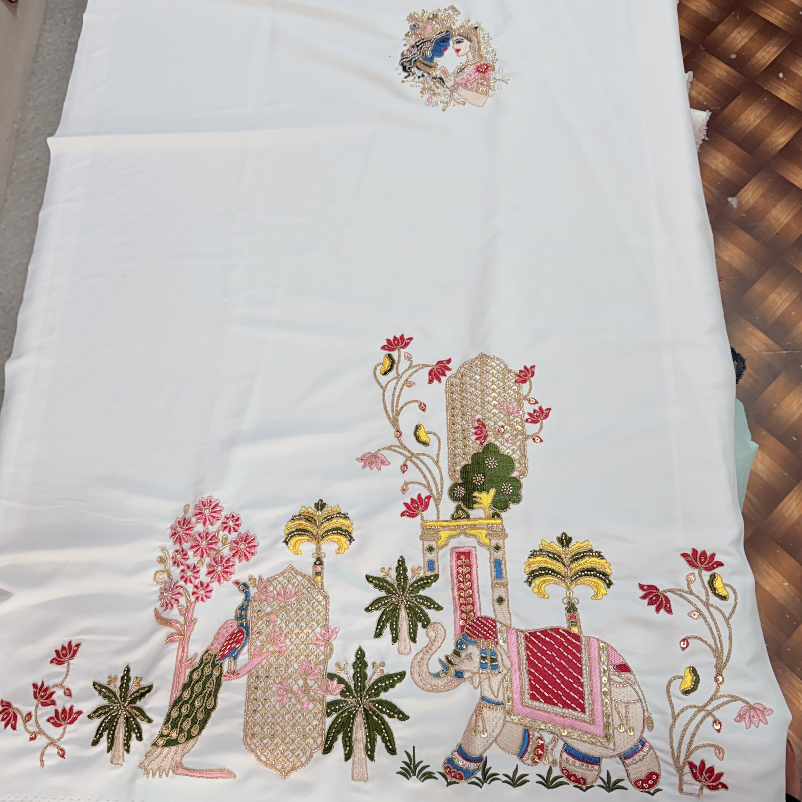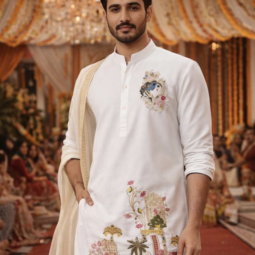 Experience divine elegance with our premium Armaani Lachka fabric kurta set, crafted especially for men who appreciate tradition with luxury 🤍🕉️. This pure white Armaani Lachka fabric features exquisite handworked cutdana embroidery, showcasing a beautiful Radha Krishna Ji motif on one side, symbolising devotion and grace 🌸🙏.