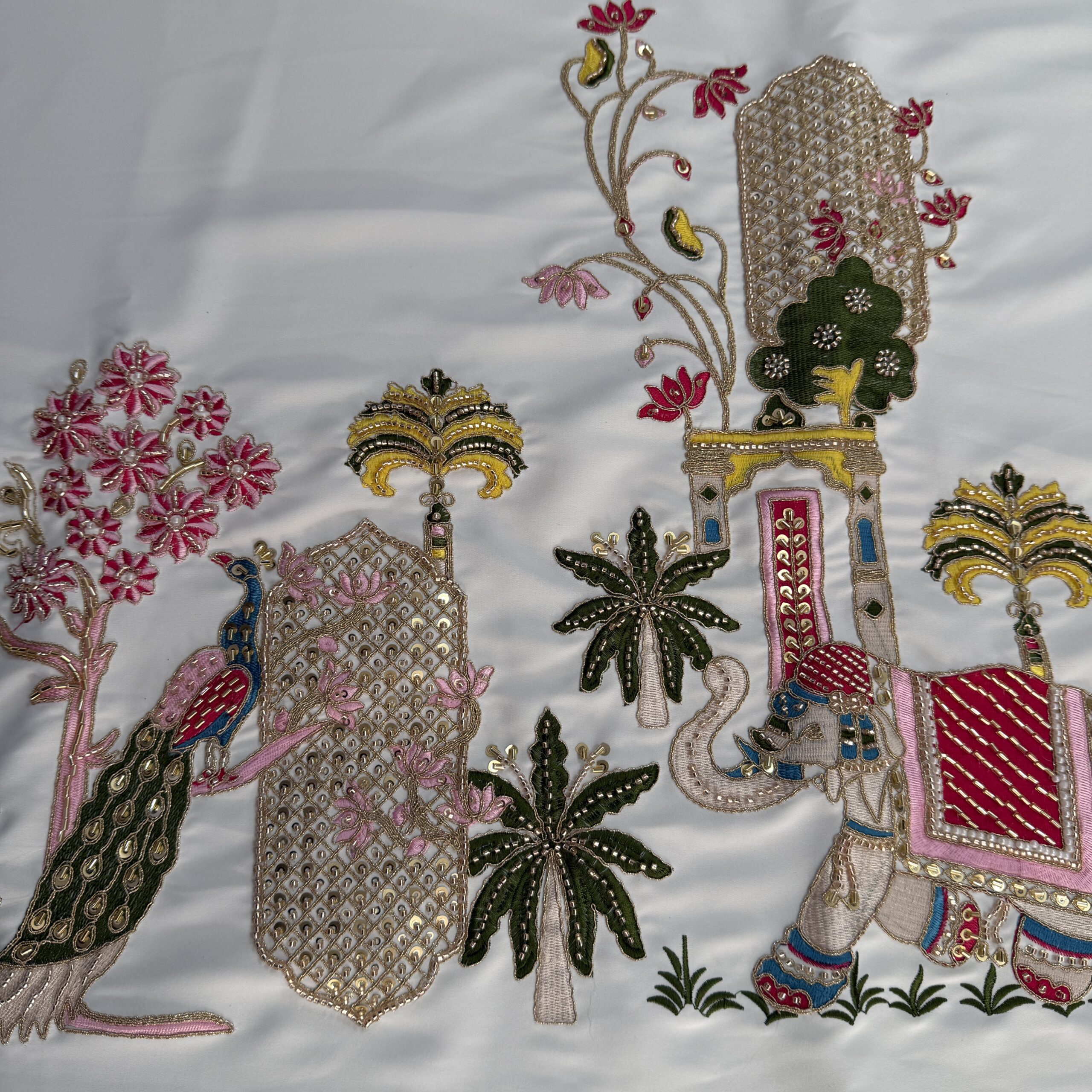 The design is further enhanced with a heavy panel embroidery featuring elephant, peacock, and traditional motifs, all intricately detailed with fine handwork that gives the outfit a rich, royal, and spiritual appeal 🐘🦚✨. The fabric has a smooth texture with a graceful fall, making it perfect for religious ceremonies, poojas, bhajans, weddings, festive occasions, and cultural functions.