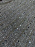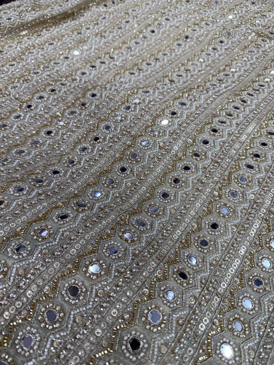 Make a grand style statement with this premium Pure Zari Tissue dyeable fabric, famously worn by Actor Ibrahim Khan, making it one of the most trending celebrity-inspired fabrics this wedding season 👑✨. Designed to impress, this fabric features an allover faux mirror lining pattern enhanced with heavy cutdana handwork and intricate beads work, giving it an ultra-luxurious, rich, and royal appearance 💎🧵.