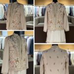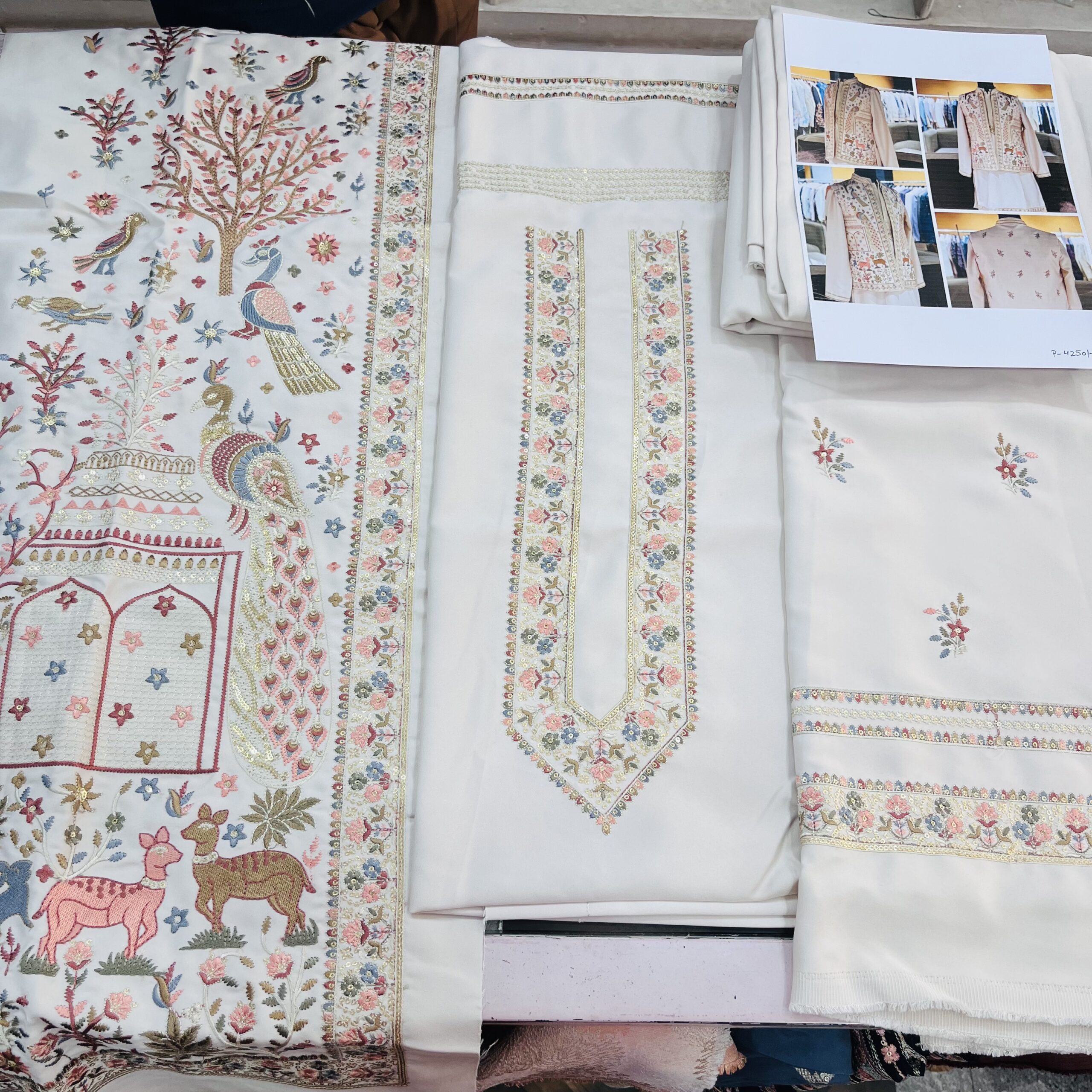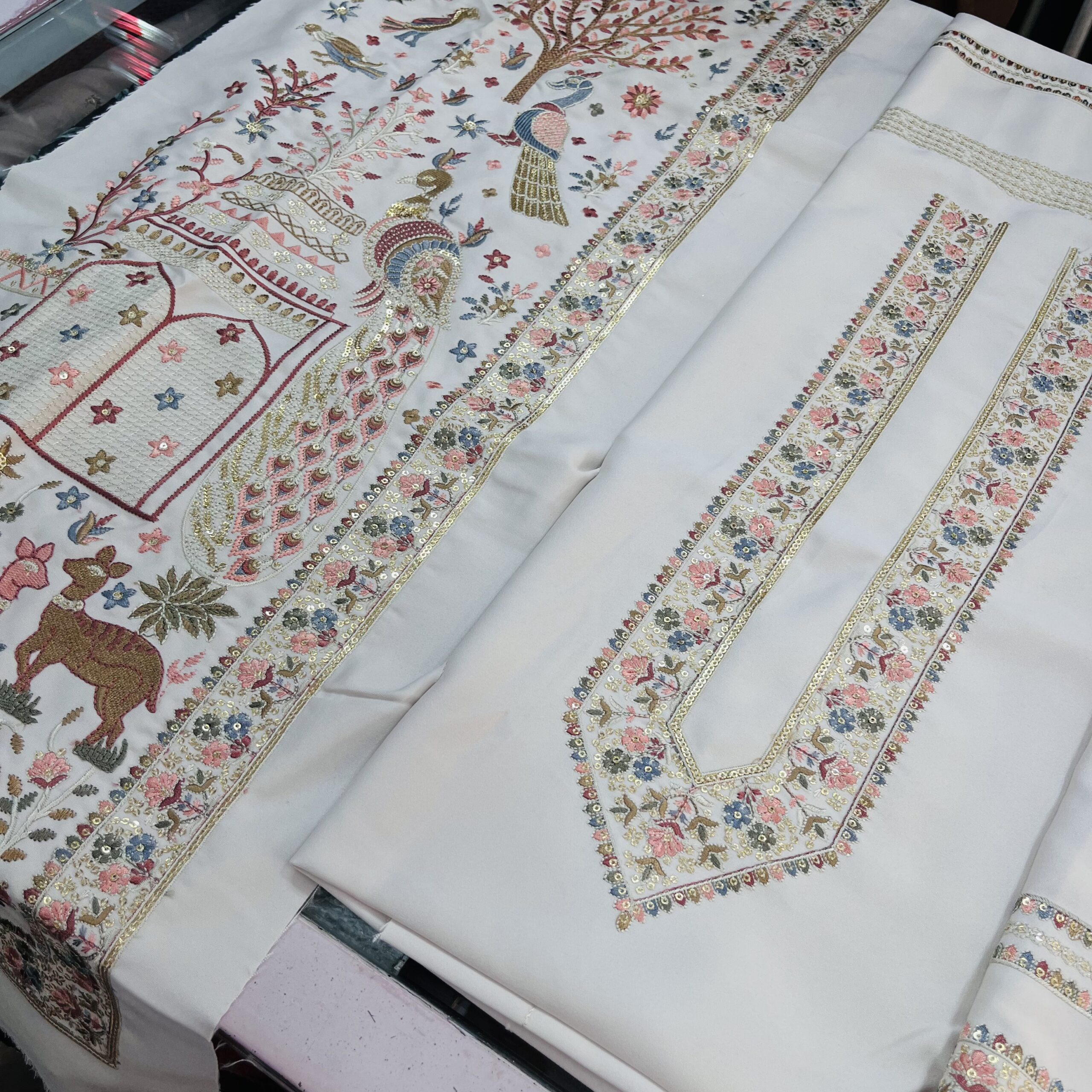 The set includes precut fabric for kurta, kothi, and a plain pant, ensuring ease of tailoring and a flawless fit. The kurta fabric features rich embroidery on the neckline and sleeves, while the kothi stands out with heavy allover embroidery showcasing floral, peacock, and leaf motifs. The back of the kothi is beautifully finished with delicate allover butti work, adding depth and sophistication to the overall design.
