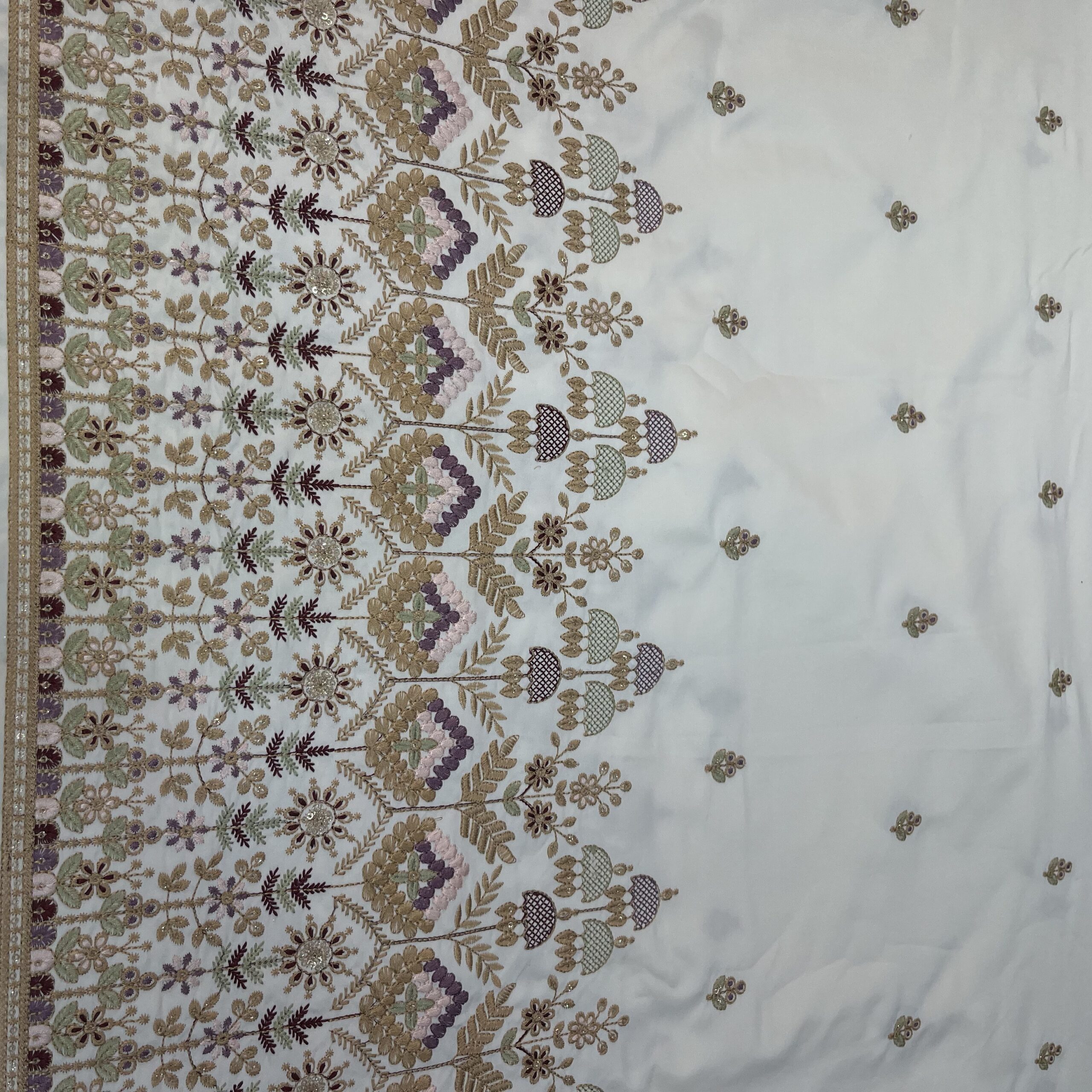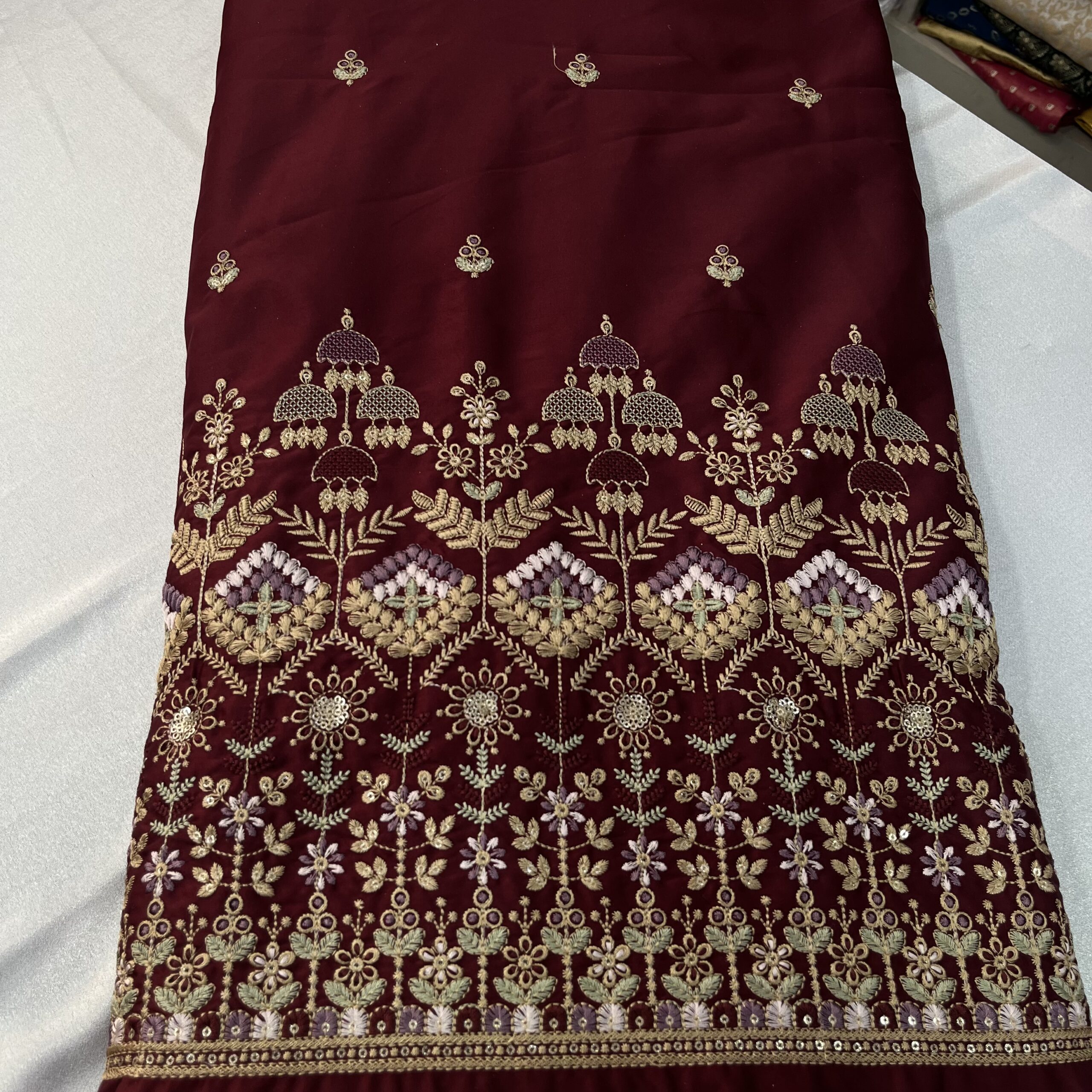 Upgrade your festive and wedding designs with our premium Malai satin fabric, available in elegant off-white and rich wine colors 🍷🤍. This fabric features heavy panel embroidery combined with allover small butti work, highlighted with beautiful multicolor thread embroidery that adds depth, richness, and a luxurious designer feel.