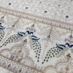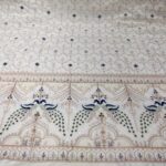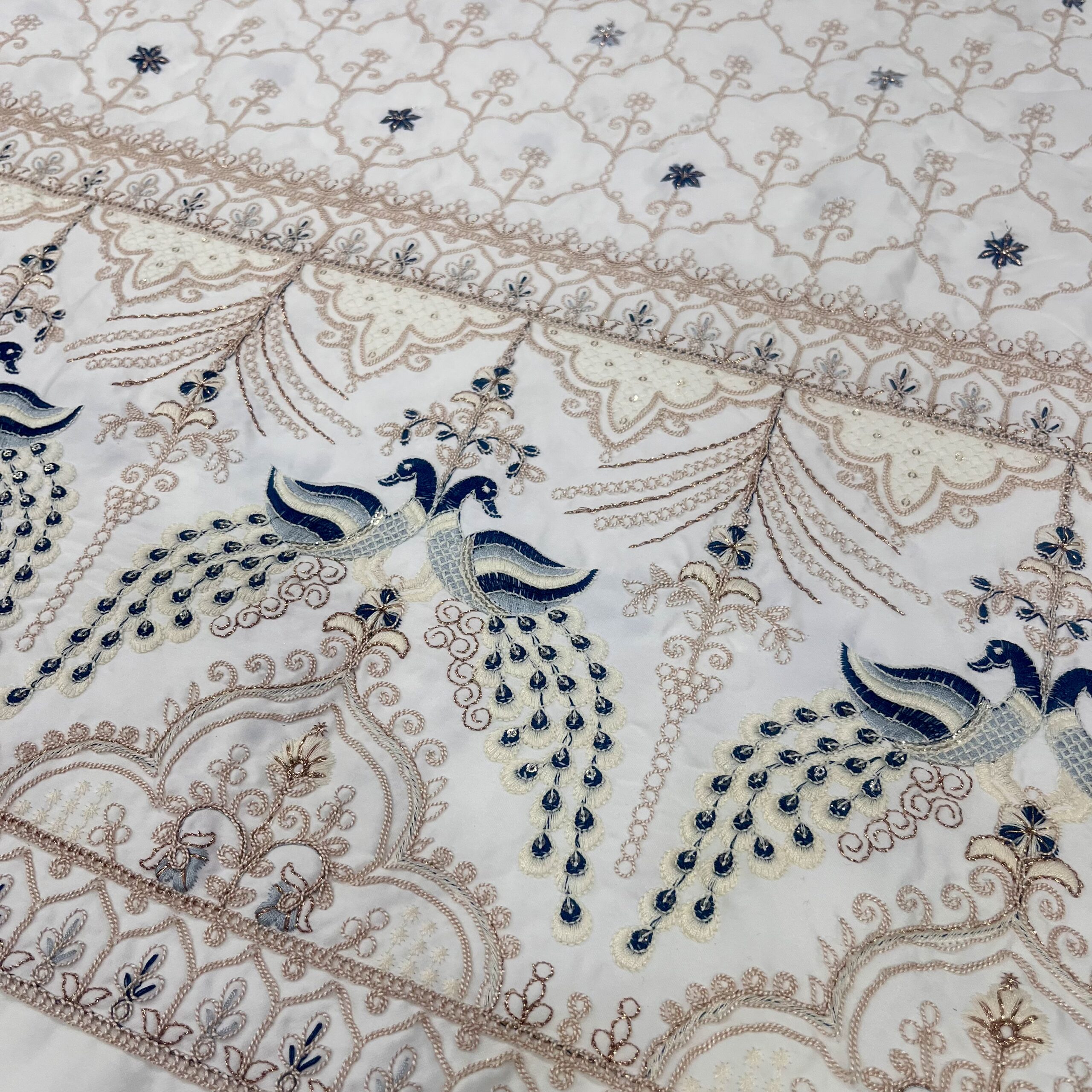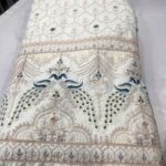 Add a royal charm to your look with our premium Malai Satin Fabric in elegant off-white color, beautifully adorned with heavy zardosi embroidery and intricate blue peacock panel design. The fabric features exquisite blue thread and embroidery work all over, giving it a luxurious and majestic finish ideal for wedding and festive wear.