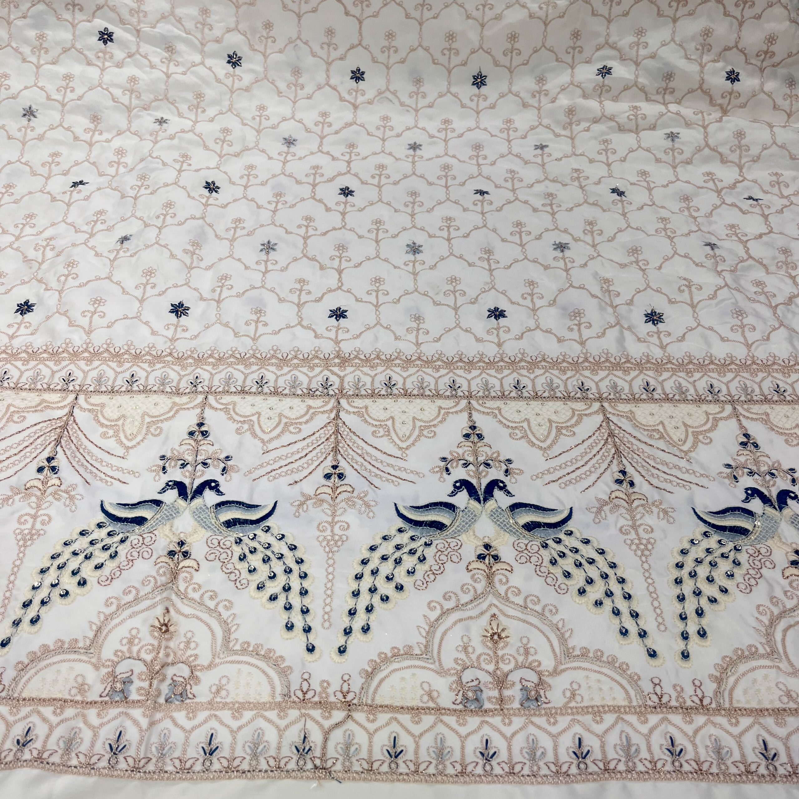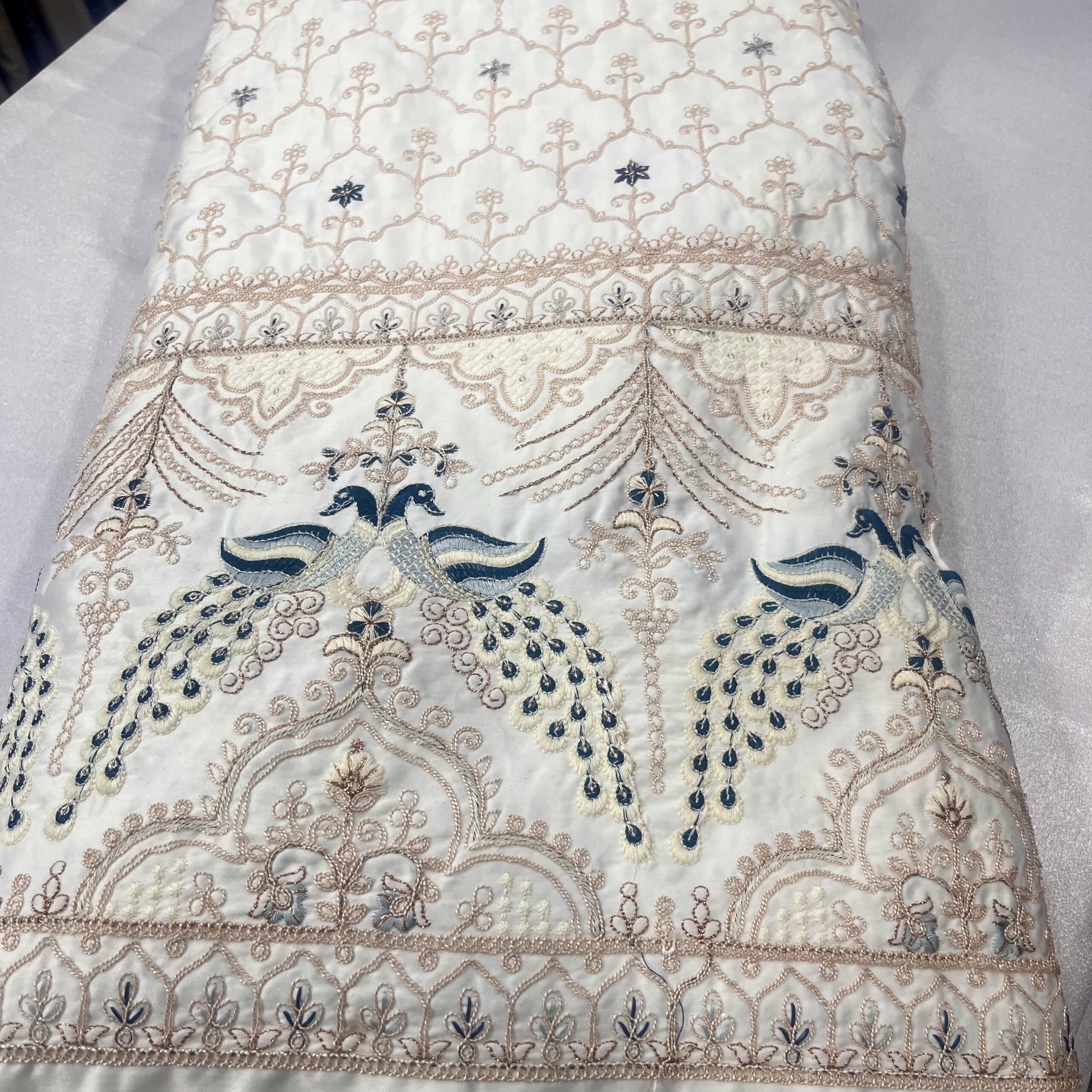 Malai Satin Fabric with Heavy Zardosi & Blue Peacock Panel Design – Perfect for Wedding Sherwanis & Groom Wear