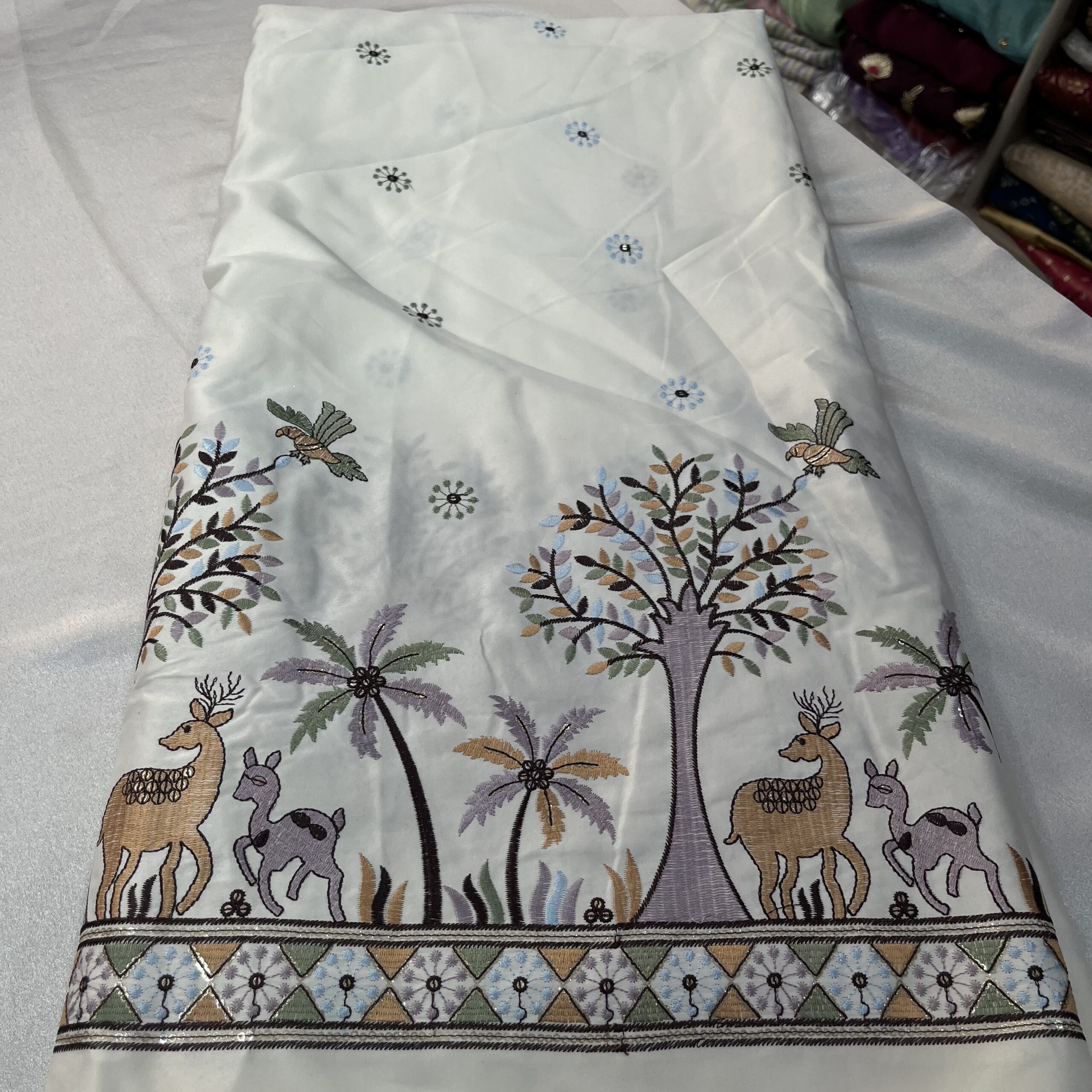 ✨ Malai Satin Fabric with Panel Embroidery – Deer & Tree Design | Elegant & Affordable ✨