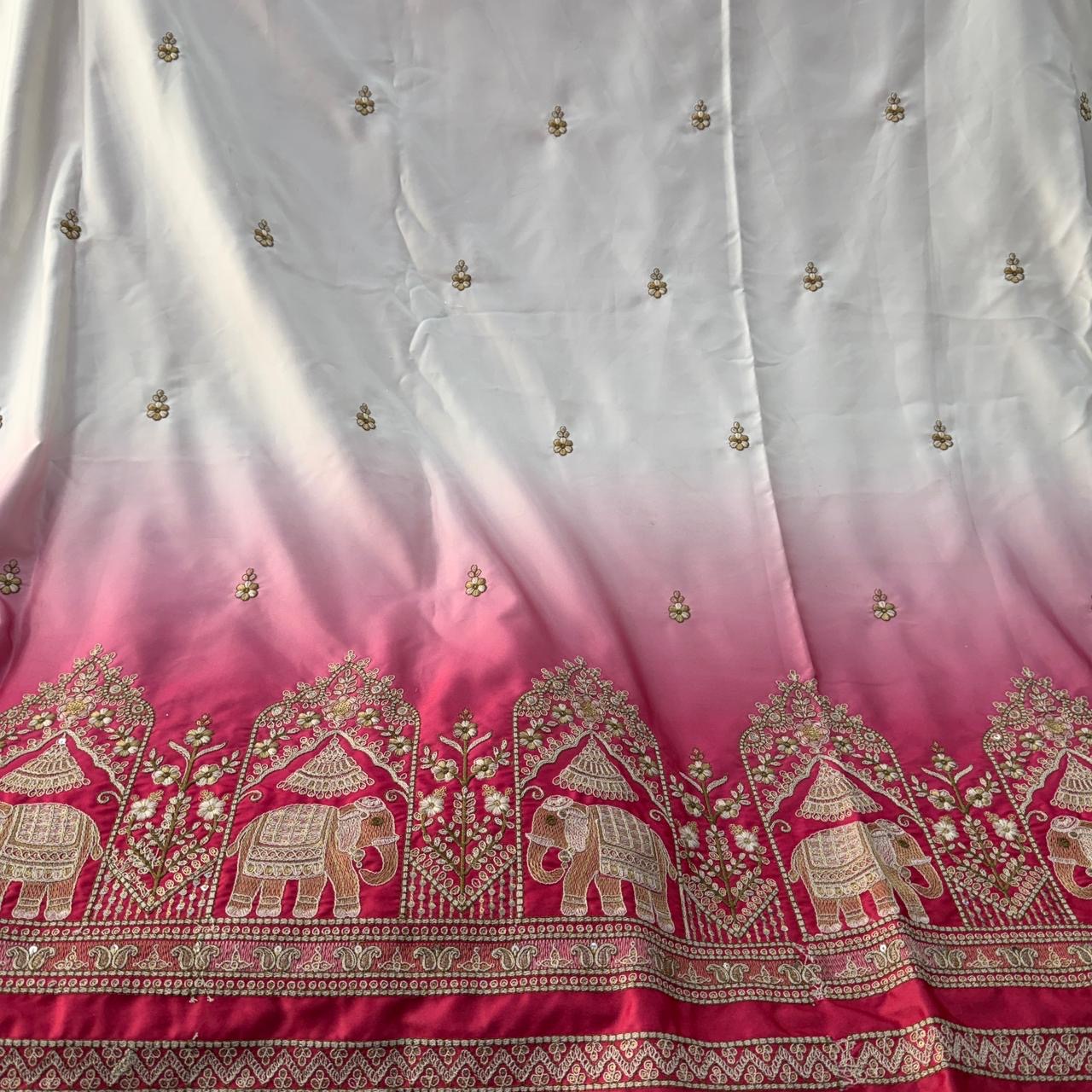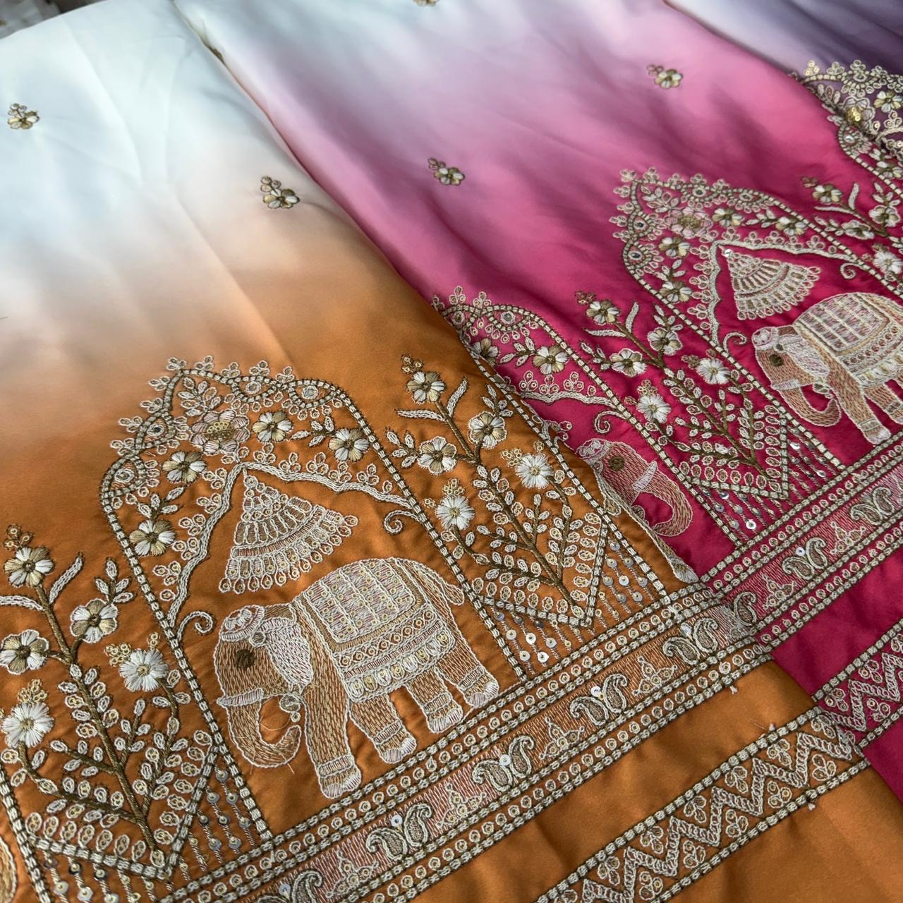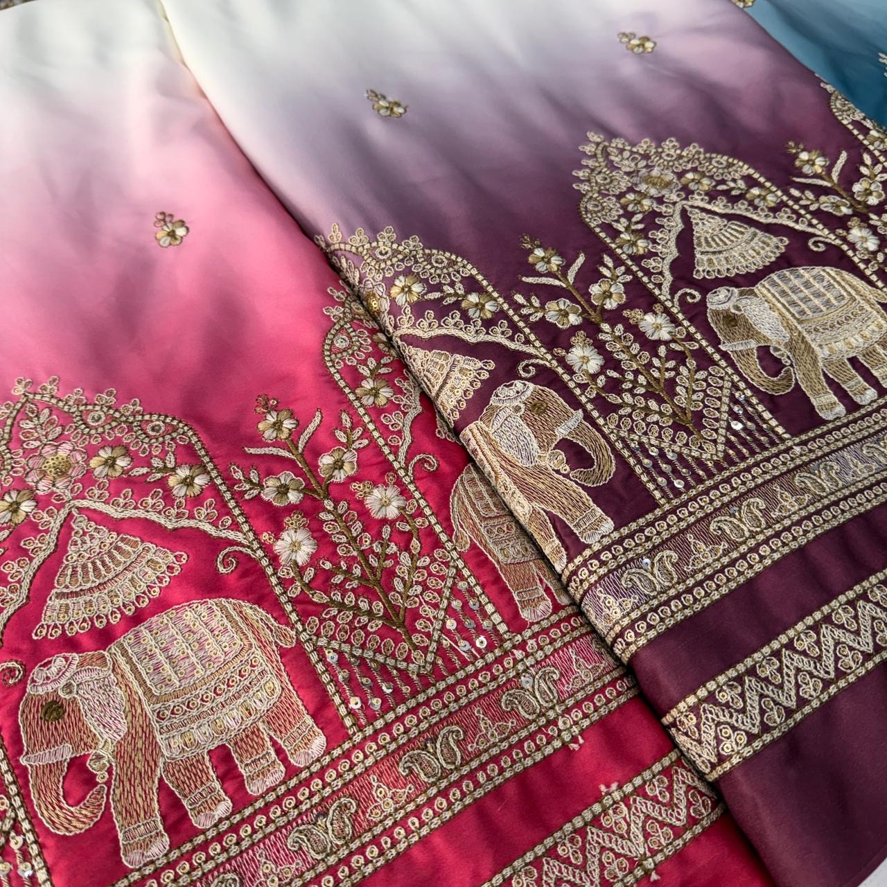 Malai Satin Ombre Shade Fabric with Heavy Panel Embroidery – Premium Designer Fabric for Wedding & Festive Wear