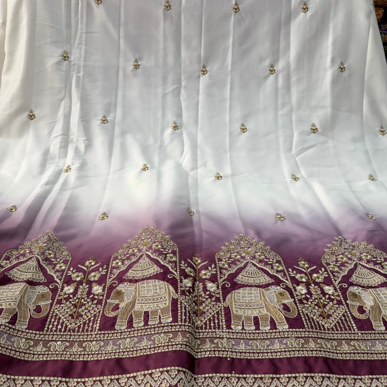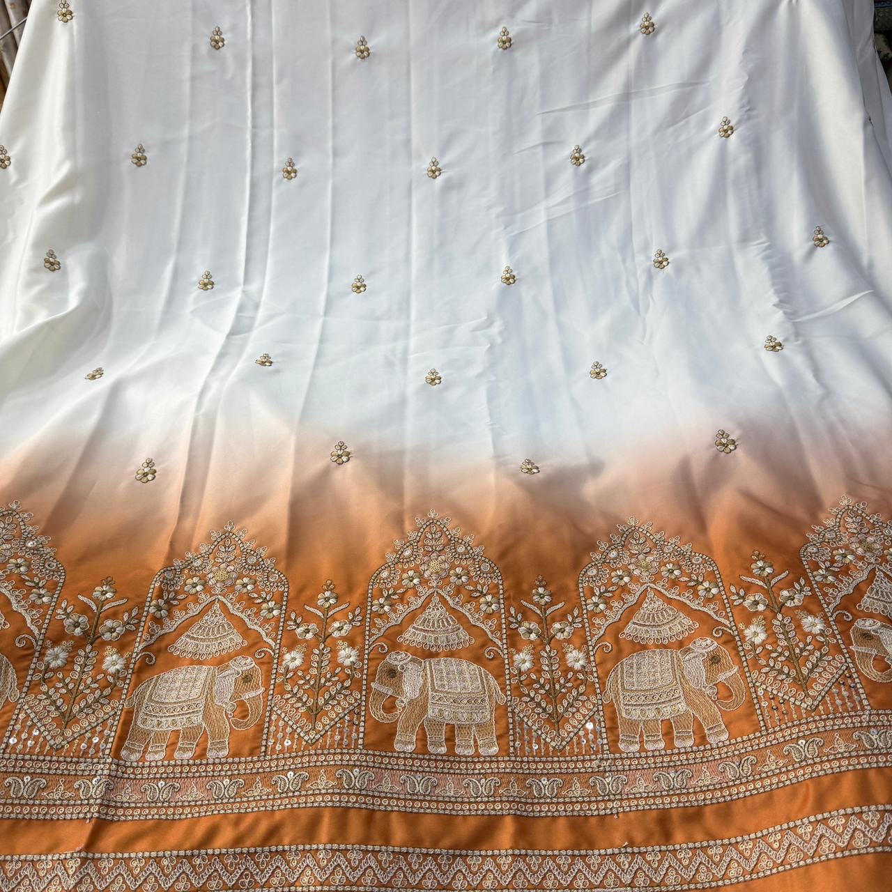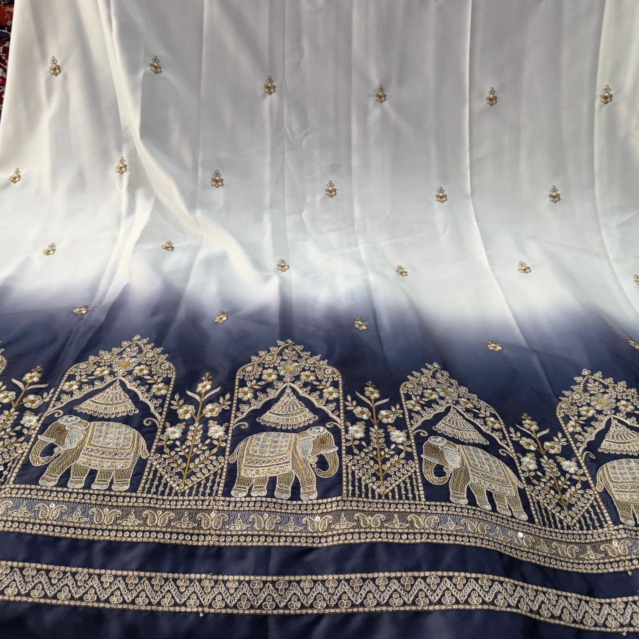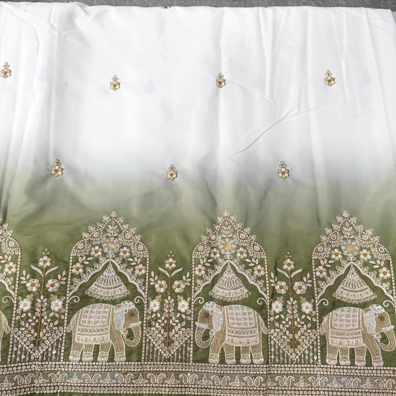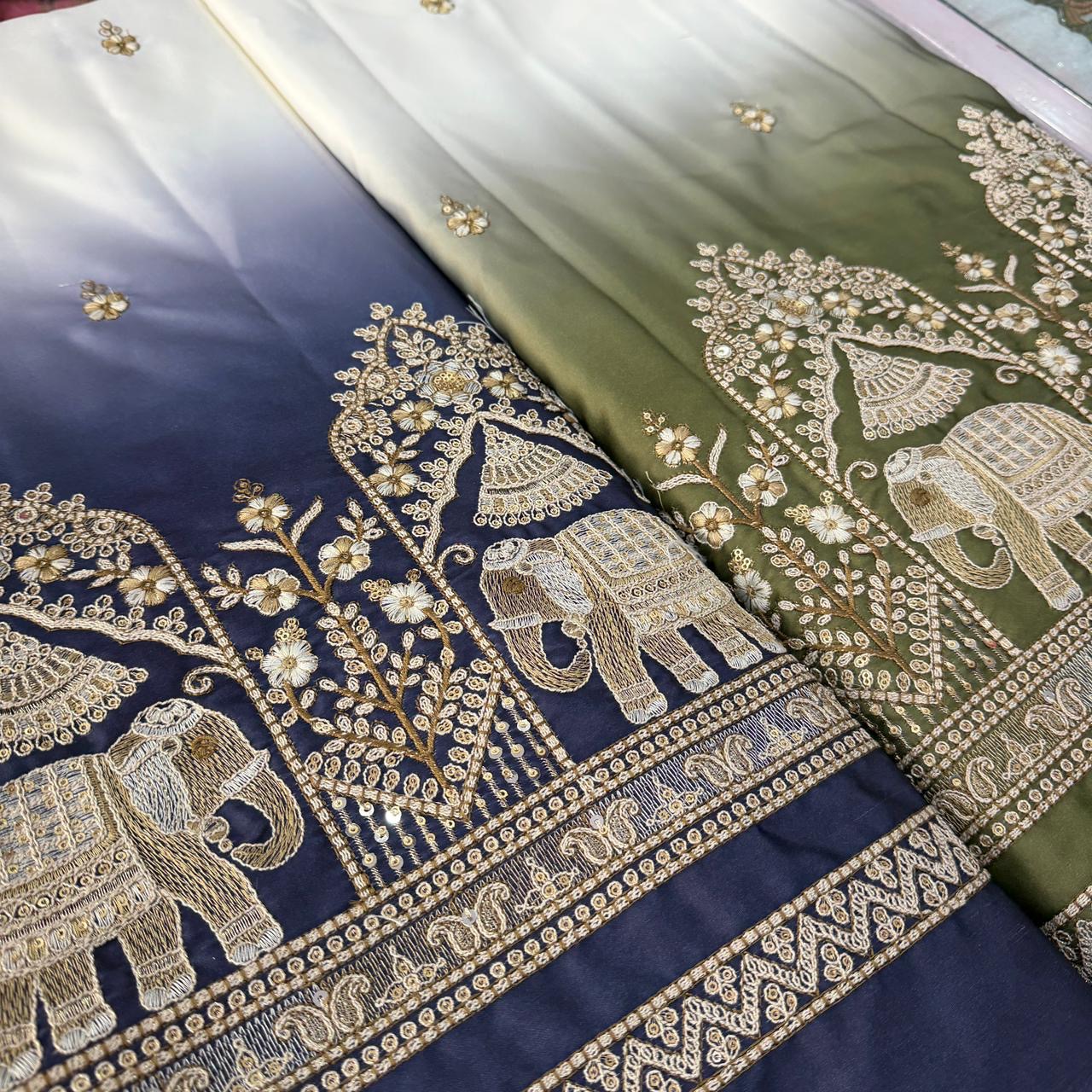✨🐘 Malai Satin Ombre Shade Fabric with Heavy Panel Embroidery – Premium Designer Fabric for Wedding & Festive Wear 🐘✨