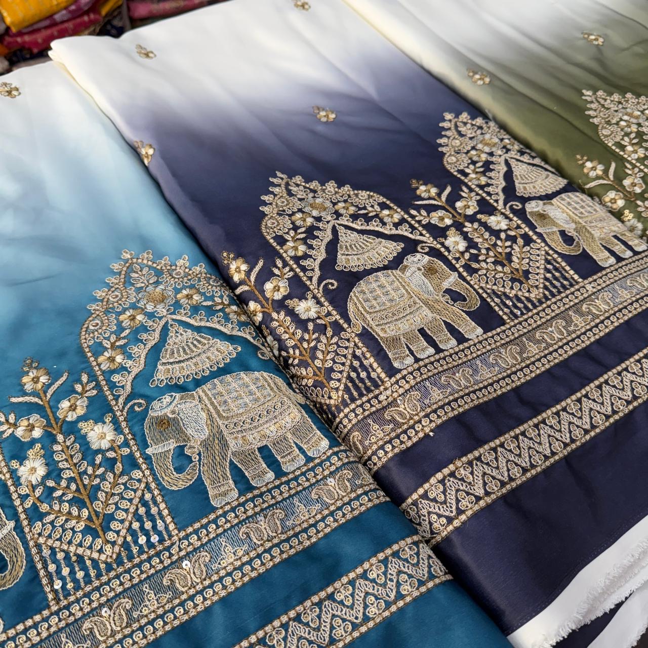 Upgrade your festive and wedding creations with this luxurious Malai Satin fabric available in 6 stunning ombre shade colors 🌈💫. Designed with heavy panel embroidery featuring royal elephant motifs and enhanced with small butti work all over the fabric, this fabric delivers a rich, classy and designer look 👑✨