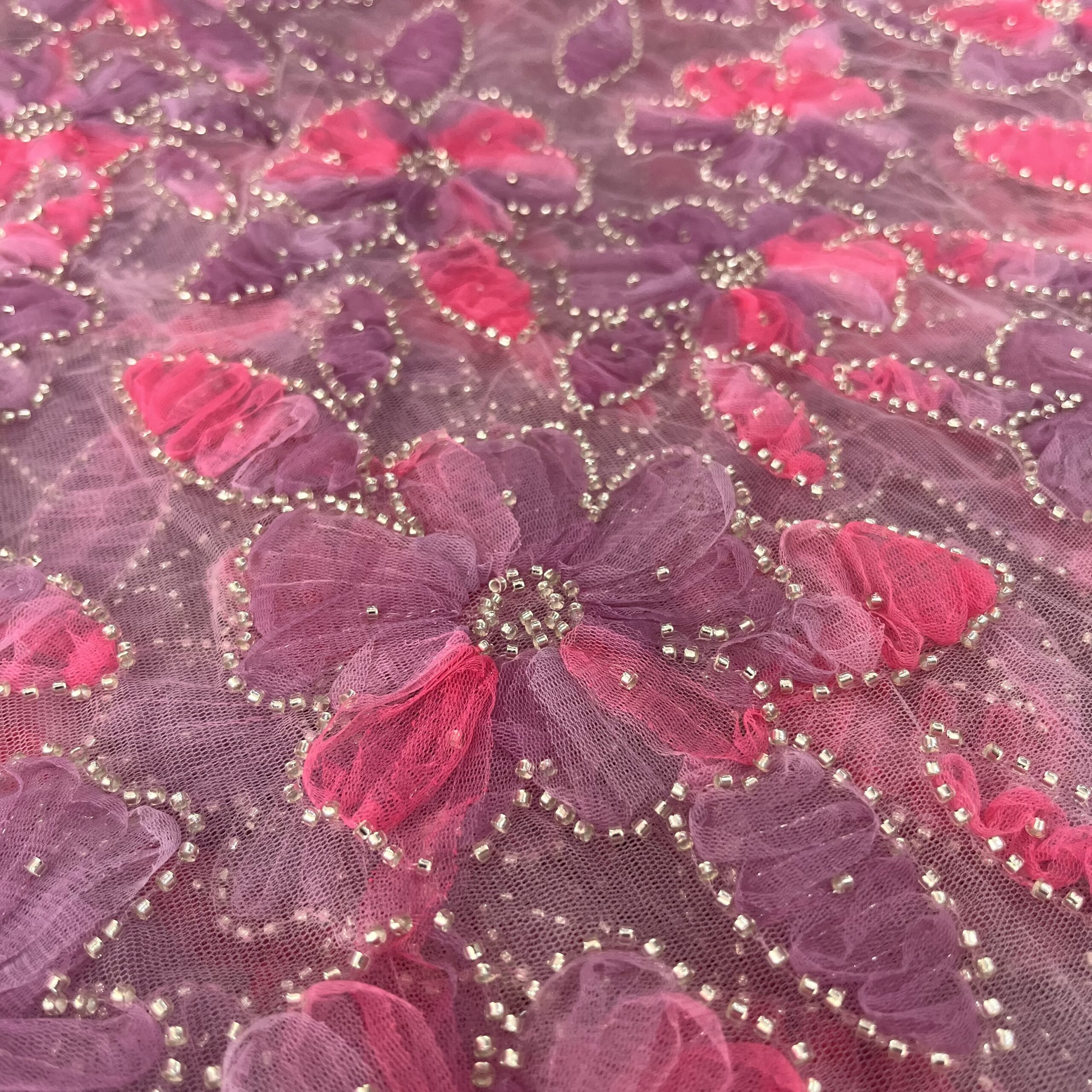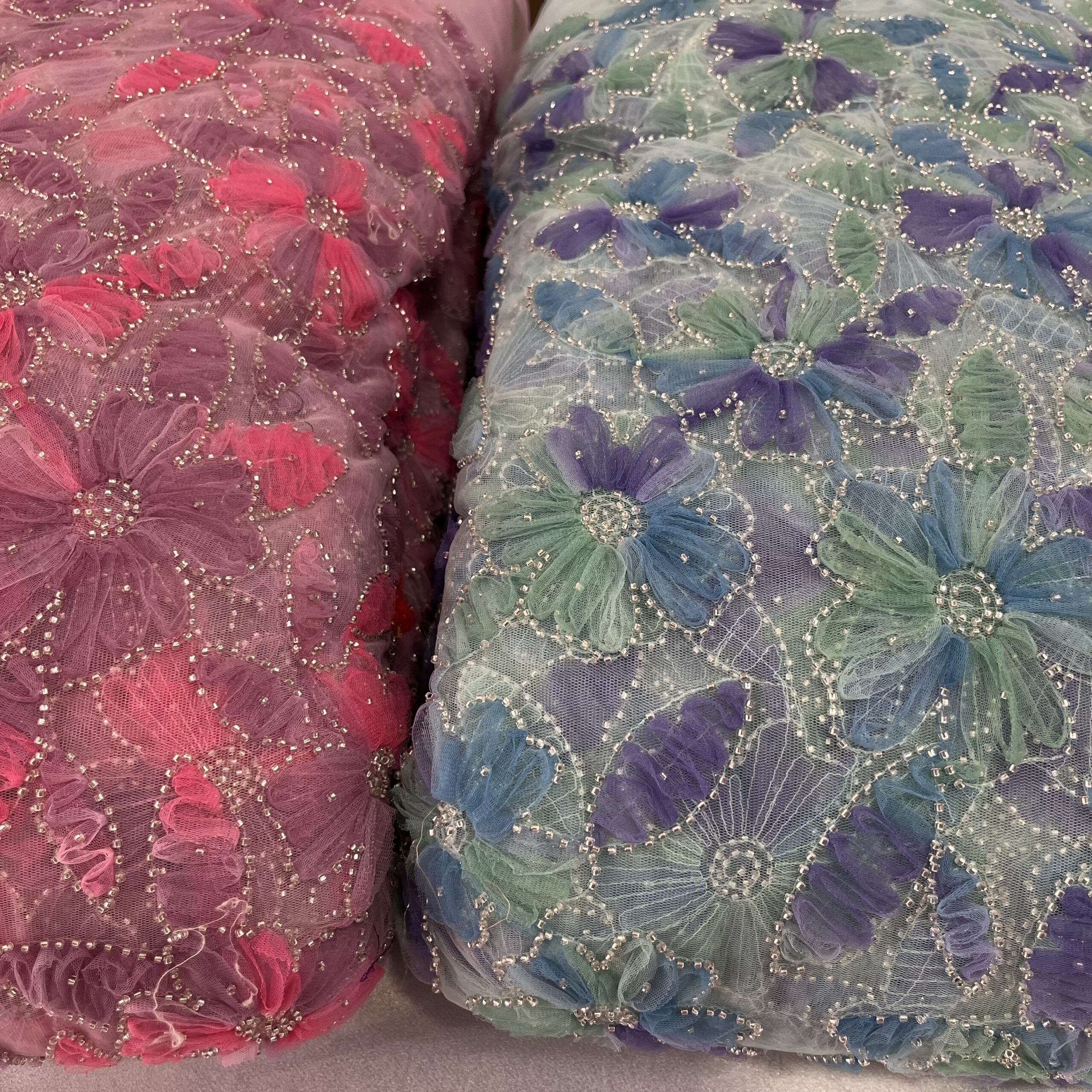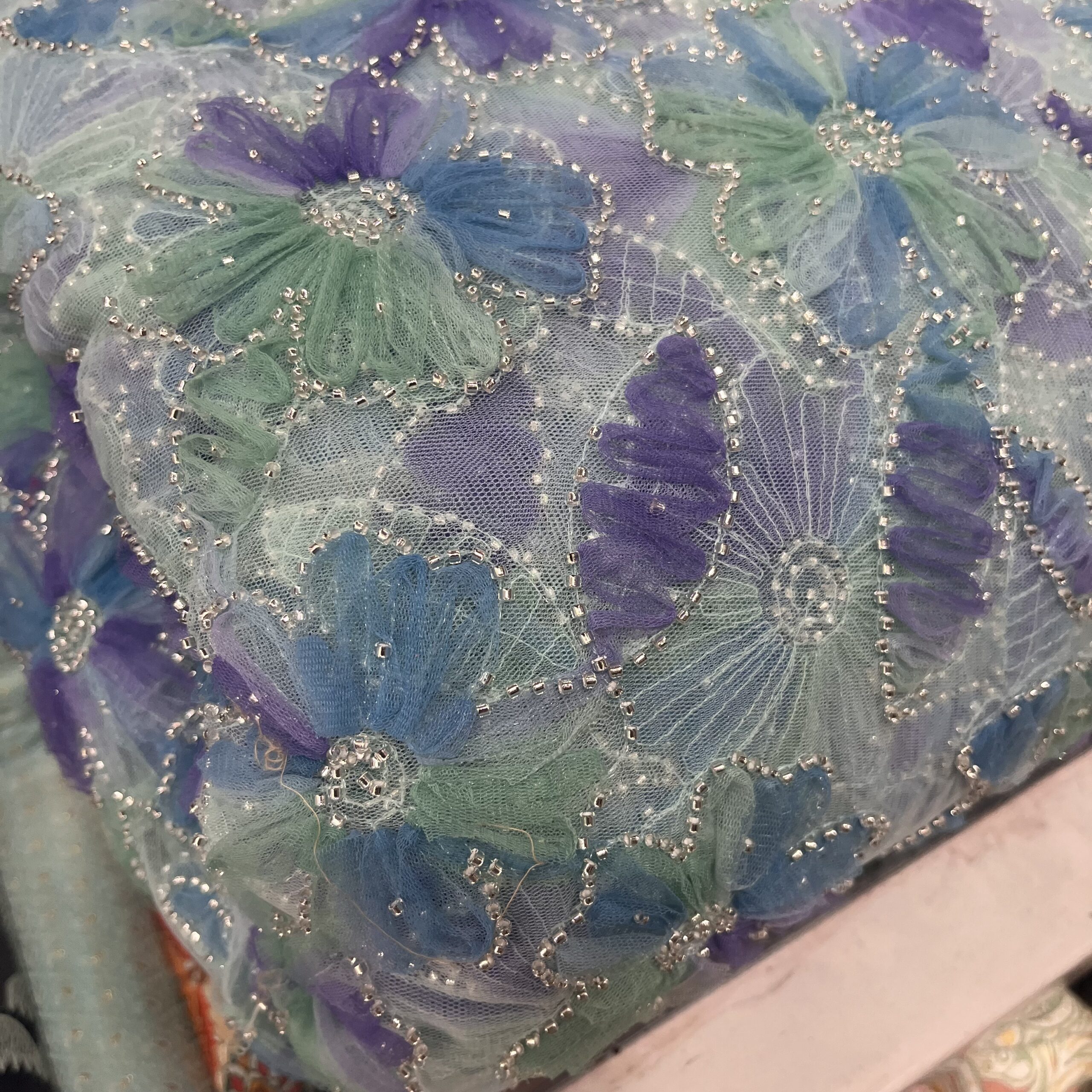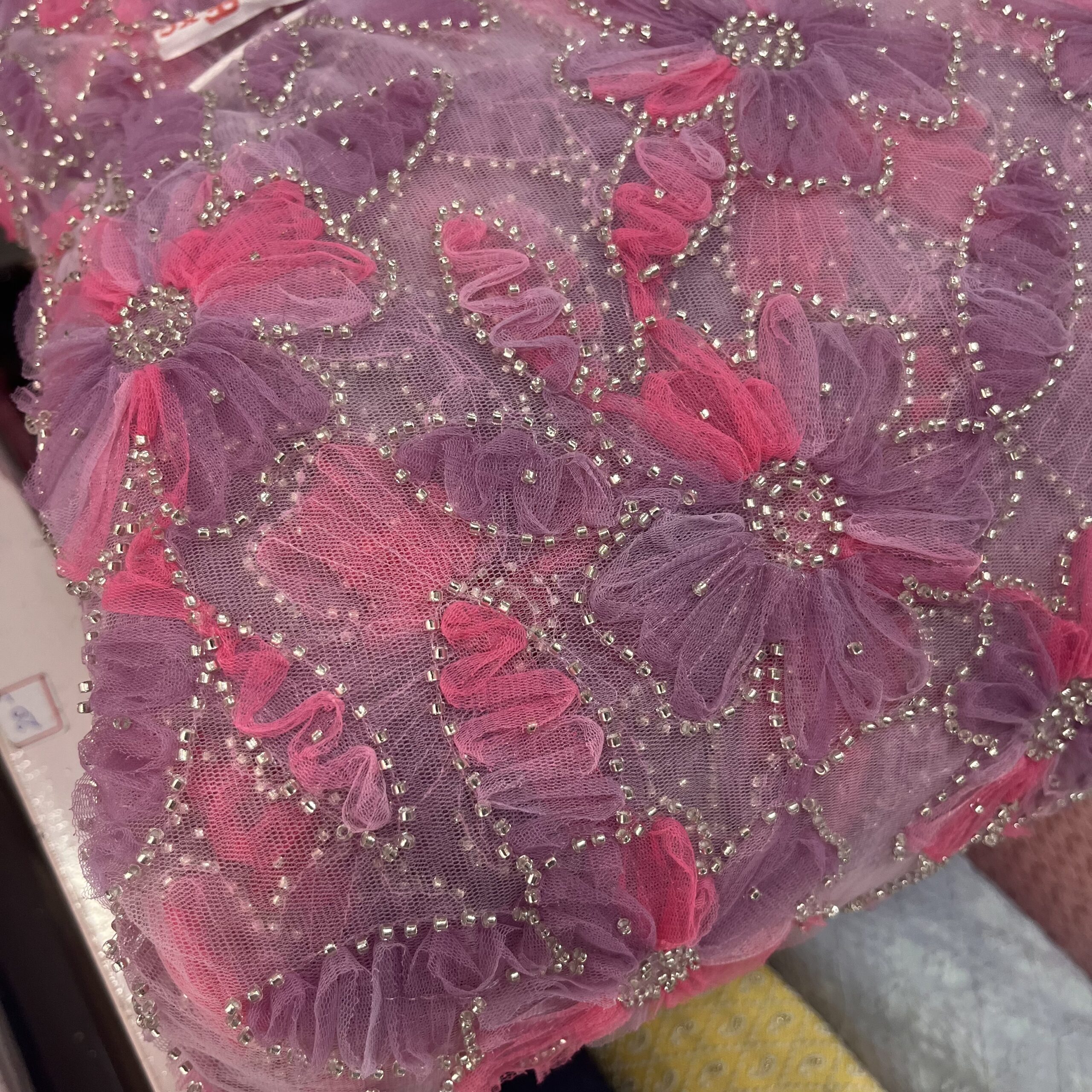 Experience luxury with our premium Net Fabric featuring heavy applique floral work and sparkling Cutdana bead detailing, available in 2 stunning multicolor shades with blue and pink base colors. This trending fabric is perfect for creating heavy ball gowns, sangeet night dresses, lehengas, and designer party outfits, blending modern elegance with timeless charm.