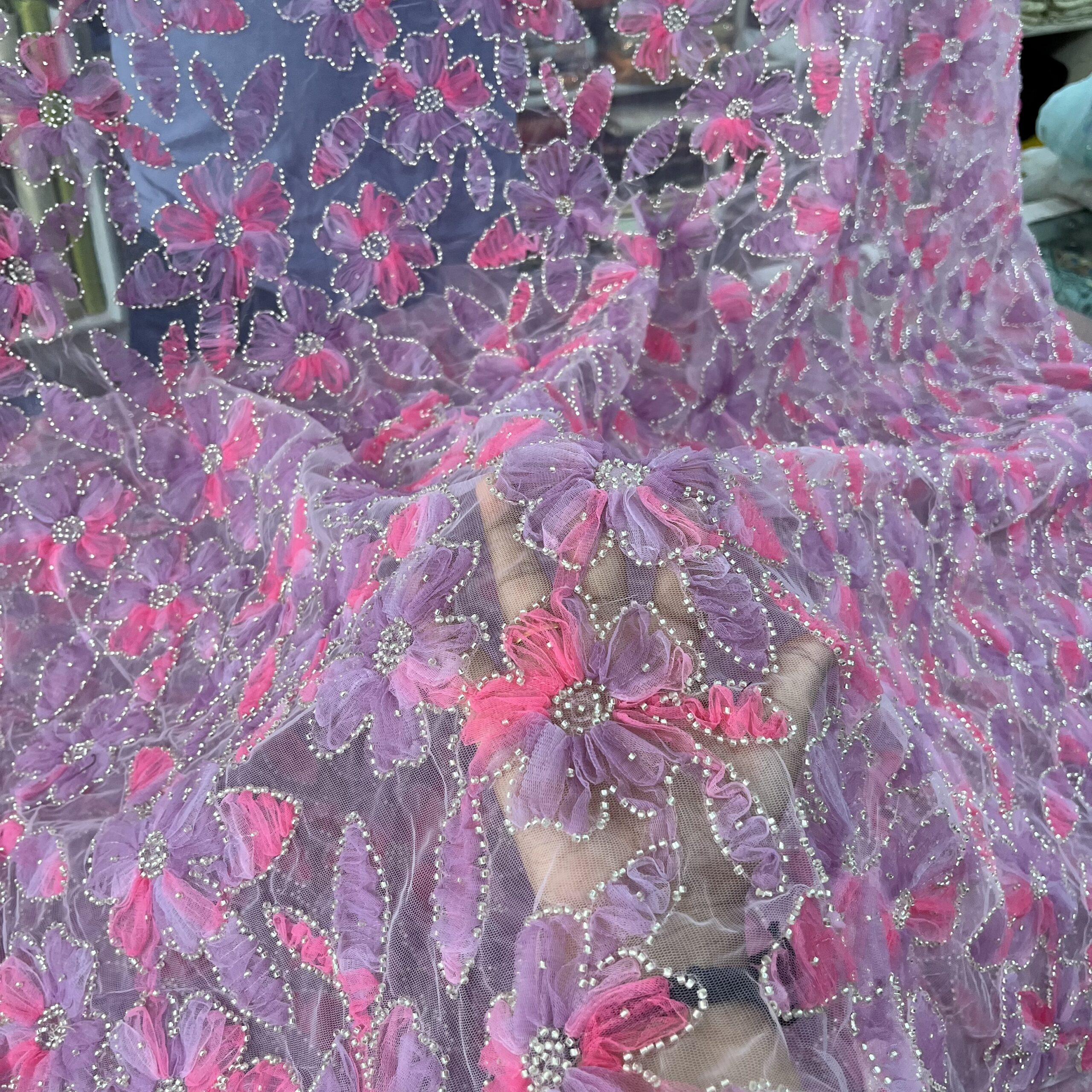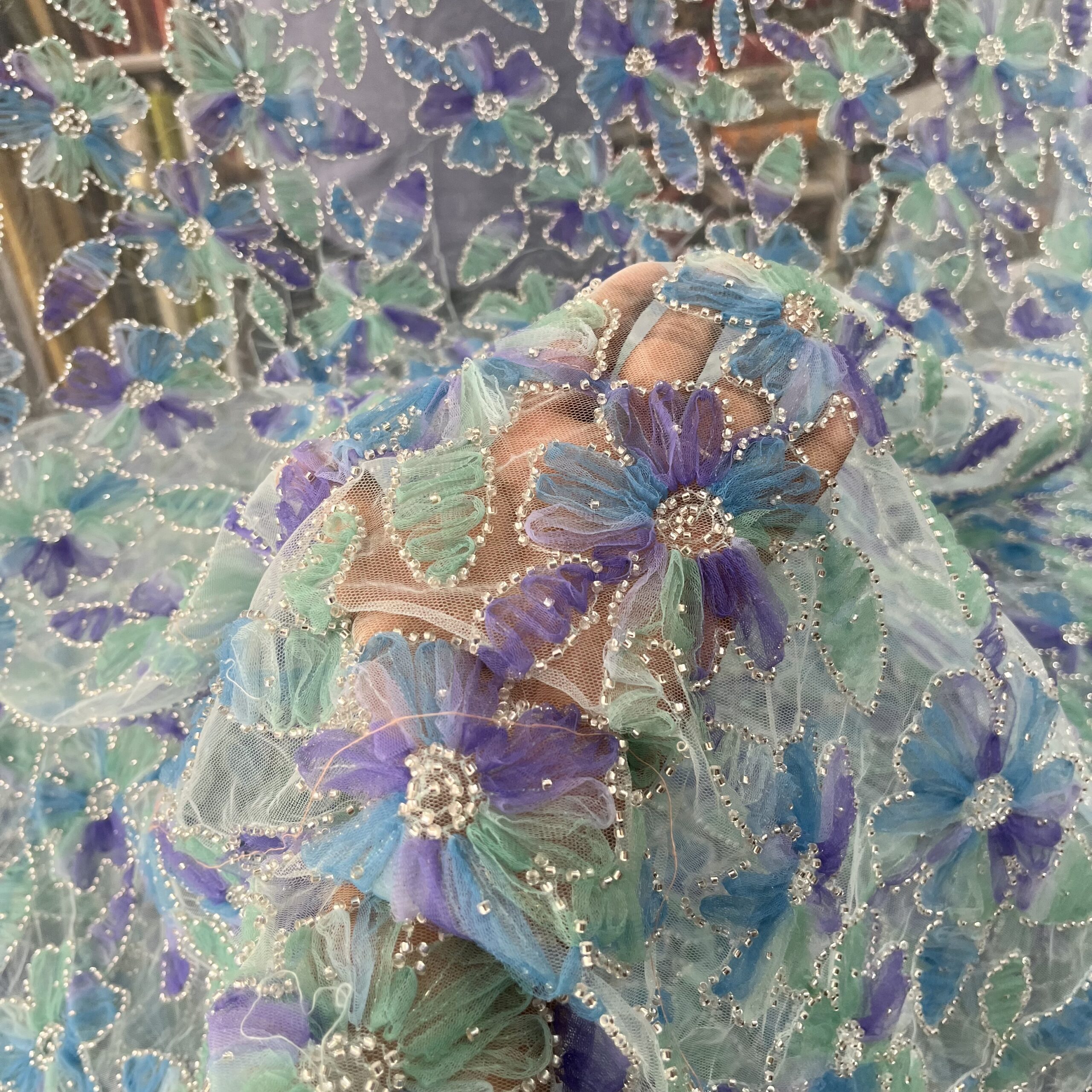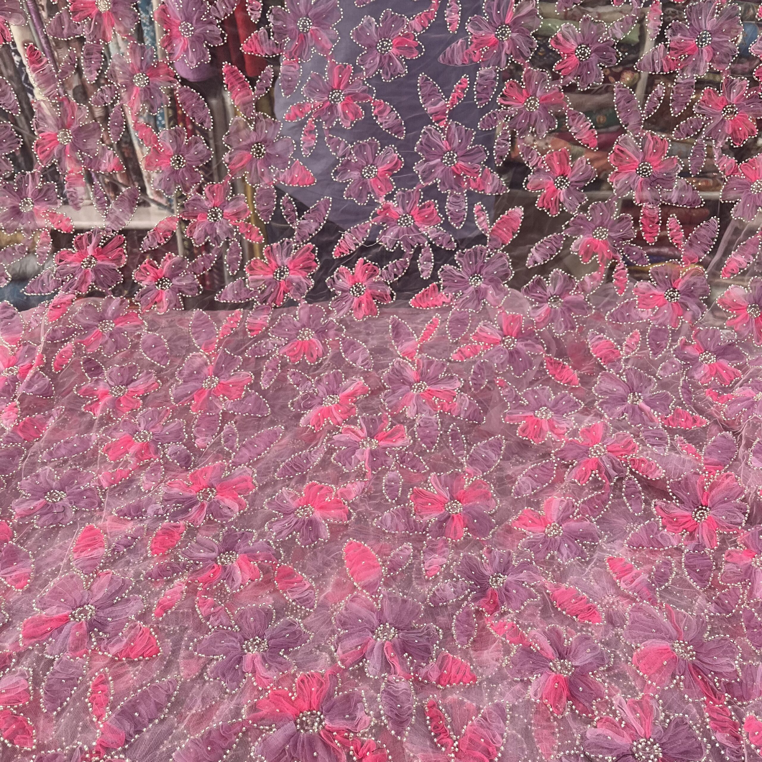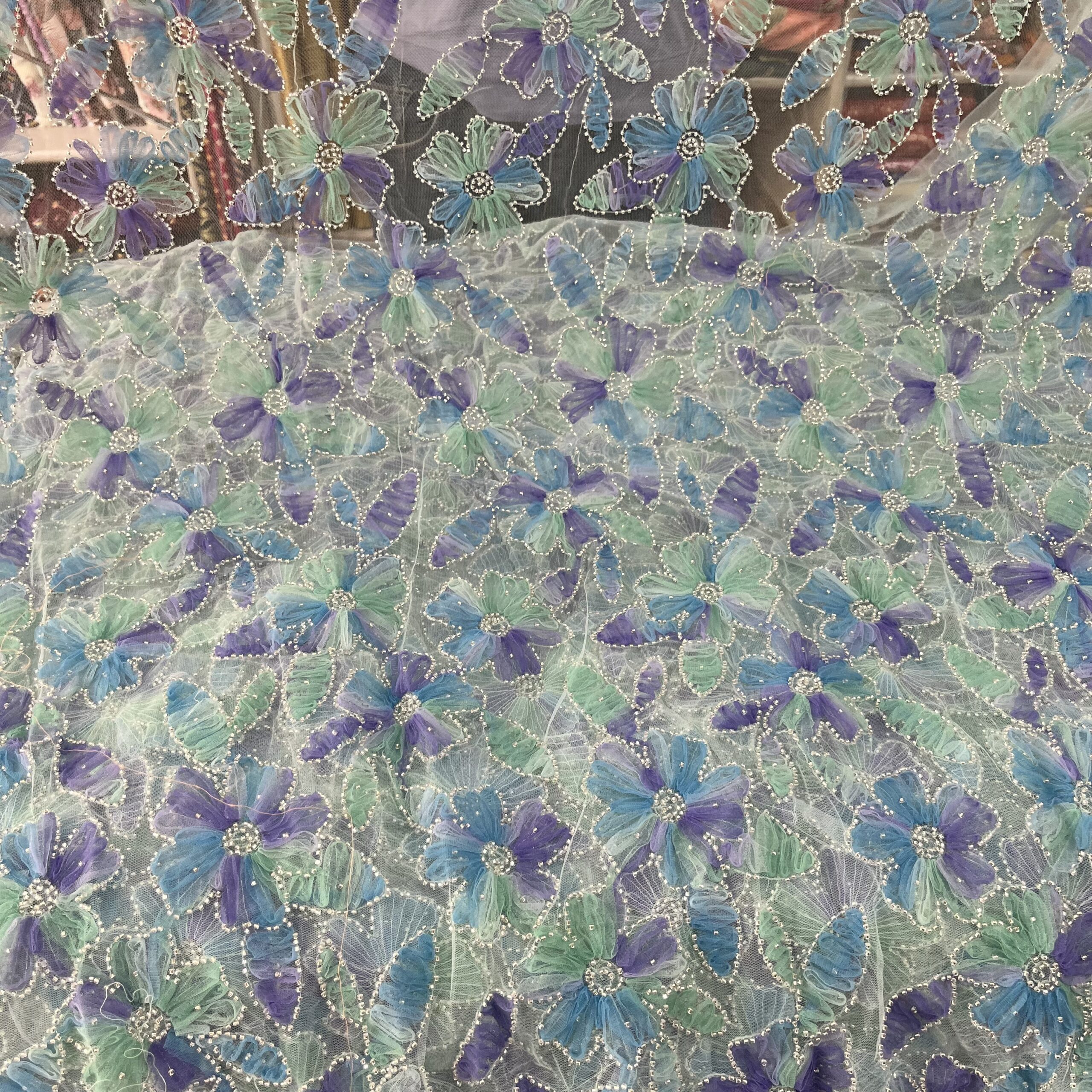 Experience luxury with our premium Net Fabric featuring heavy applique floral work and sparkling Cutdana bead detailing, available in 2 stunning multicolor shades with blue and pink base colors. This trending fabric is perfect for creating heavy ball gowns, sangeet night dresses, lehengas, and designer party outfits, blending modern elegance with timeless charm.