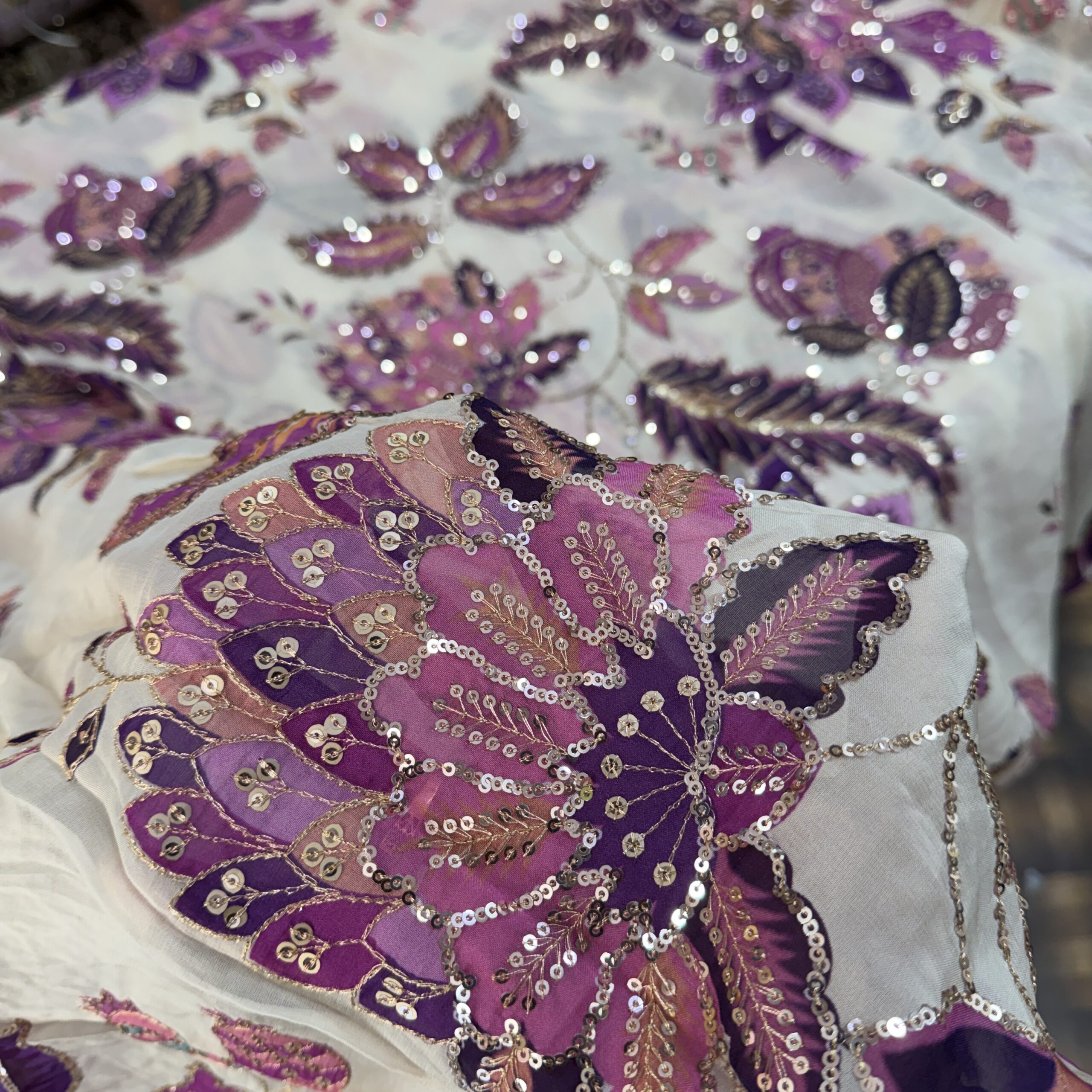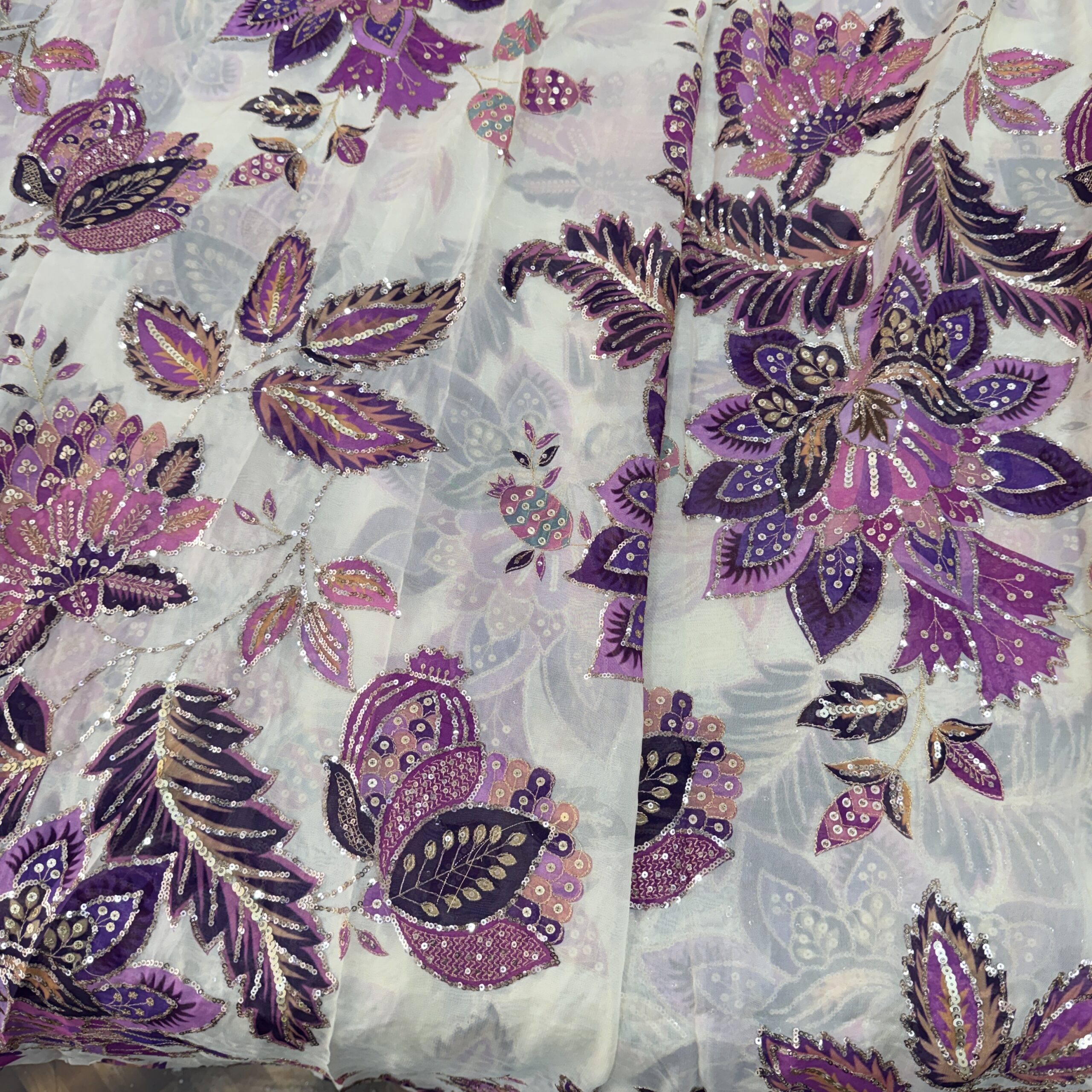 Step into designer elegance with this premium viscose organza fabric featuring a off white base with stunning lavender floral embroidery, beautifully enhanced with sequins and intricate thread work 💙✨. Inspired by high-end couture aesthetics, this fabric reflects a graceful, dreamy and luxurious appeal perfect for modern ethnic wear.