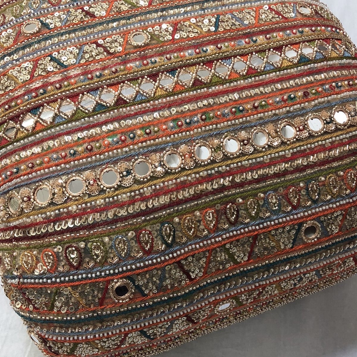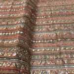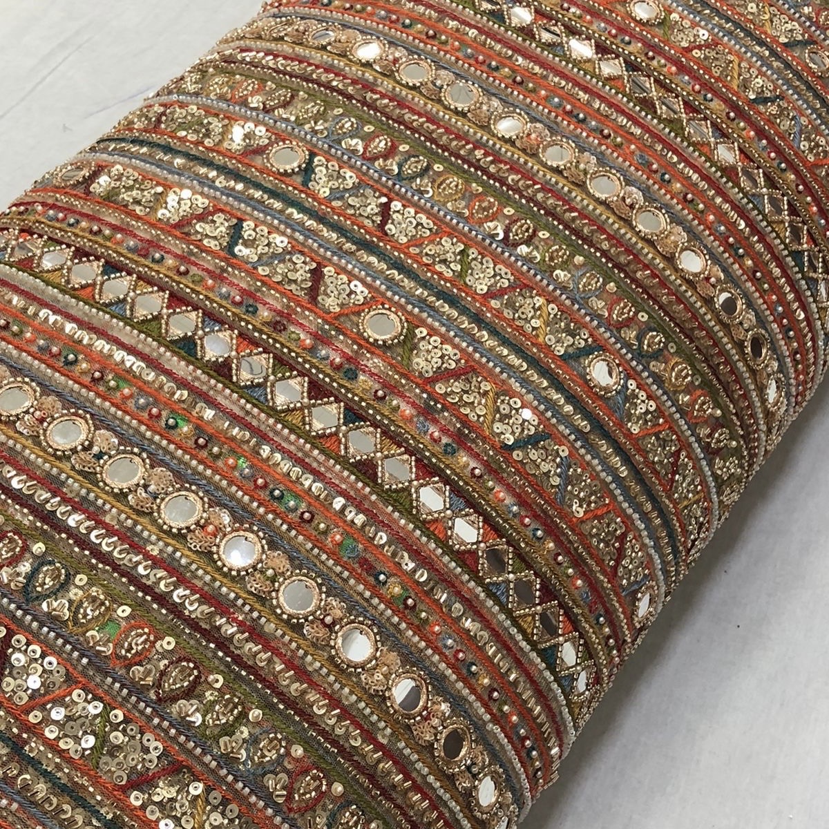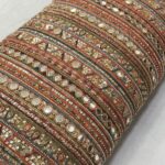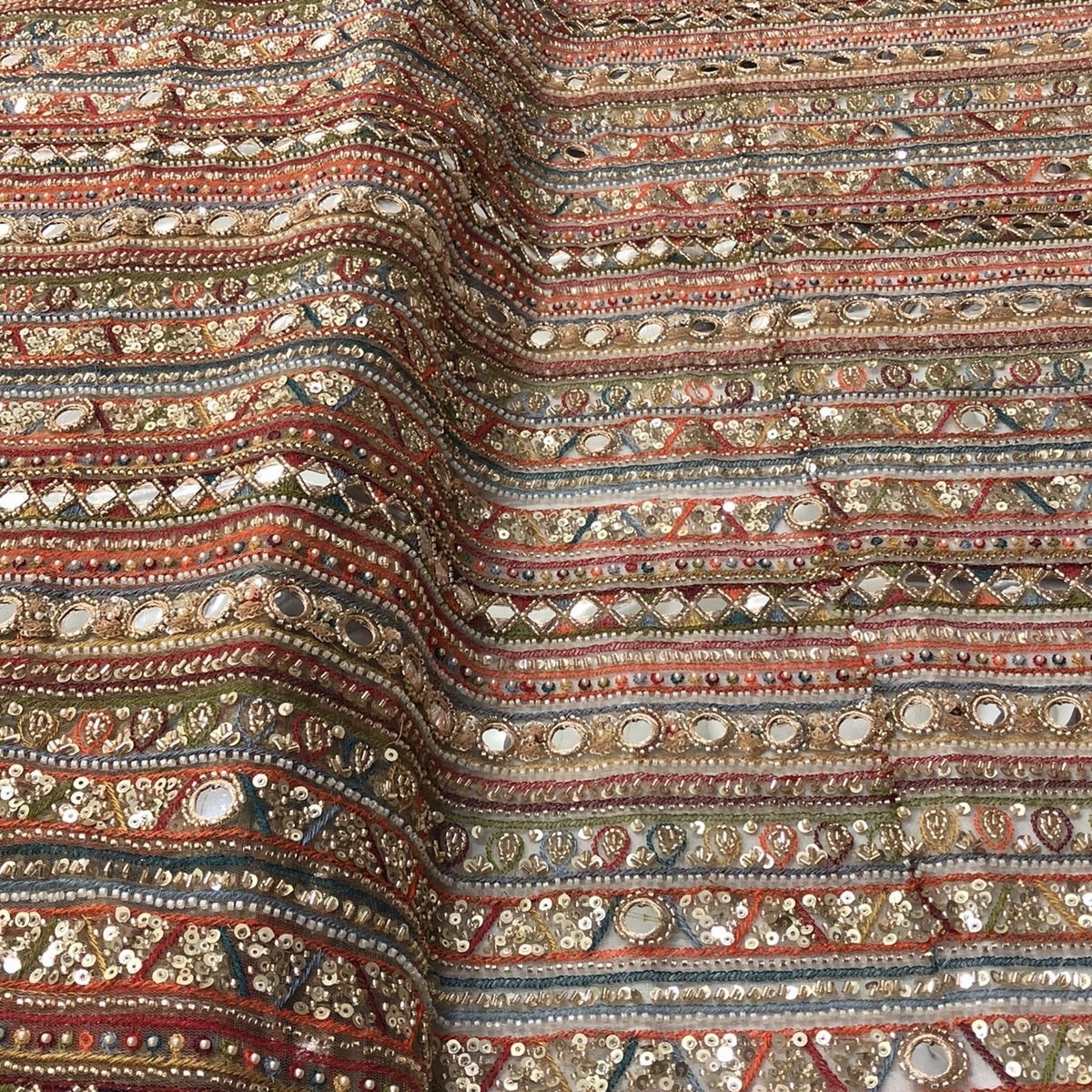 Elevate your wedding and festive creations with this luxurious designer net fabric, featuring rich allover lining embroidery inspired by traditional craftsmanship 🌸✨. As visible in the fabric, it is beautifully adorned with faux mirror work, sequins, beads, and intricate handwork, enhanced with vibrant multicolor thread embroidery arranged in elegant horizontal patterns.