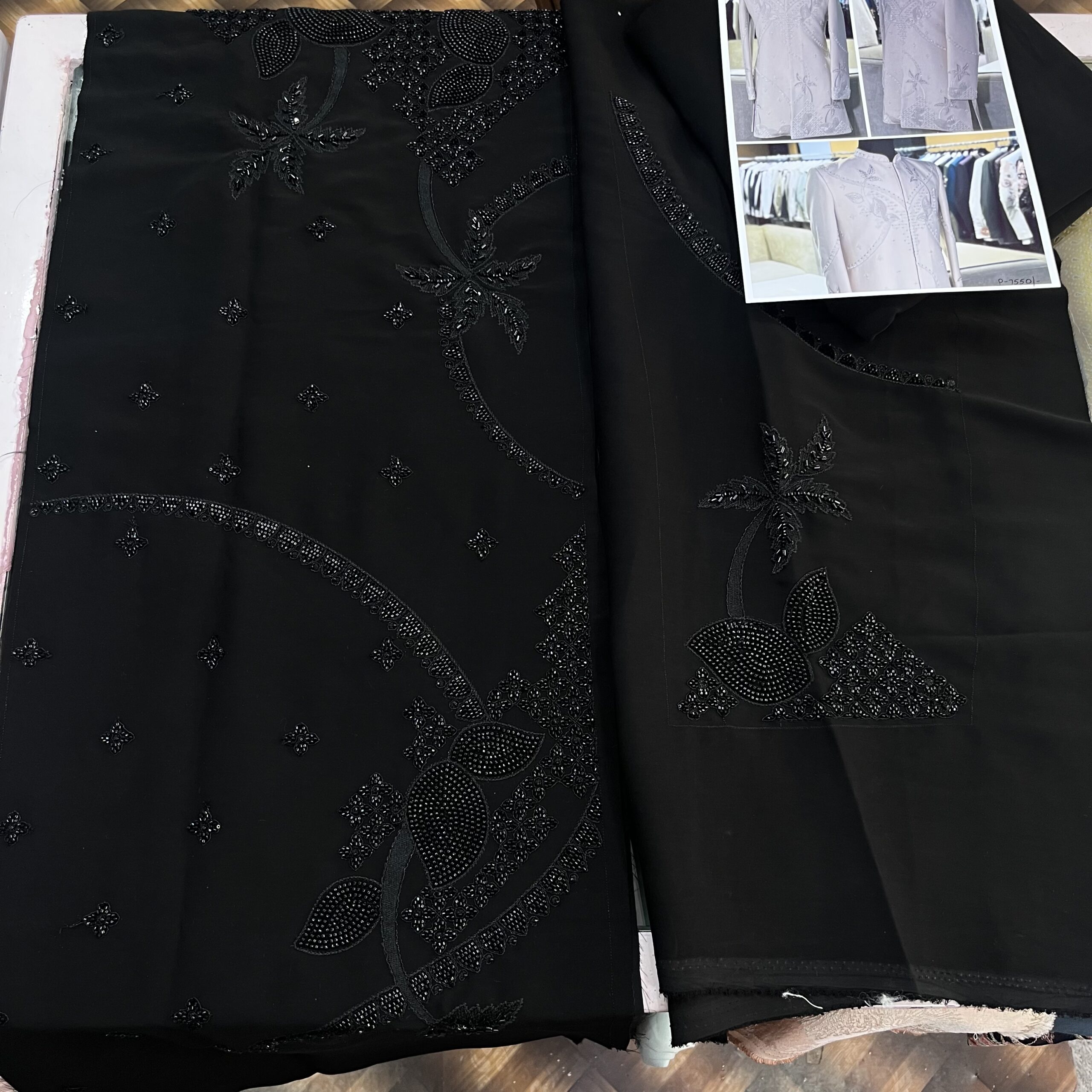 The fabric features heavy cutdana embroidery with intricate leaf and tree motifs, along with rich butti work on the front panel and sleeves, giving it a royal, designer appeal. Paired with a plain matching pant fabric, this precut set ensures a polished and structured silhouette.