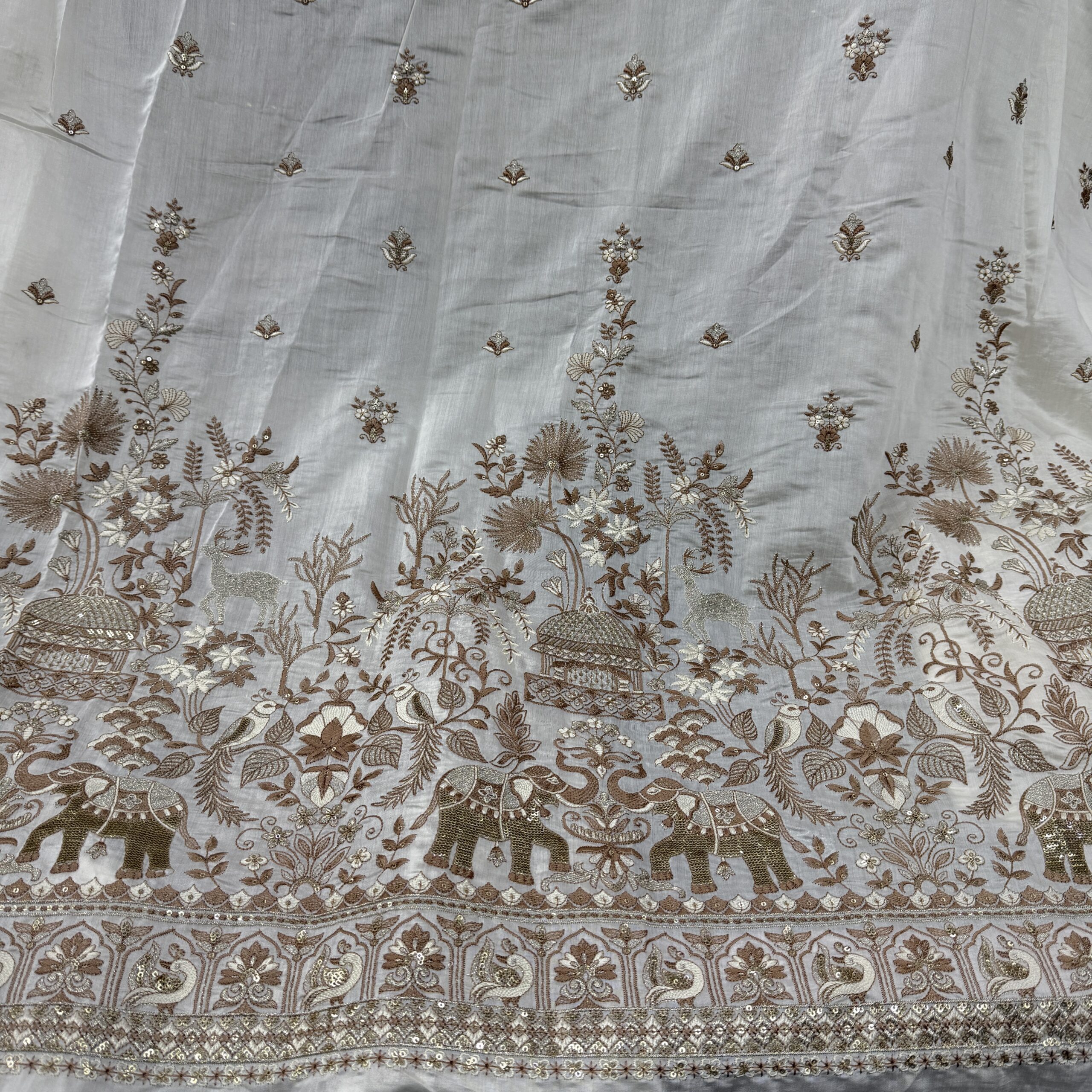 Upgrade your ethnic collection with this luxurious Fendy Silk fabric, beautifully crafted with heavy daman work featuring intricate thread embroidery and shimmering sequins detailing. This fabric offers a rich designer look with a lightweight feel, making it a perfect choice for summer weddings and festive occasions.