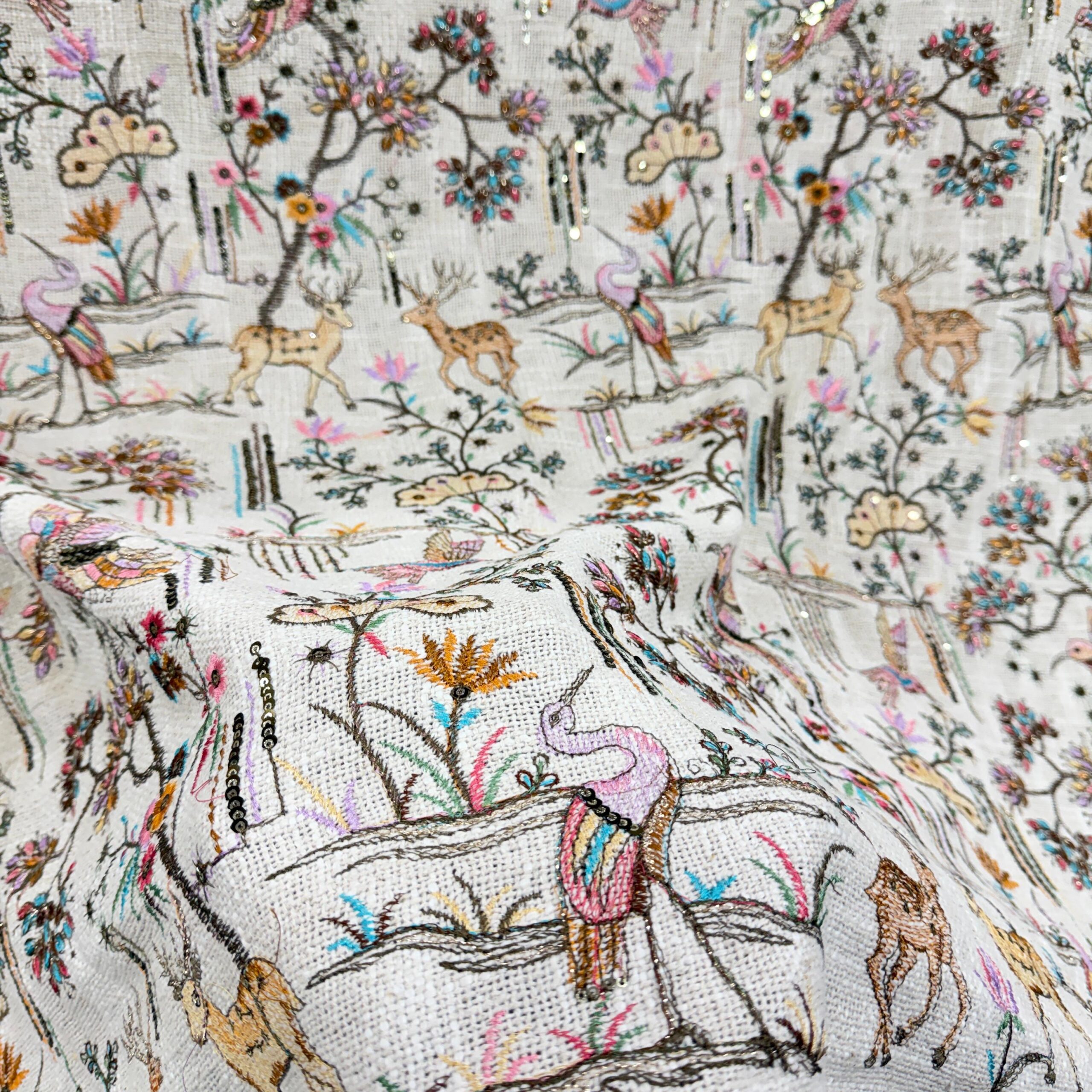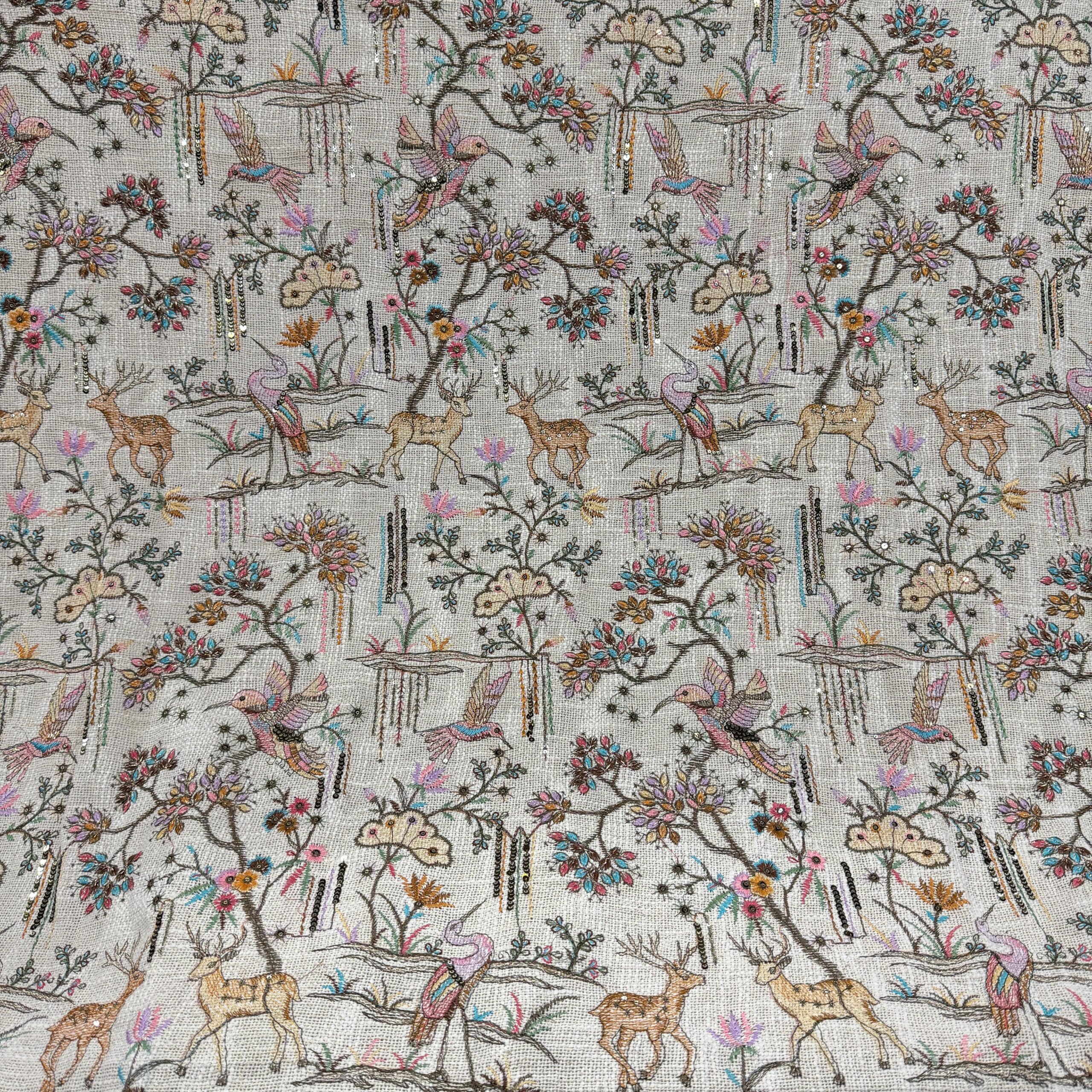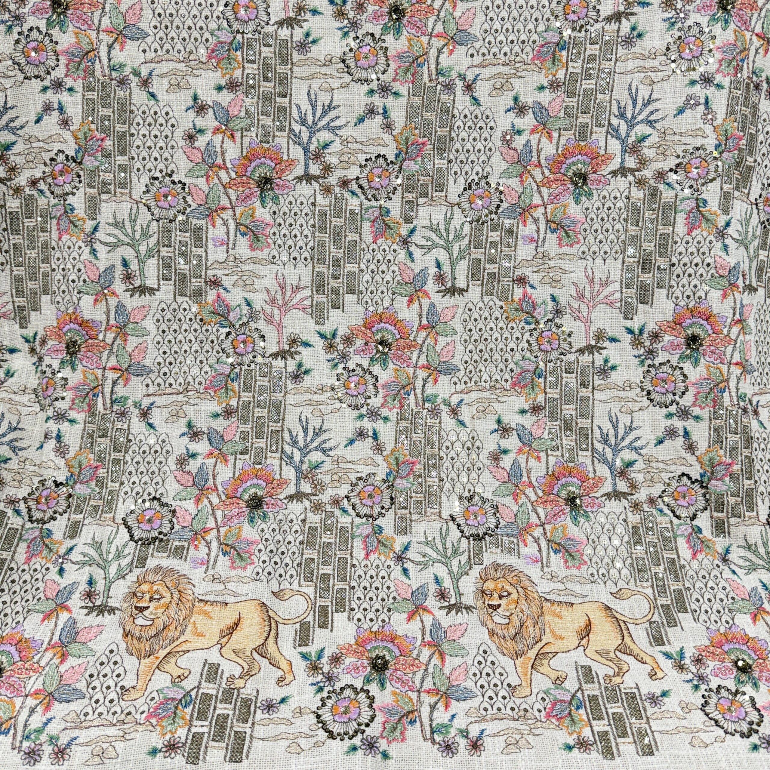 Discover the charm of natural textures with this premium jute cotton fabric featuring heavy allover embroidery in beautiful artistic motifs. This unique collection comes in 4 stunning nature-inspired designs – Lion 🦁, Bird 🕊️, Tree 🌳 and Deer 🦌, giving the fabric a rich yet earthy and elegant appearance.