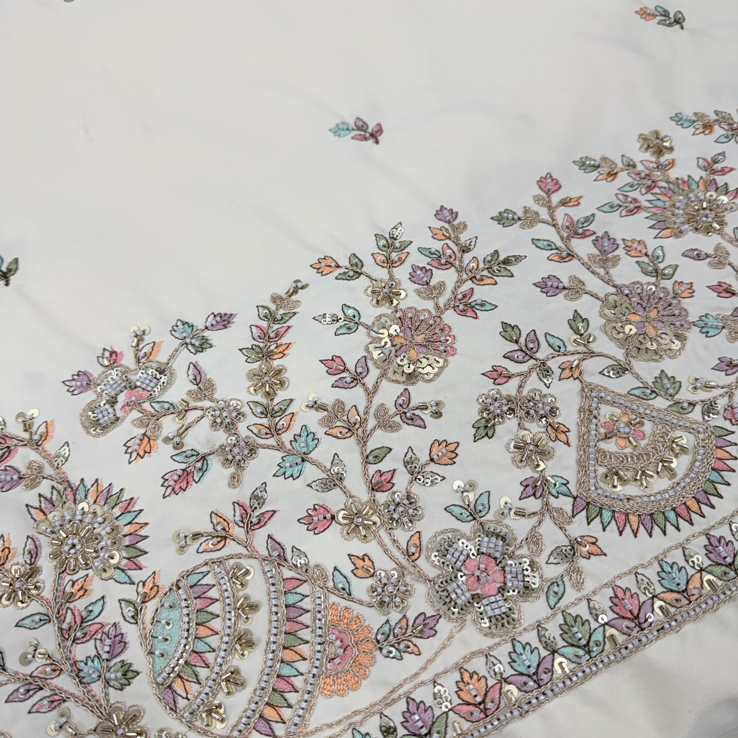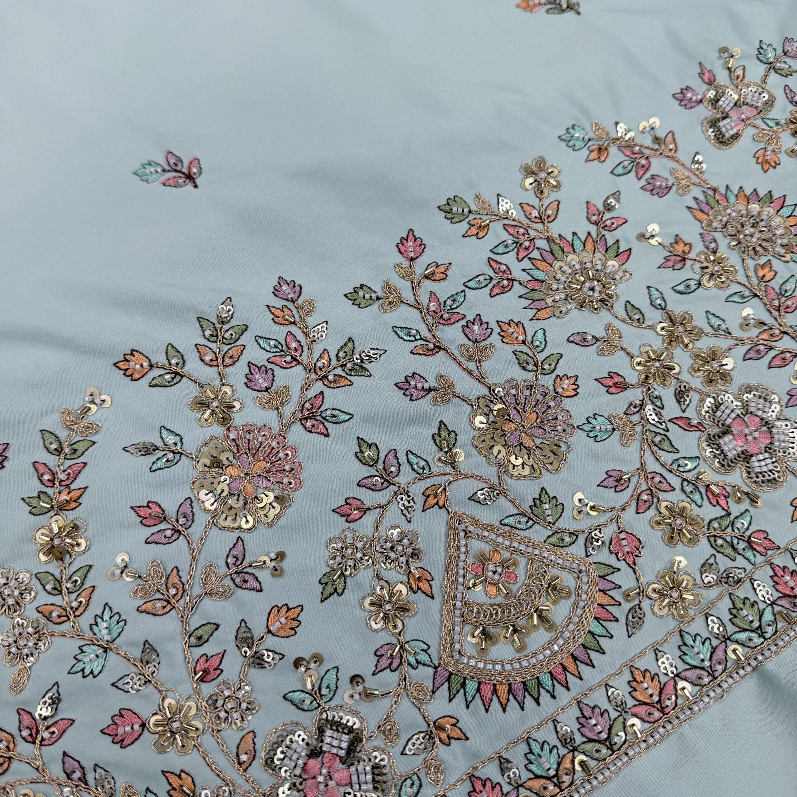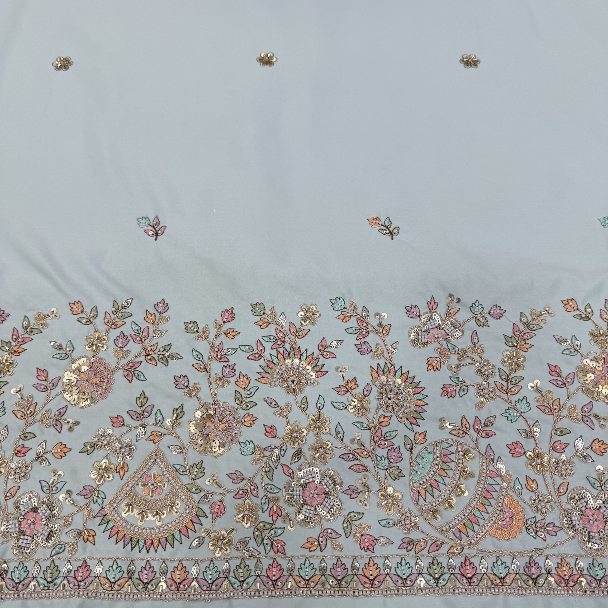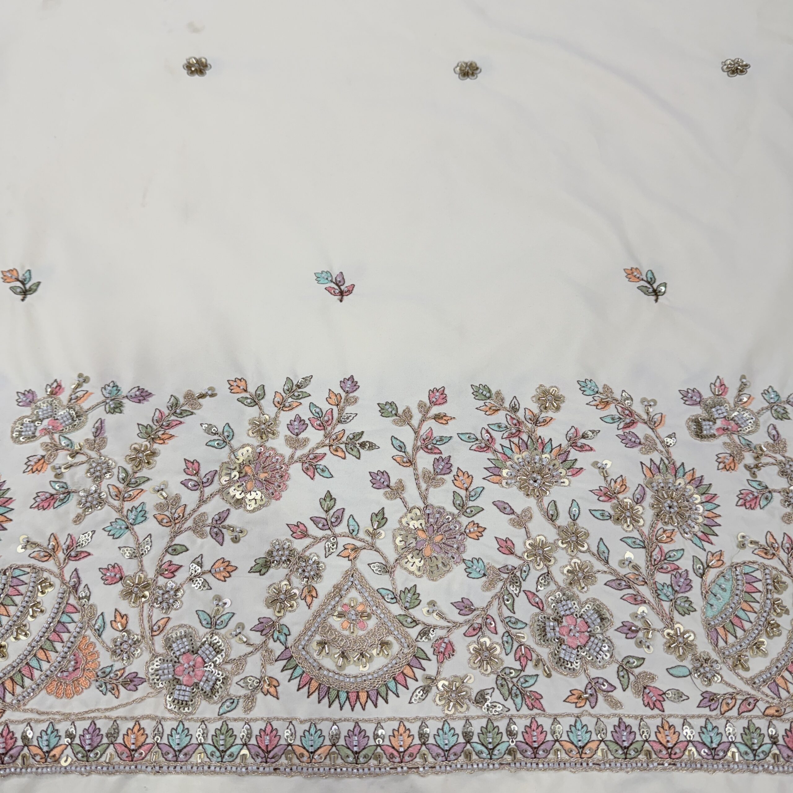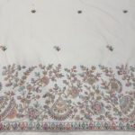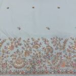 Add a touch of royal elegance to your designer collection with this luxurious Malai Satin fabric, available in two very beautiful and soothing shades – Cream and Powder Blue 🤍💙. Crafted with the most trending cutdana handwork, this fabric features a heavy handcrafted border showcasing Kalash and floral motifs, complemented by delicate allover handwork butti for a rich yet graceful finish. ✨🧵