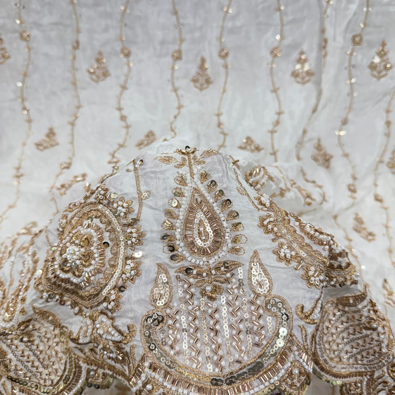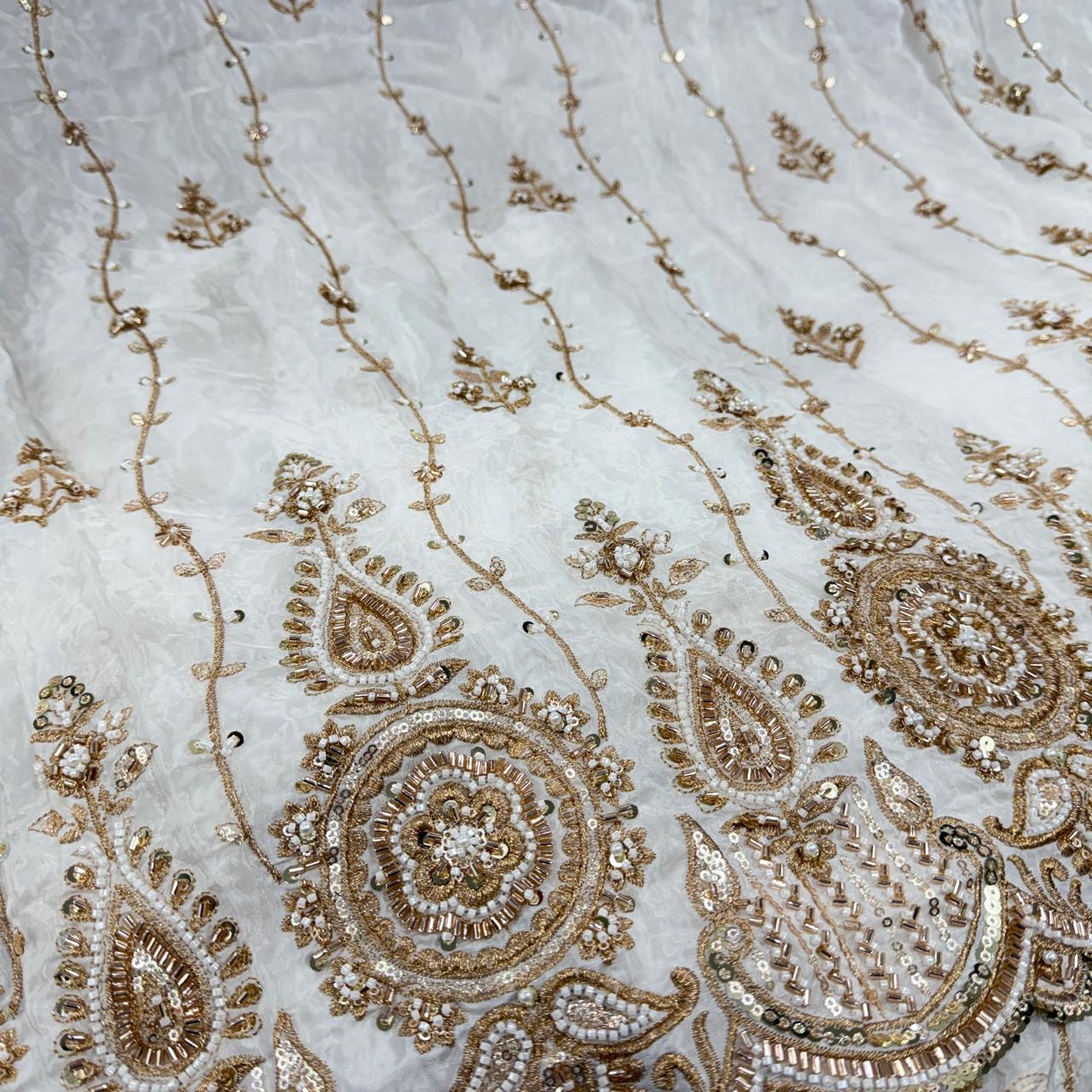 Create stunning couture outfits with this luxurious natural crepe dyeable fabric, beautifully crafted with intricate handwork, heavy panel design and elegant allover butti pattern ✨. The combination of detailed craftsmanship and soft crepe texture gives the fabric a rich, graceful and high-end designer appeal.
