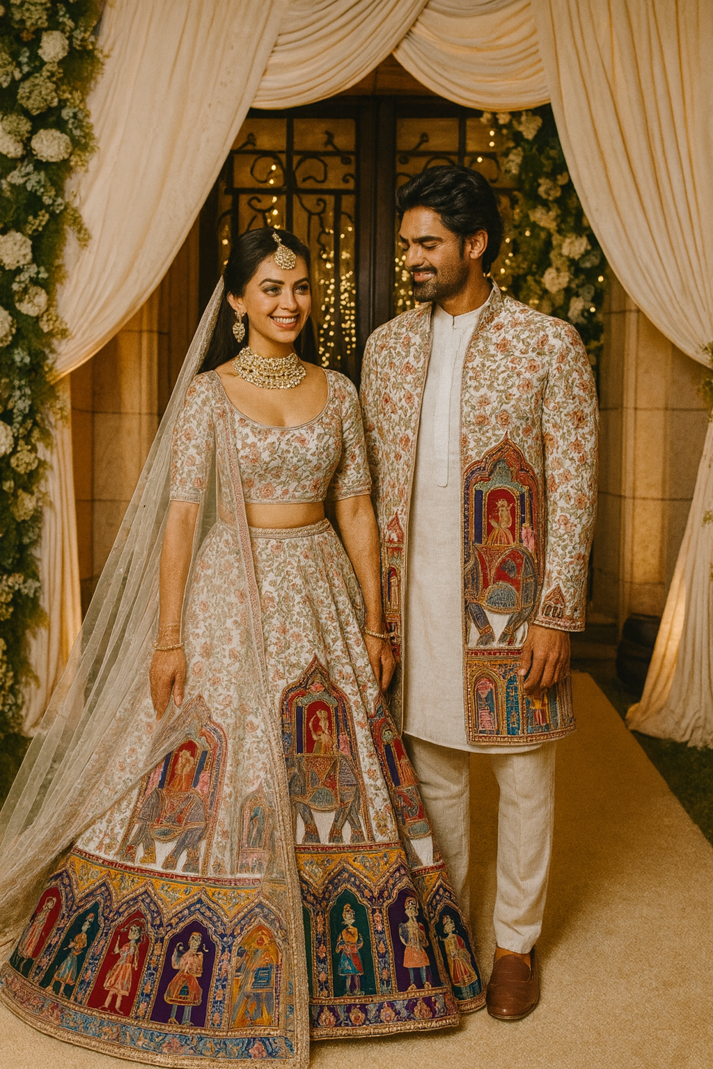 This beautiful and classy crepe fabric is perfect for creating coordinated couple outfits and designing stylish lehengas, kothis, jackets, suits, gowns, dresses, and Indo-Western wear. The cultural motifs make it ideal for festive and wedding themes.