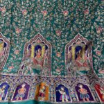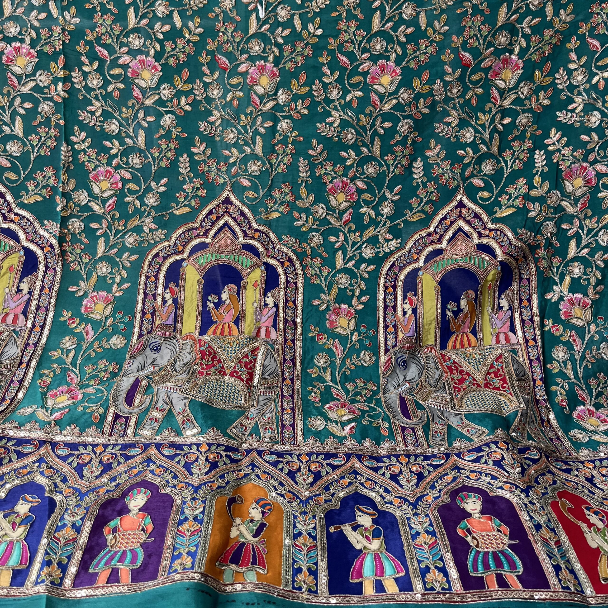 Introducing our premium Pure Natural Crepe Fabric, available in three stunning colors—Rama Green, Royal Blue, and White. This luxurious fabric features a heavy panel design with intricate Gudda Dudia artwork and a real big elephant motif, complemented by an elegant allover pattern that enhances its rich traditional appeal.