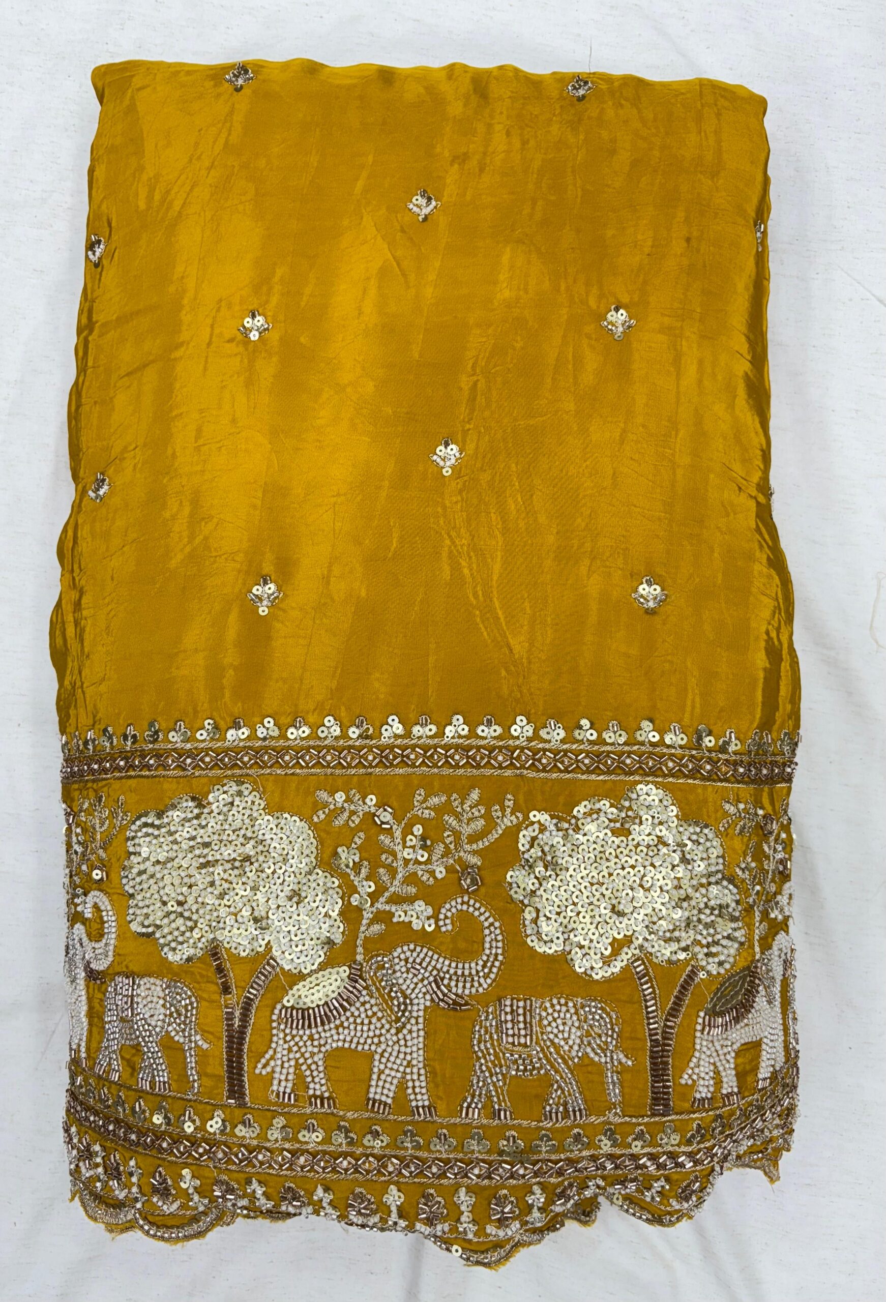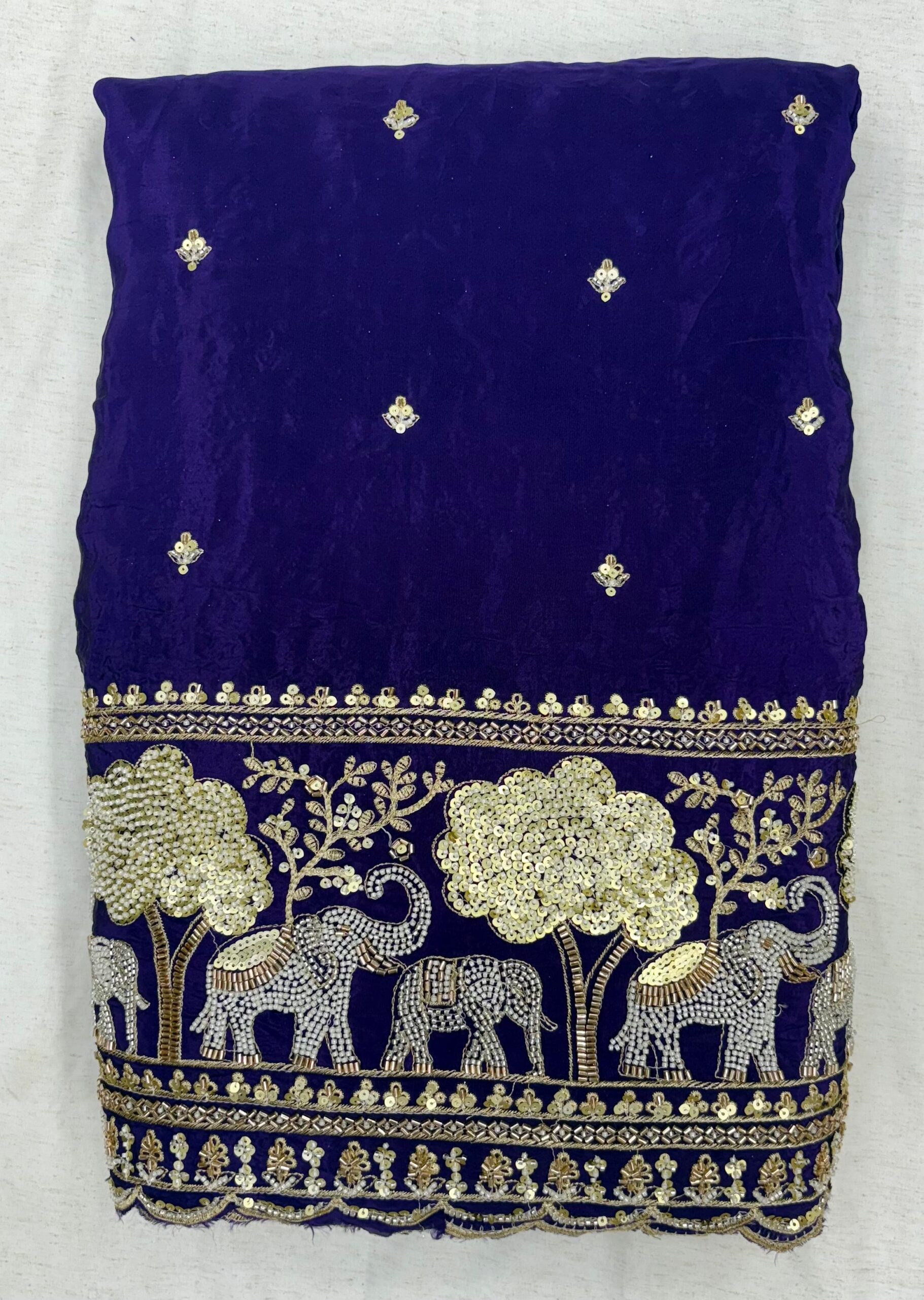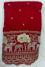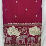 Experience the essence of royal tradition with our Pure Natural Crepe Handwork Fabric, featuring a heavy embroidered border with majestic elephant motifs symbolizing Rajasthani culture and heritage. The fabric also showcases allover small butti handwork, adding a touch of elegance and craftsmanship to every inch.