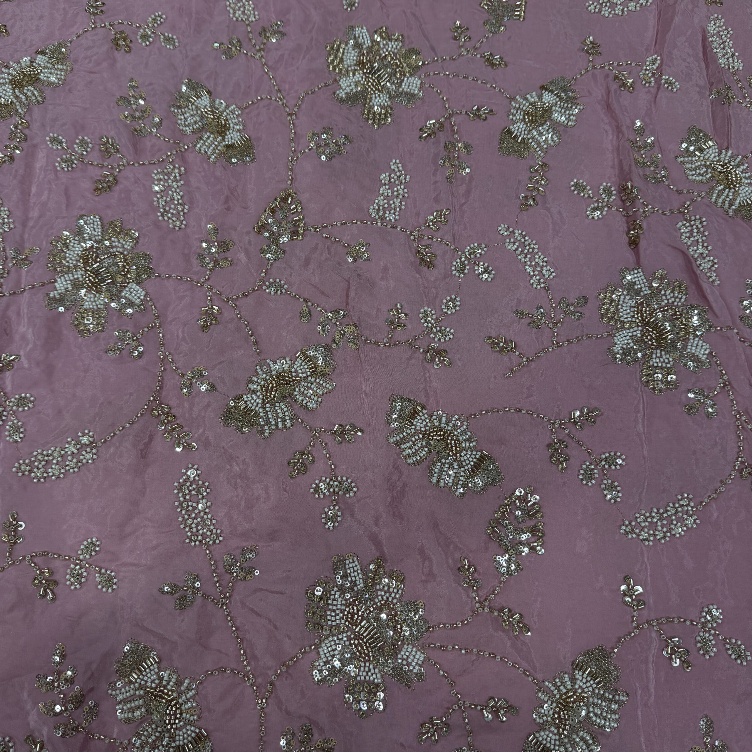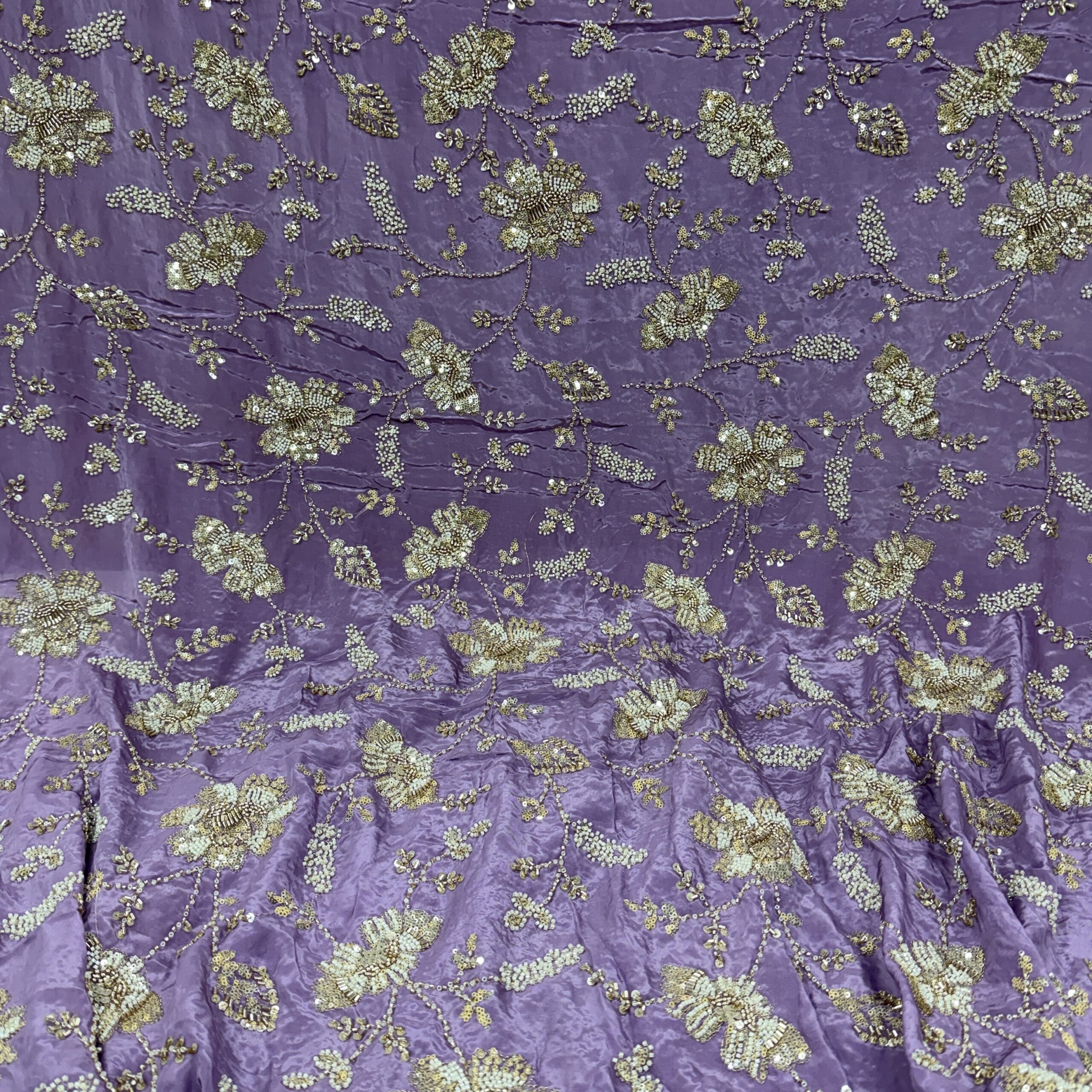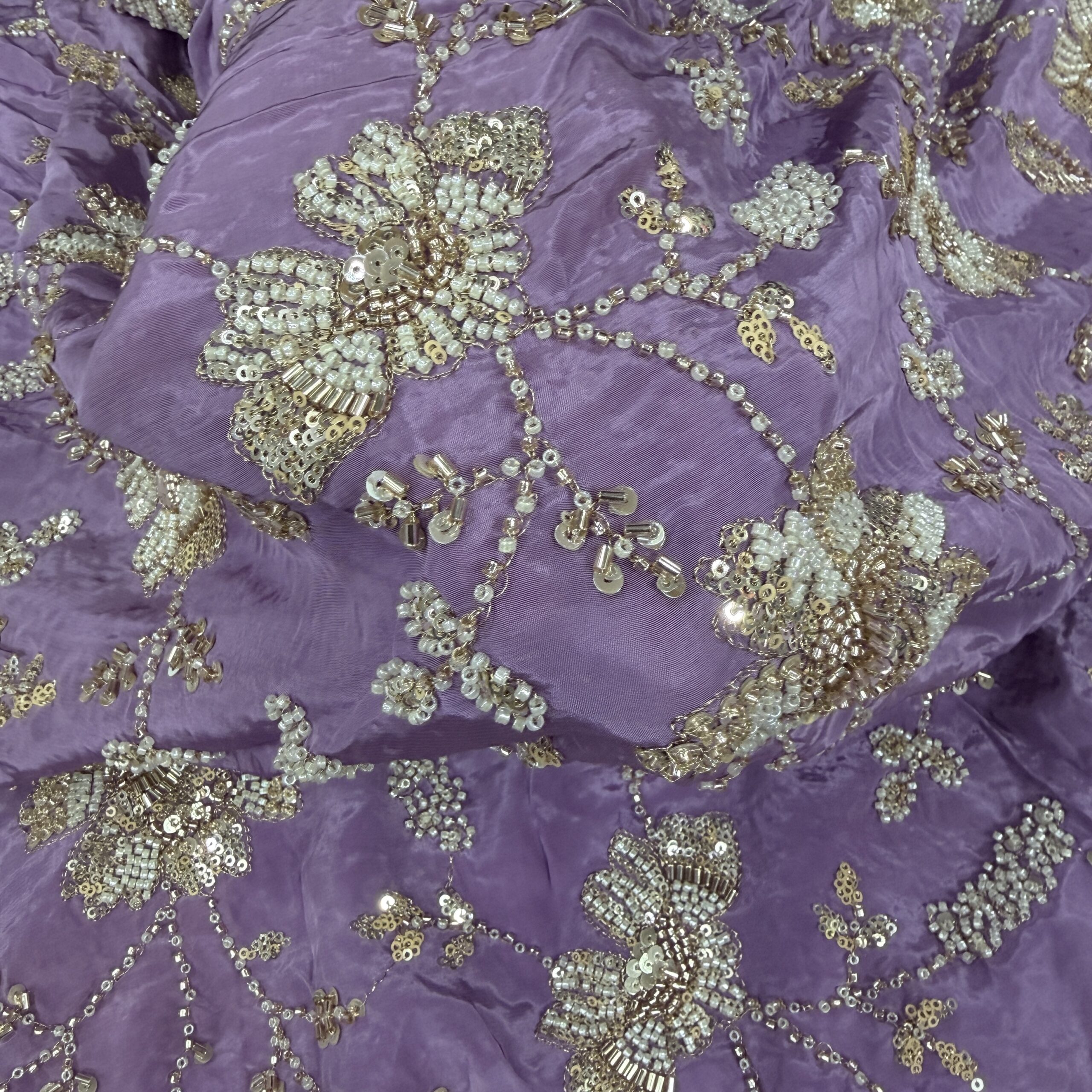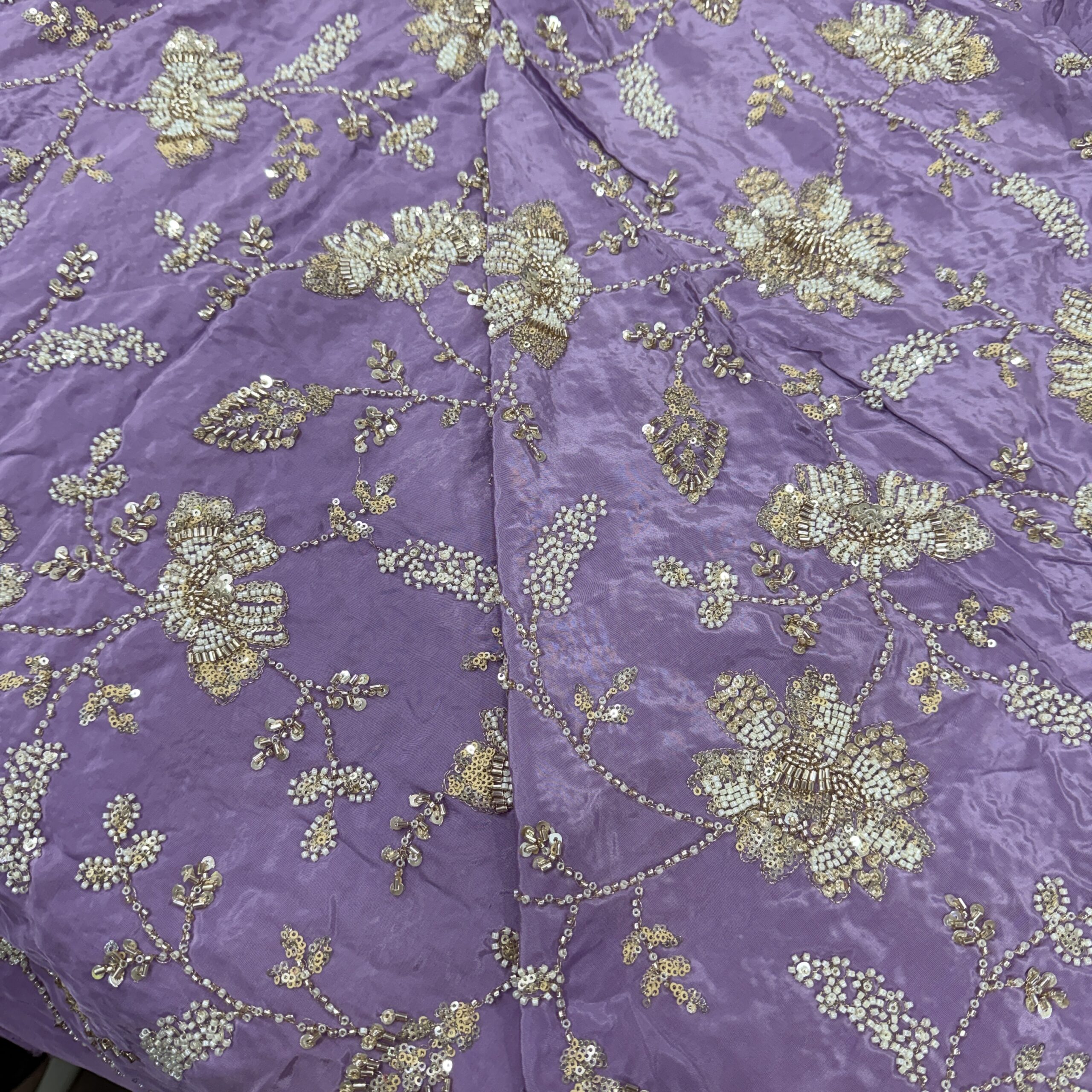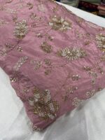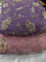 Elevate your wedding and party wear collection with this luxurious pure natural crepe fabric, beautifully crafted with heavy floral handwork embroidery 💫. Available in two stunning shades – Peachish Pink and Lavender, this fabric is adorned with intricate beads and cutdana work, delicately highlighted across the flowers and leaf motifs, giving it a rich, elegant and designer finish.