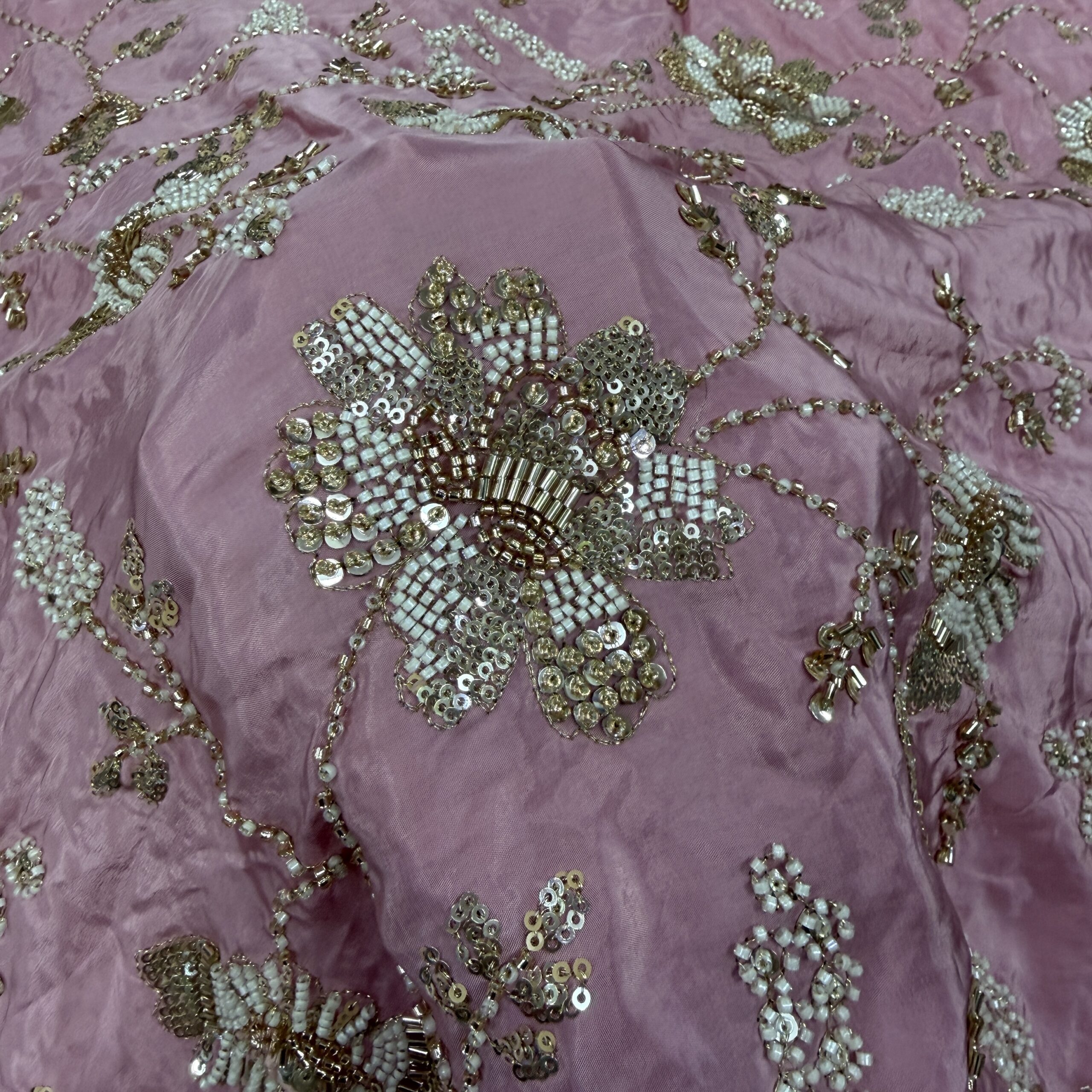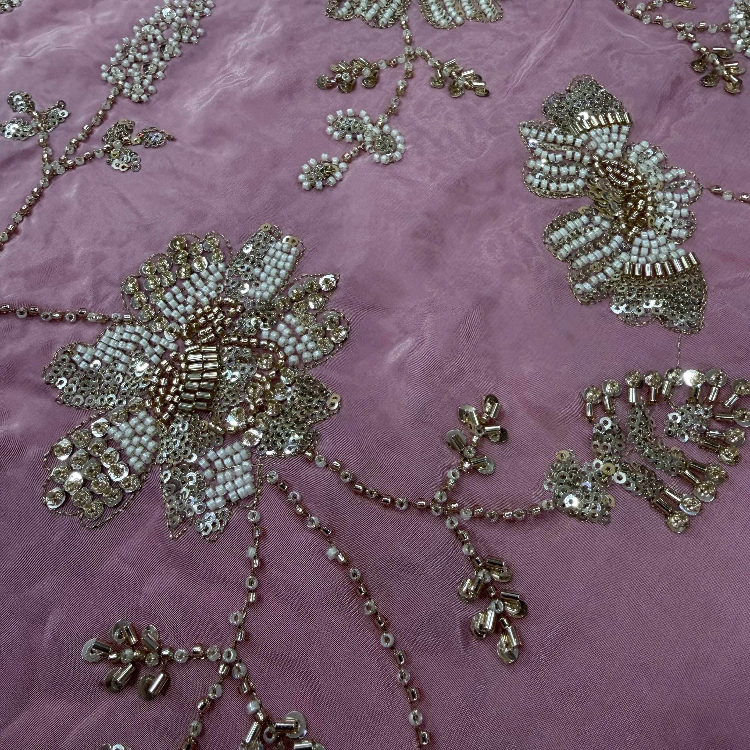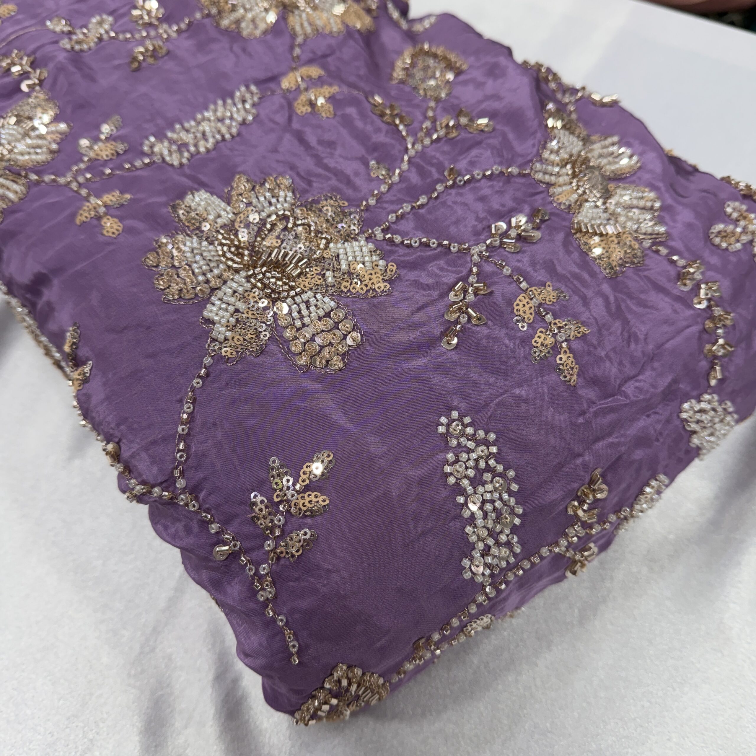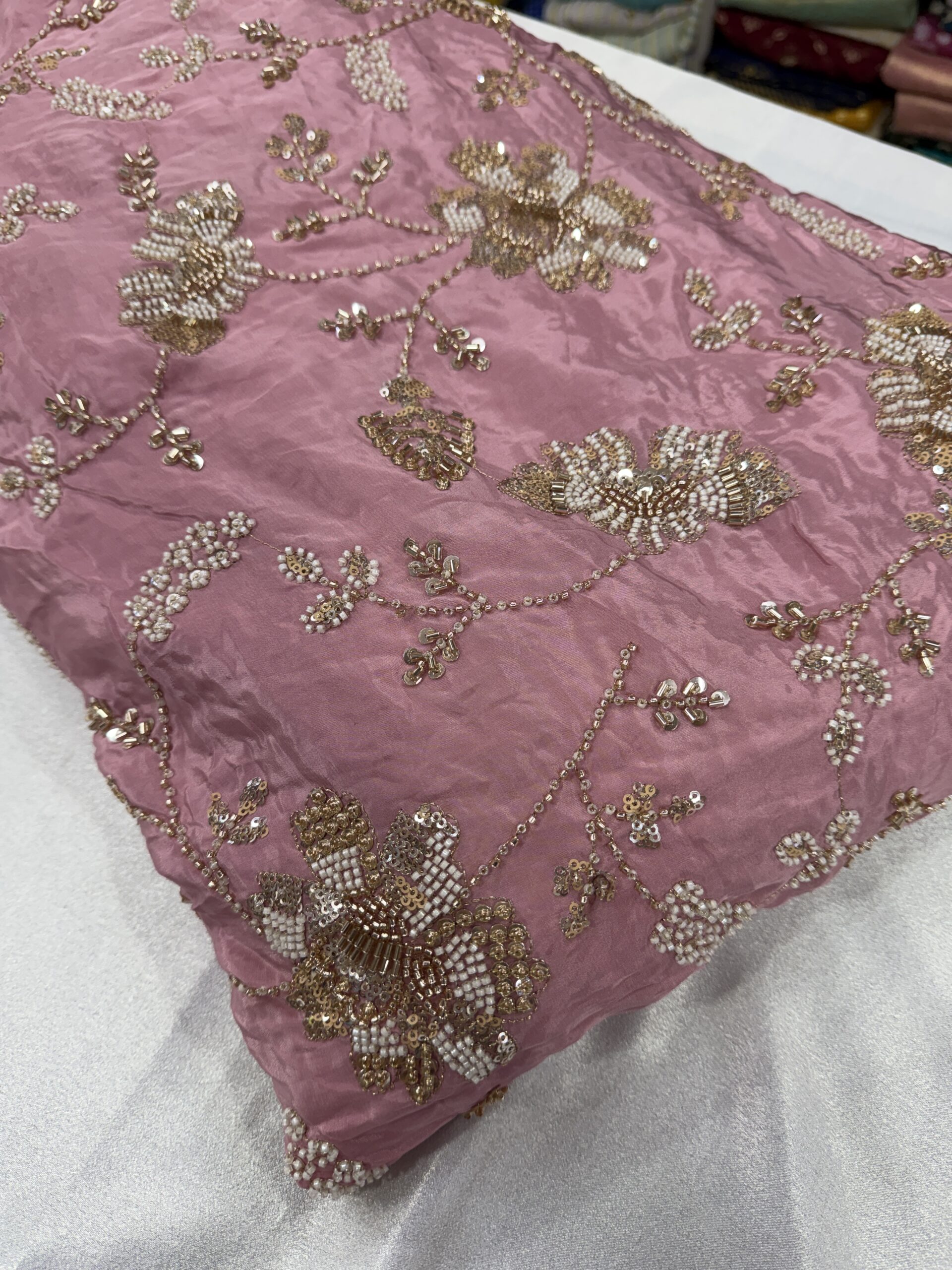 Elevate your wedding and party wear collection with this luxurious pure natural crepe fabric, beautifully crafted with heavy floral handwork embroidery 💫. Available in two stunning shades – Peachish Pink and Lavender, this fabric is adorned with intricate beads and cutdana work, delicately highlighted across the flowers and leaf motifs, giving it a rich, elegant and designer finish.