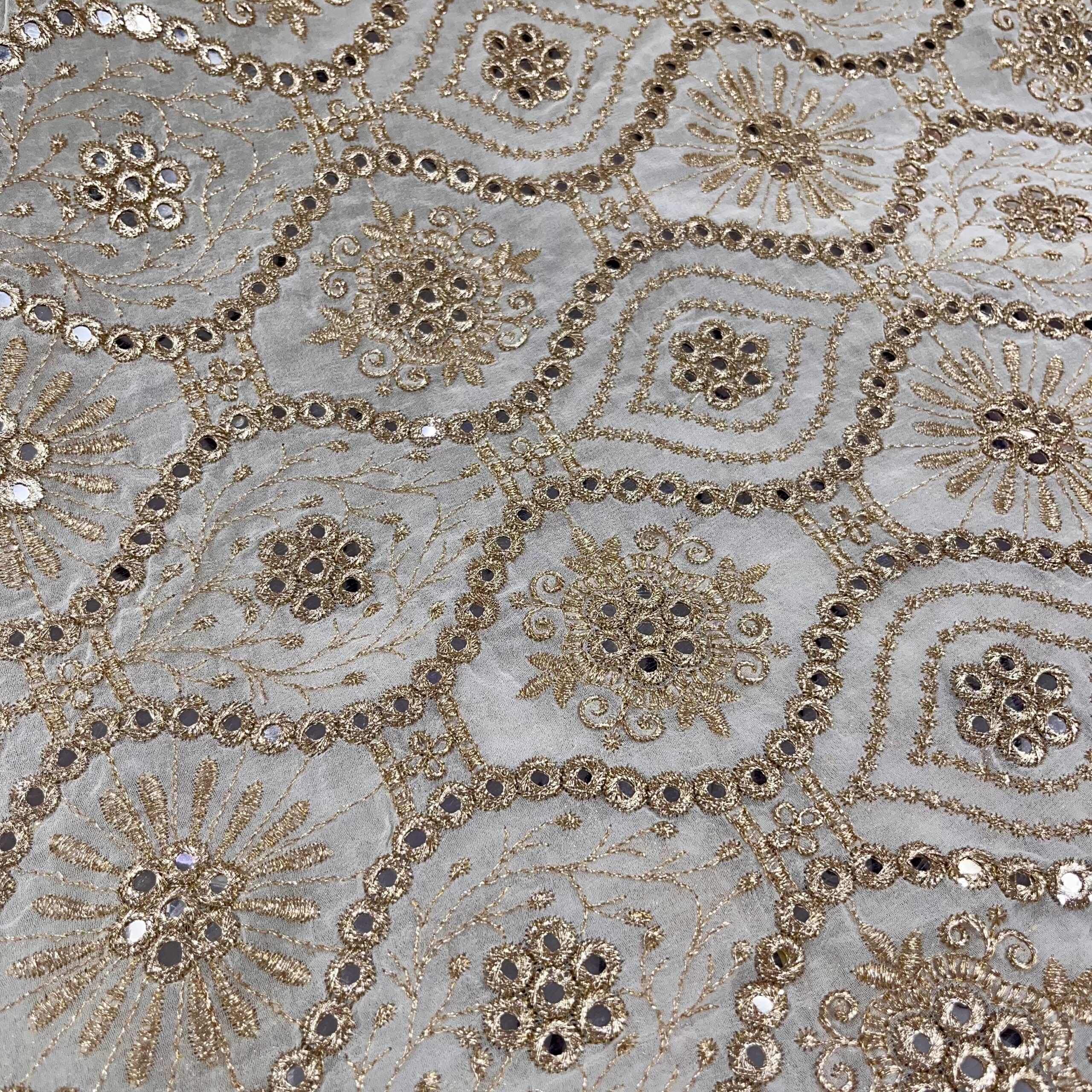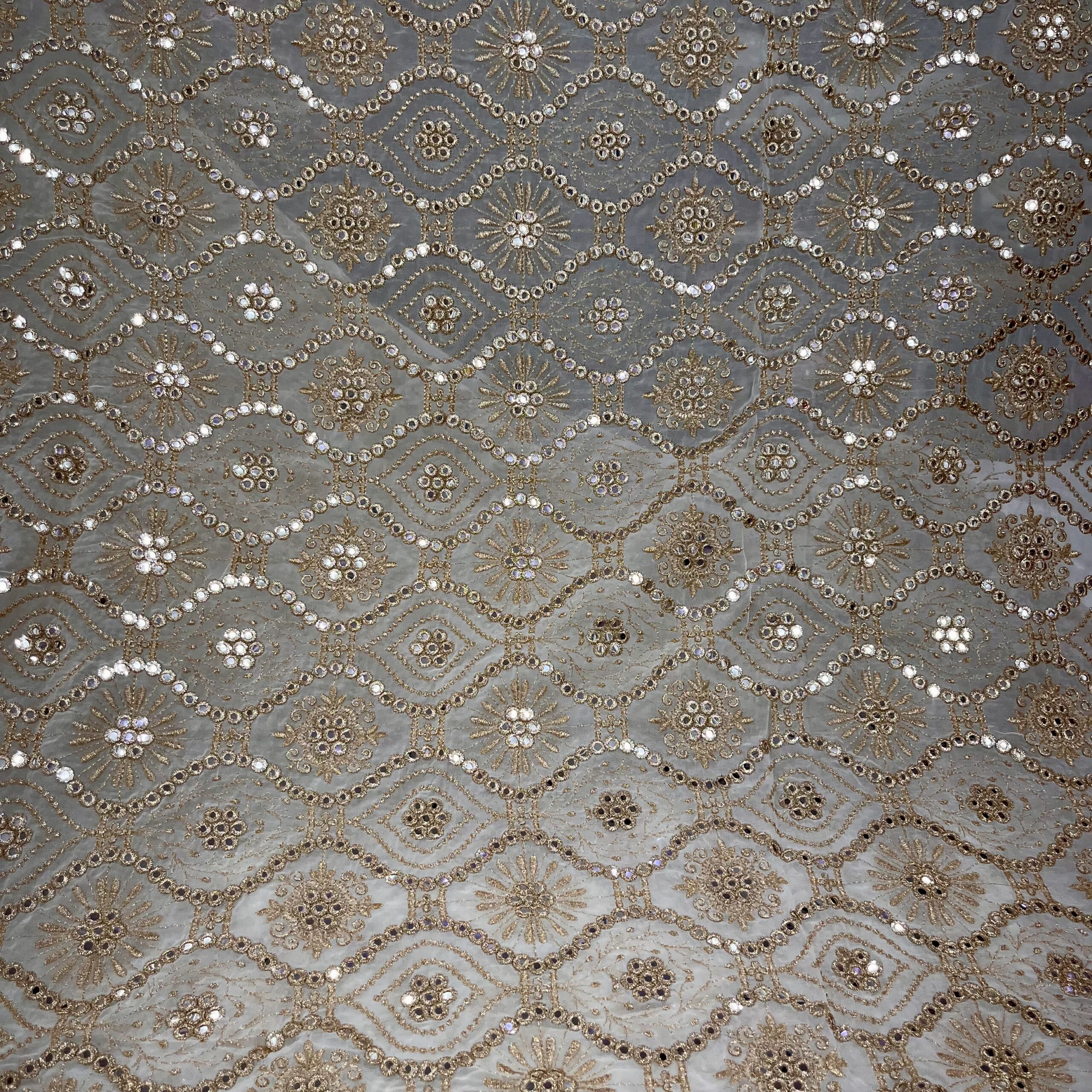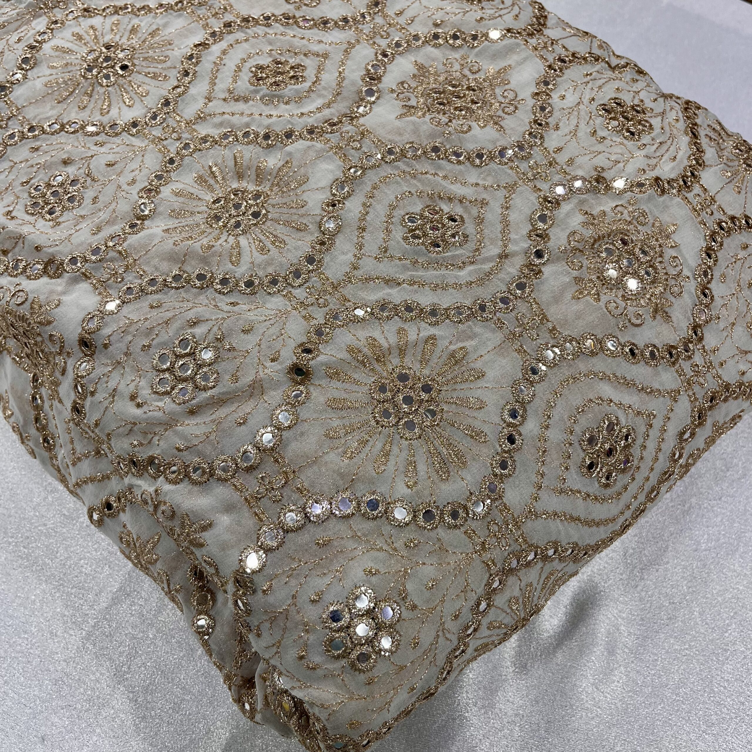 Discover elegance with our Pure Viscose Georgette Dyeable Fabric, beautifully designed with faux mirror work, floral motifs, and zig-zag embroidery. This premium fabric is perfect for creating trending mirror-work outfits that stand out at weddings, festive celebrations, and parties.