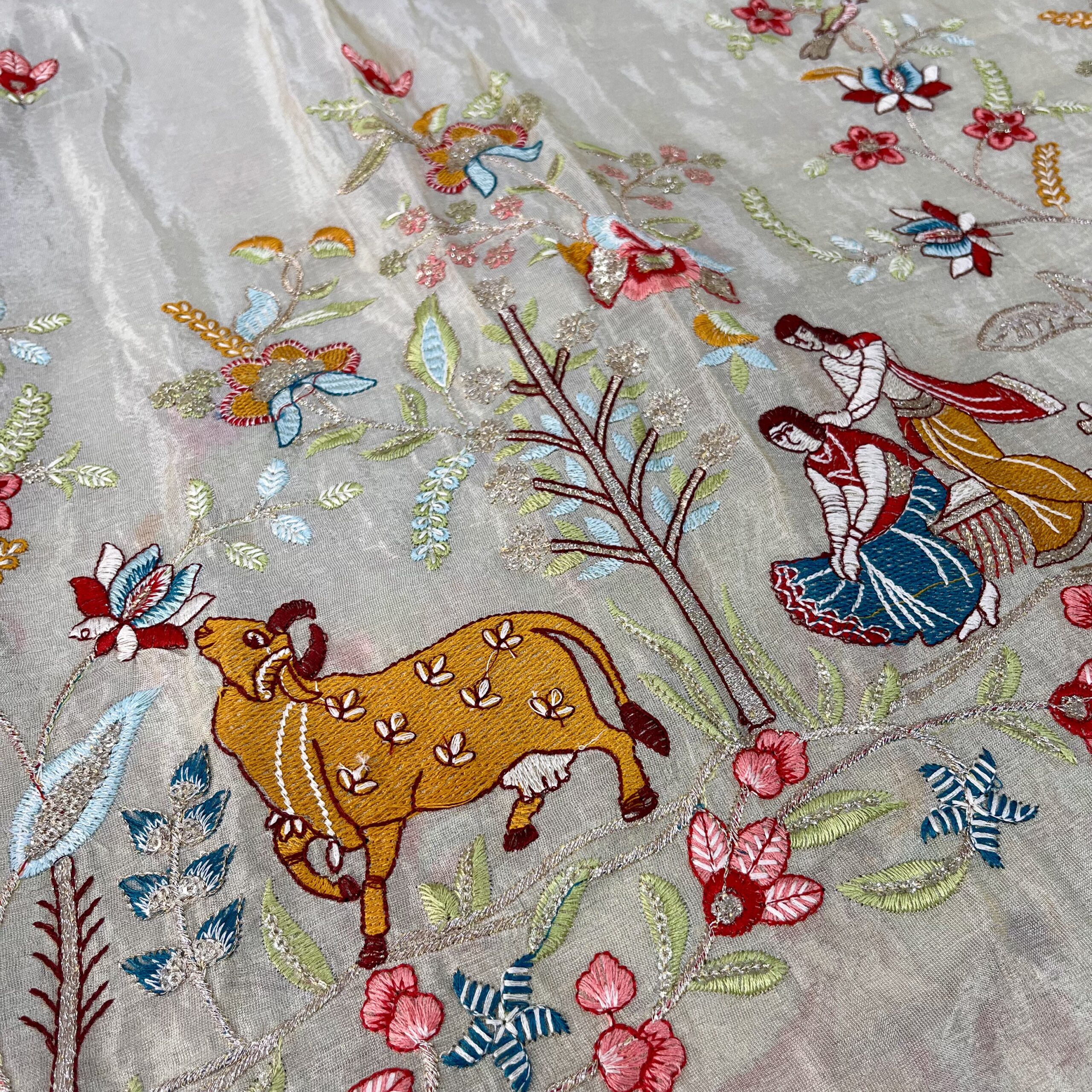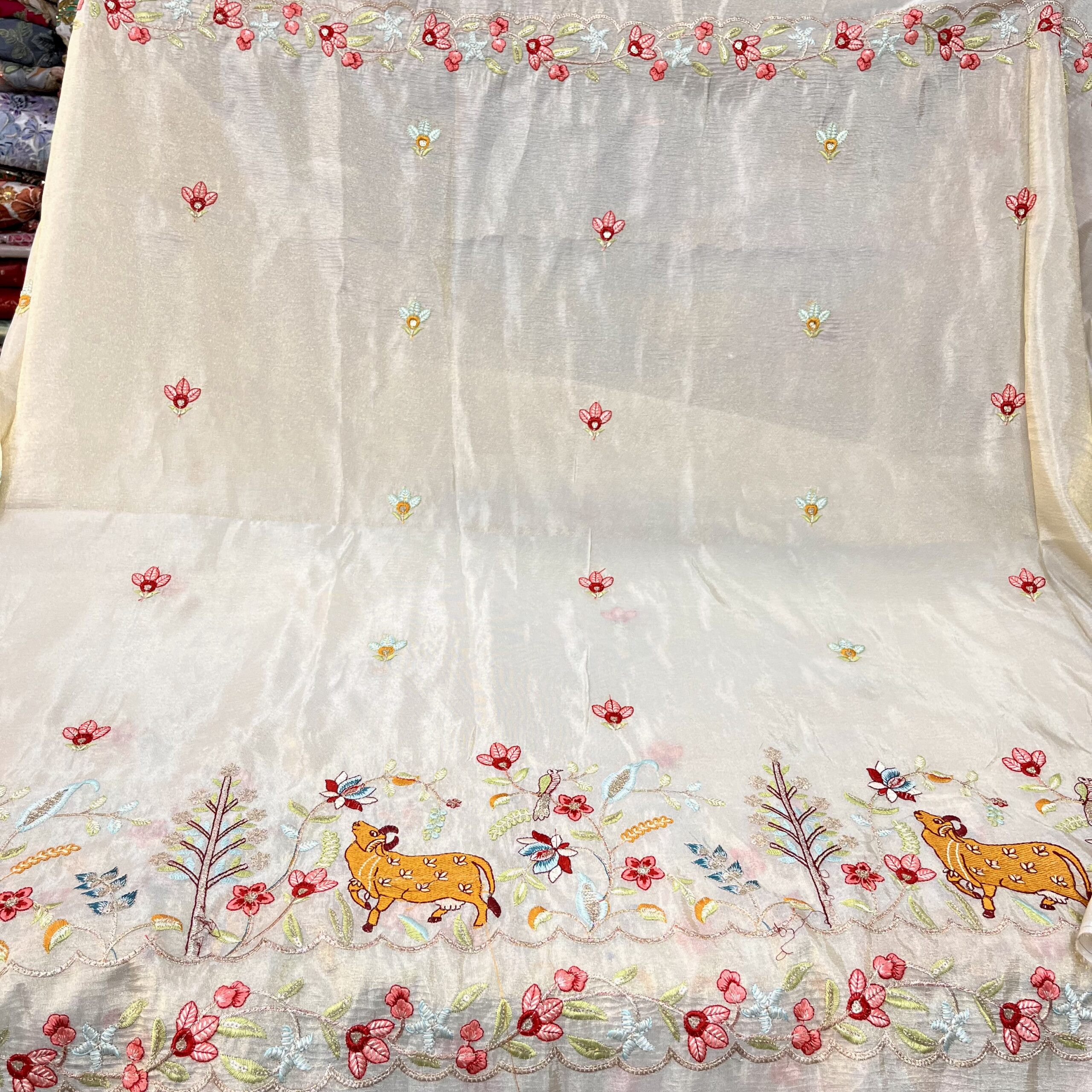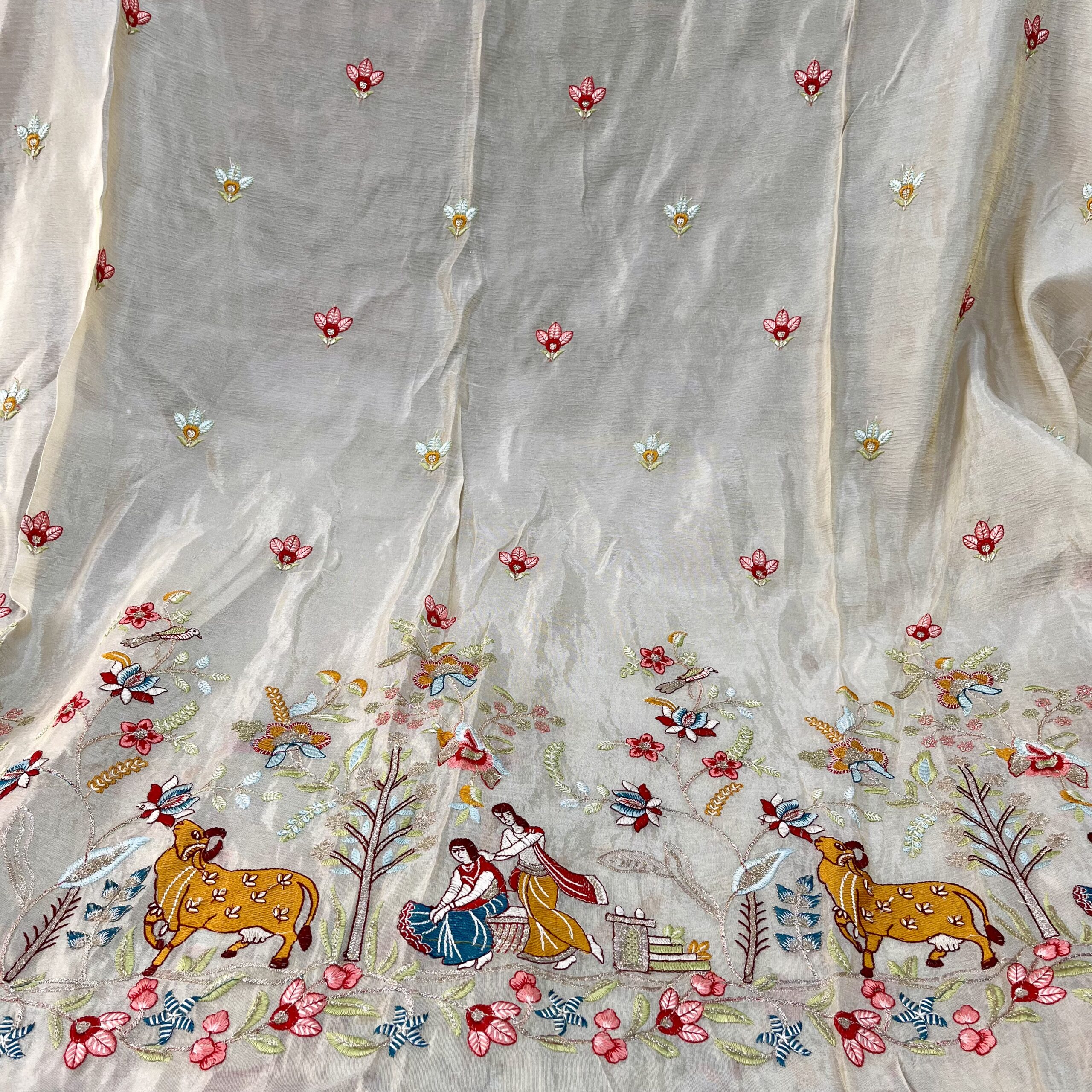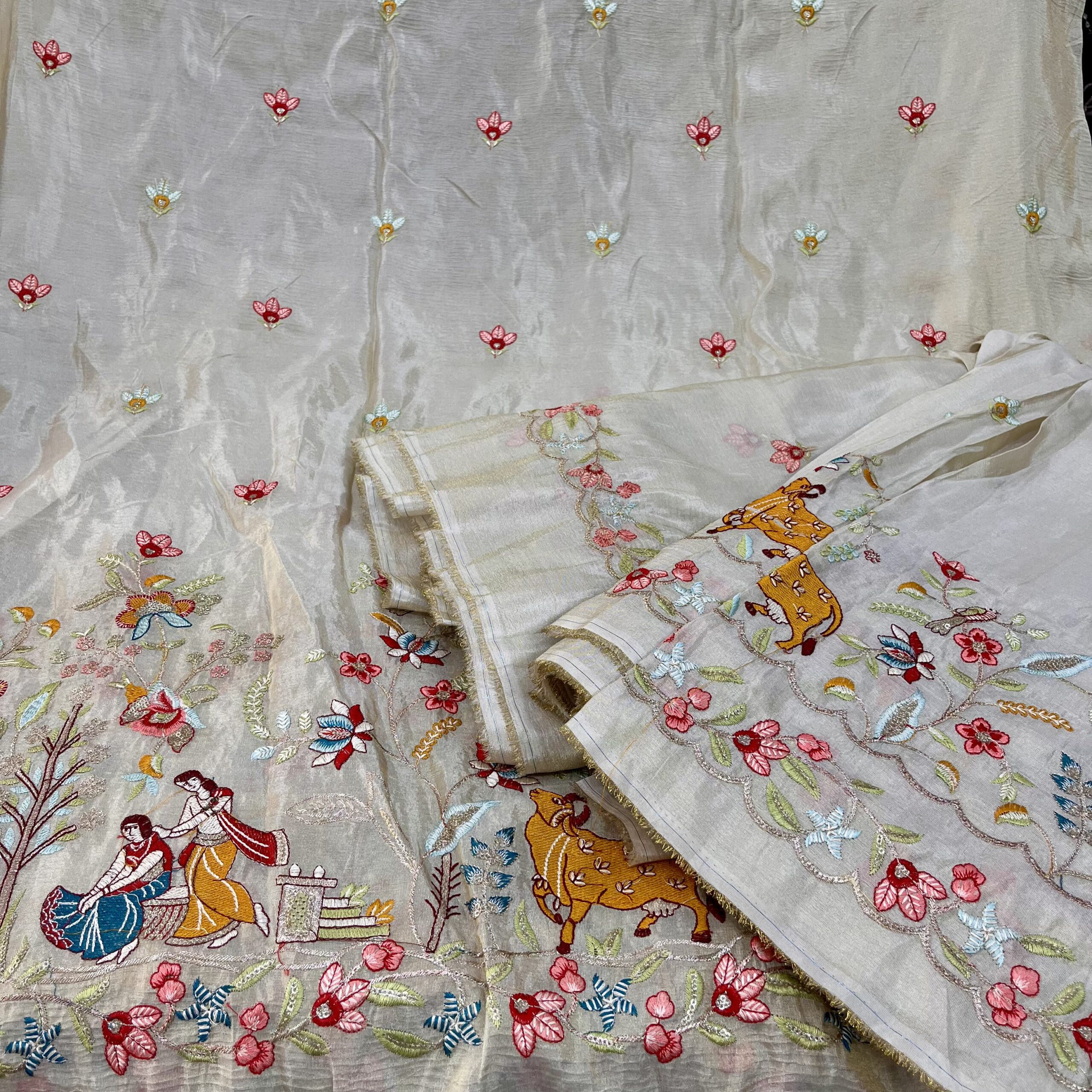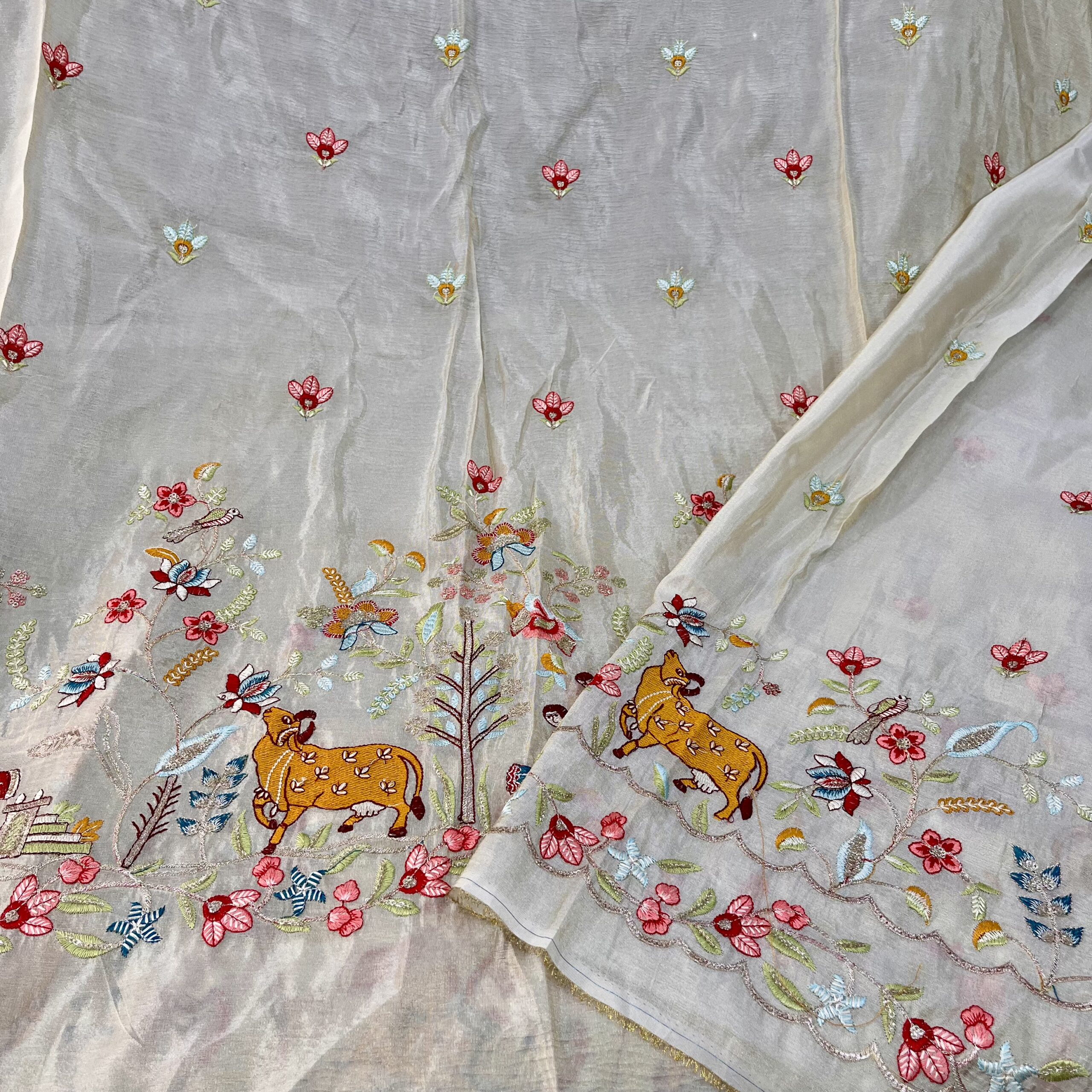 Pure Zari Tissue Dyeable Fabric with Embroidery & Sequins | Pichwai Print Fabric & Dupatta