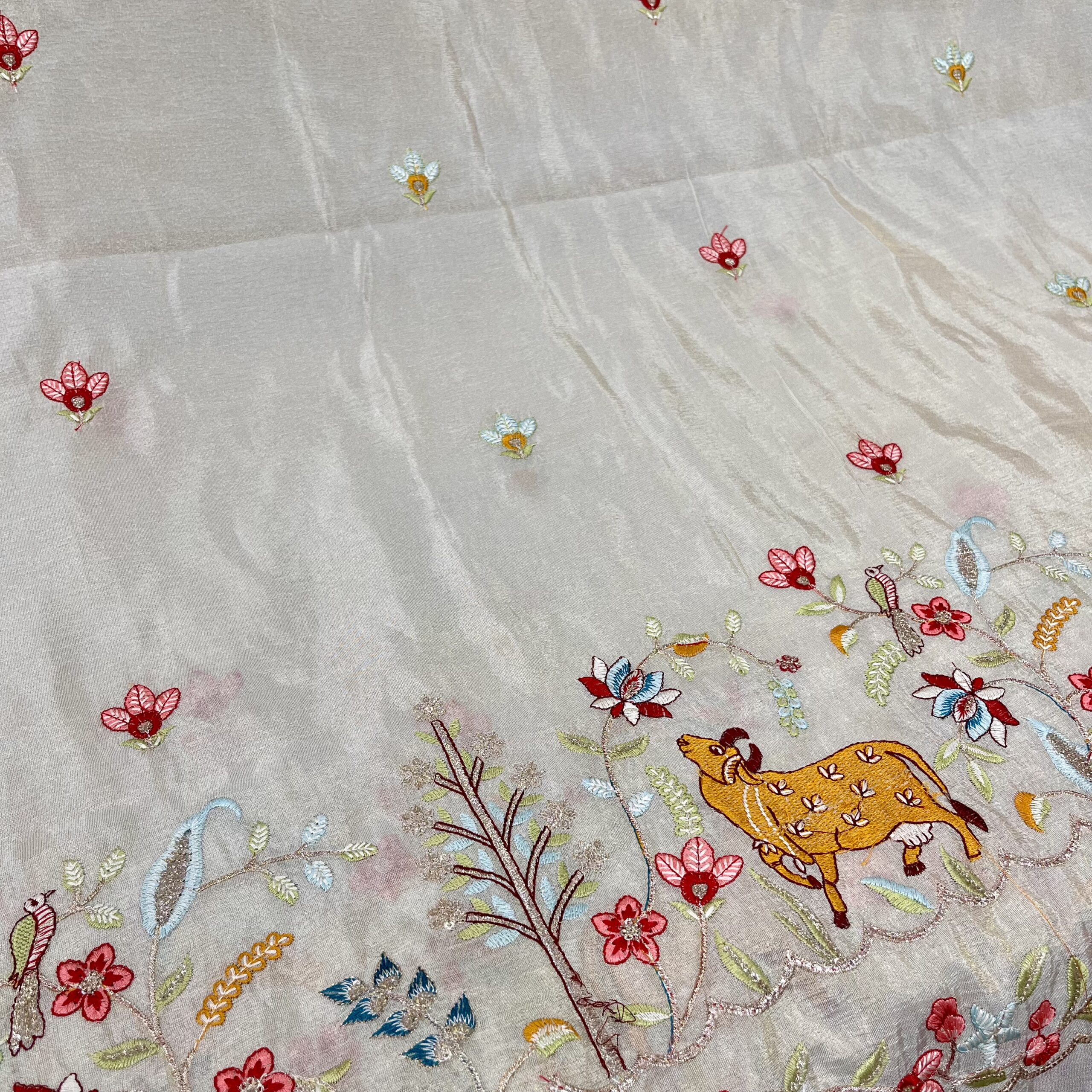 Zari Tissue Handwork Fabric with Panel Bird Design