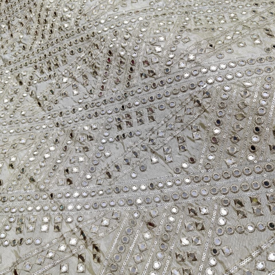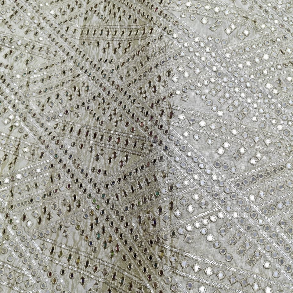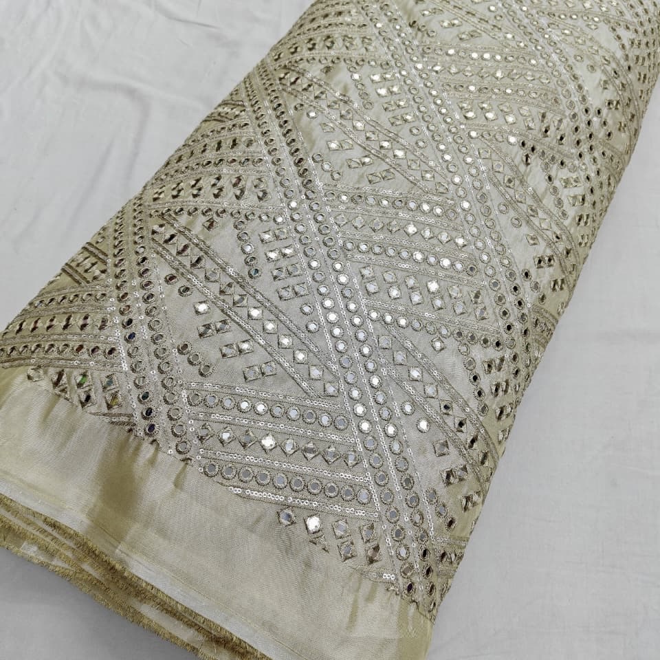 Add glamour and elegance to your festive wardrobe with this premium pure zari tissue dyeable fabric featuring stunning faux mirror and sequins work in a stylish abstract design ✨. The subtle shine of zari tissue combined with sparkling mirror and sequin embellishments creates a rich, festive and designer look, perfect for grand celebrations.