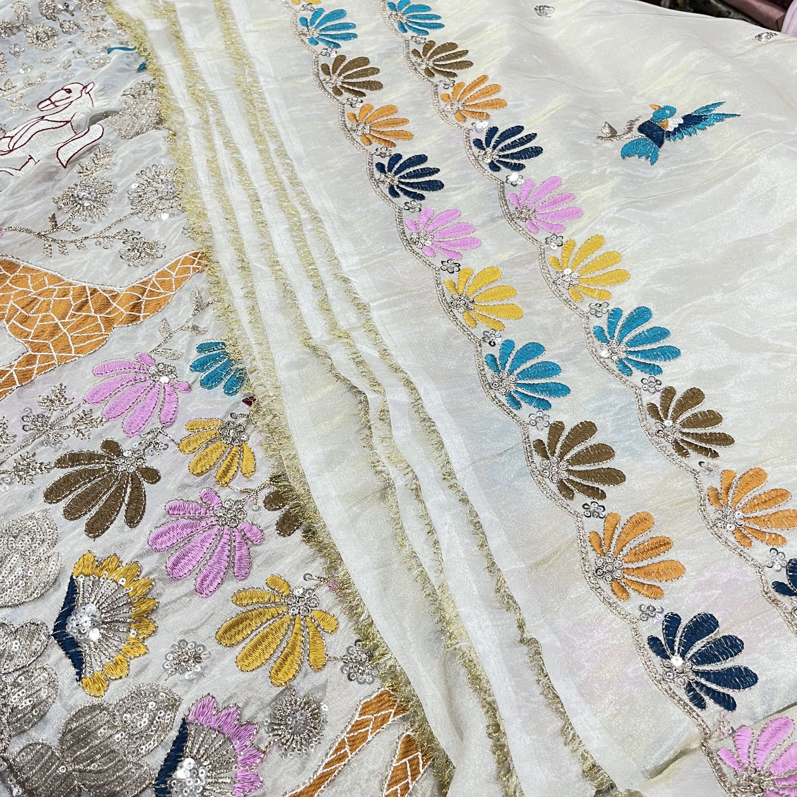 zari tissue dyeable fabric, heavy embroidered zari fabric, figure print zari fabric, Sonakshi Sinha outfit fabric, celebrity inspired fabric, couple outfit fabric for weddings, premium zari fabric 1150 per meter, dyeable zari dupatta fabric, trending wedding fabric 2025, party wear designer fabric online.