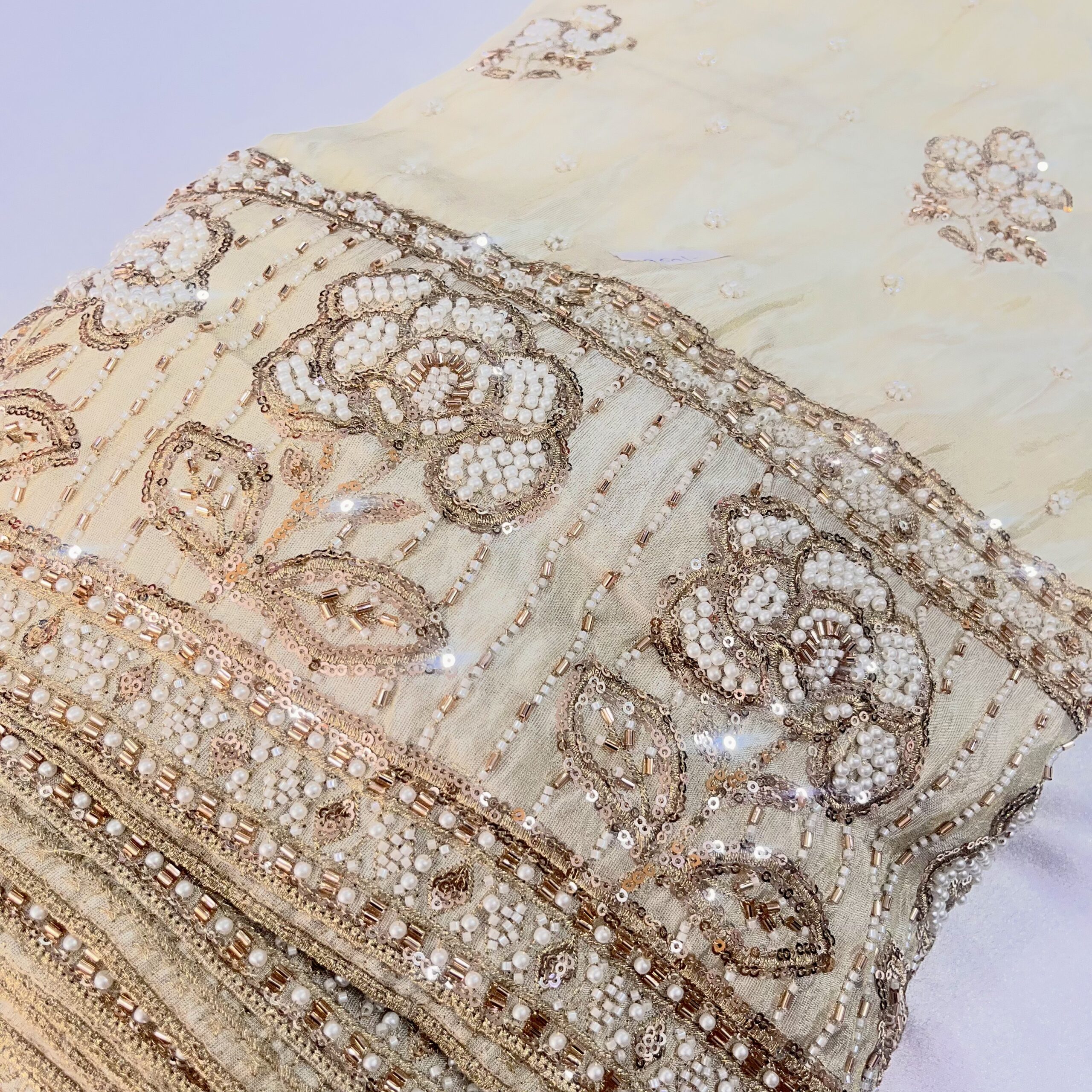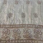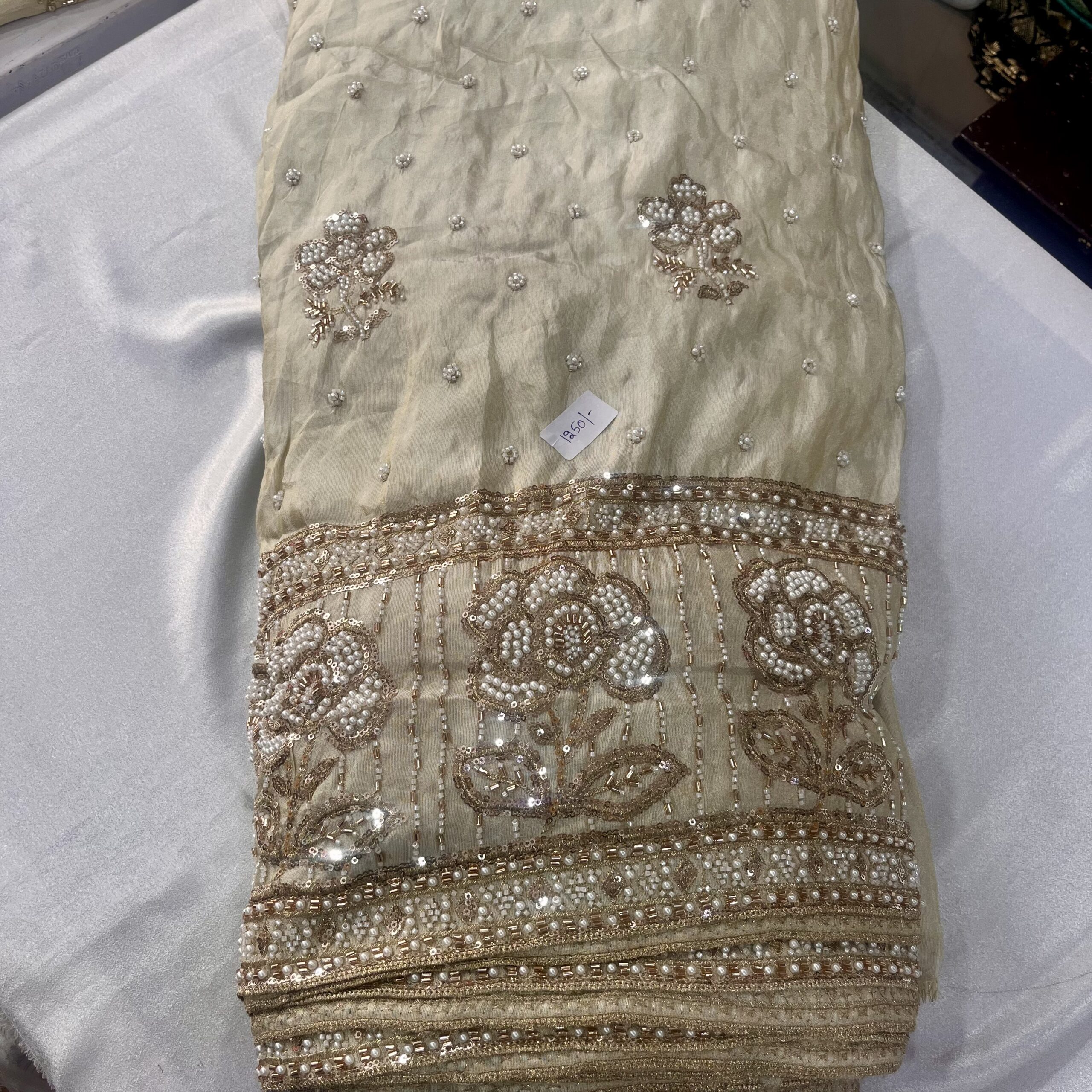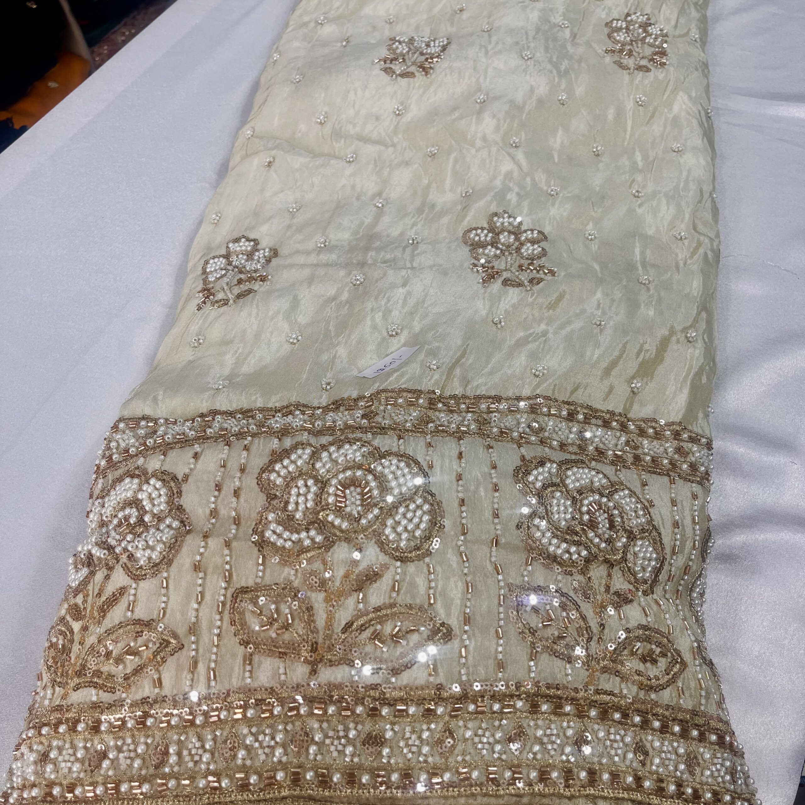 Add a royal touch to your wardrobe with our Pure Zari Tissue Handwork Dyeable Fabric, featuring heavy floral handwork with beads and intricate daman embroidery. The fabric also includes small floral butti handwork all over, giving it a rich and luxurious appeal. Ideal for weddings, parties, sangeet nights, sufi evenings, and festive occasions, this fabric exudes elegance and sophistication.