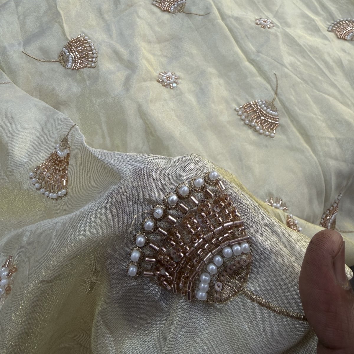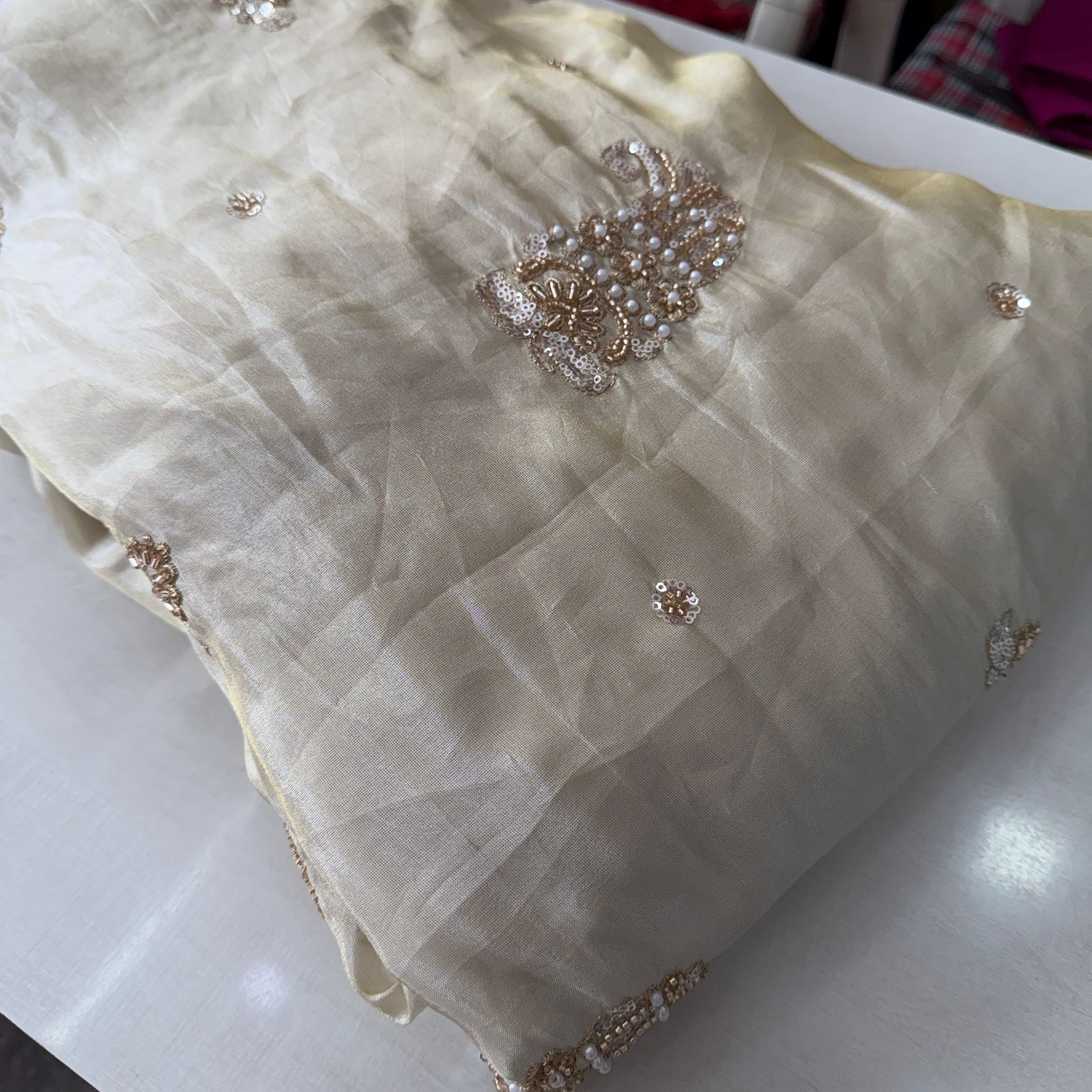 Enhance your festive and wedding creations with our pure zari tissue handwork fabric, crafted with three different elegant butti designs that add richness and royal charm ๐ชกโจ. The subtle shine of zari tissue combined with fine handwork makes this fabric graceful, luxurious, and timeless, perfect for premium ethnic and Indo-western outfits.