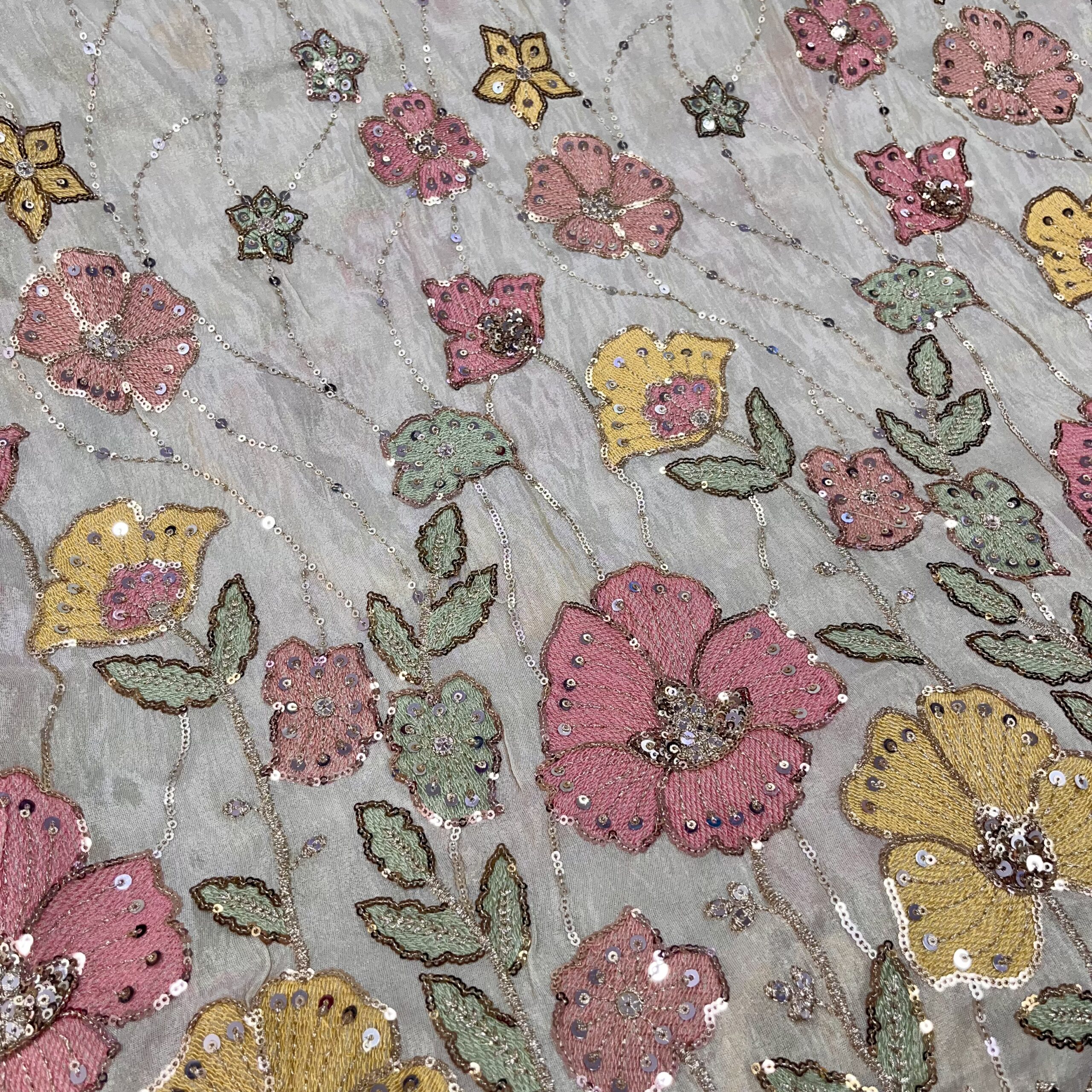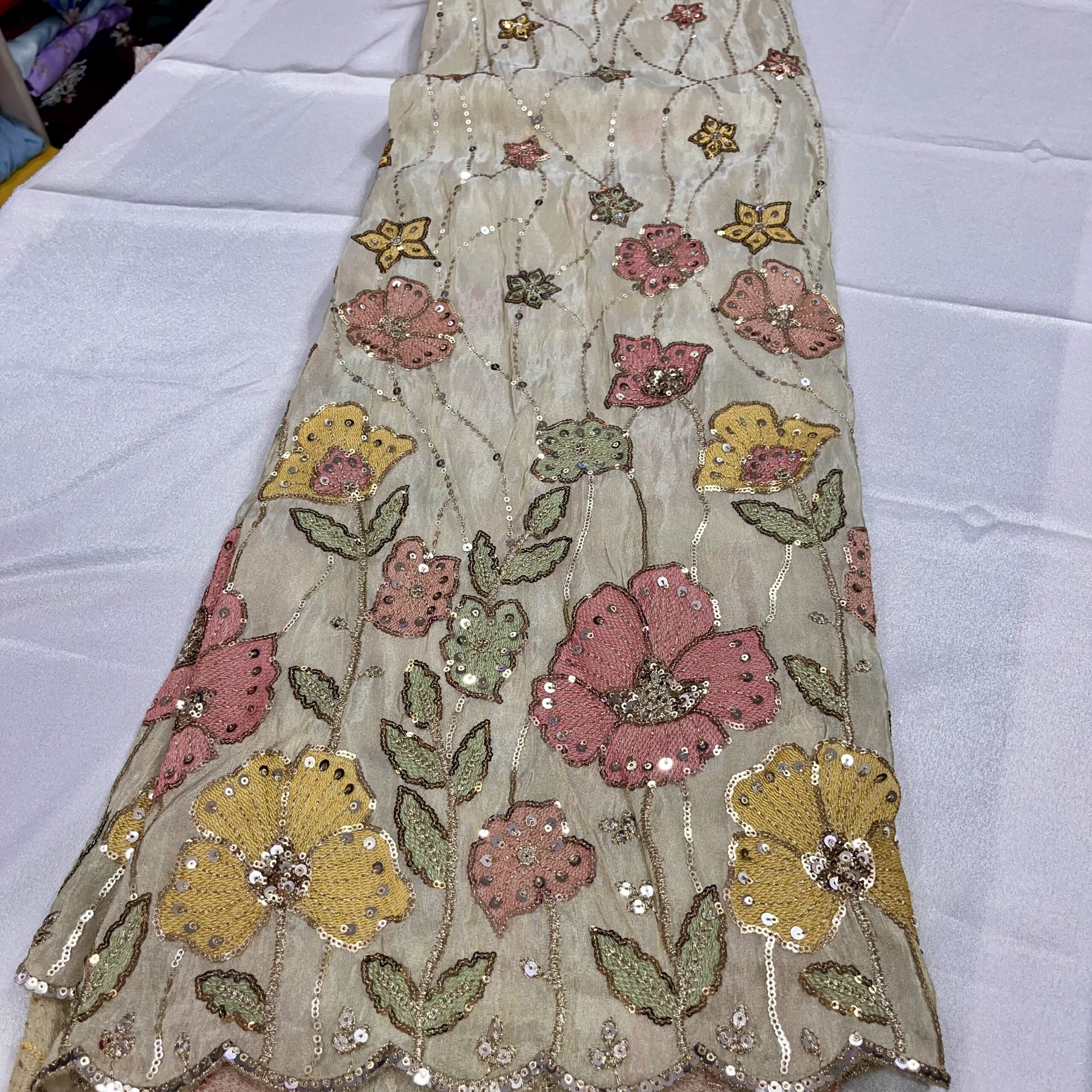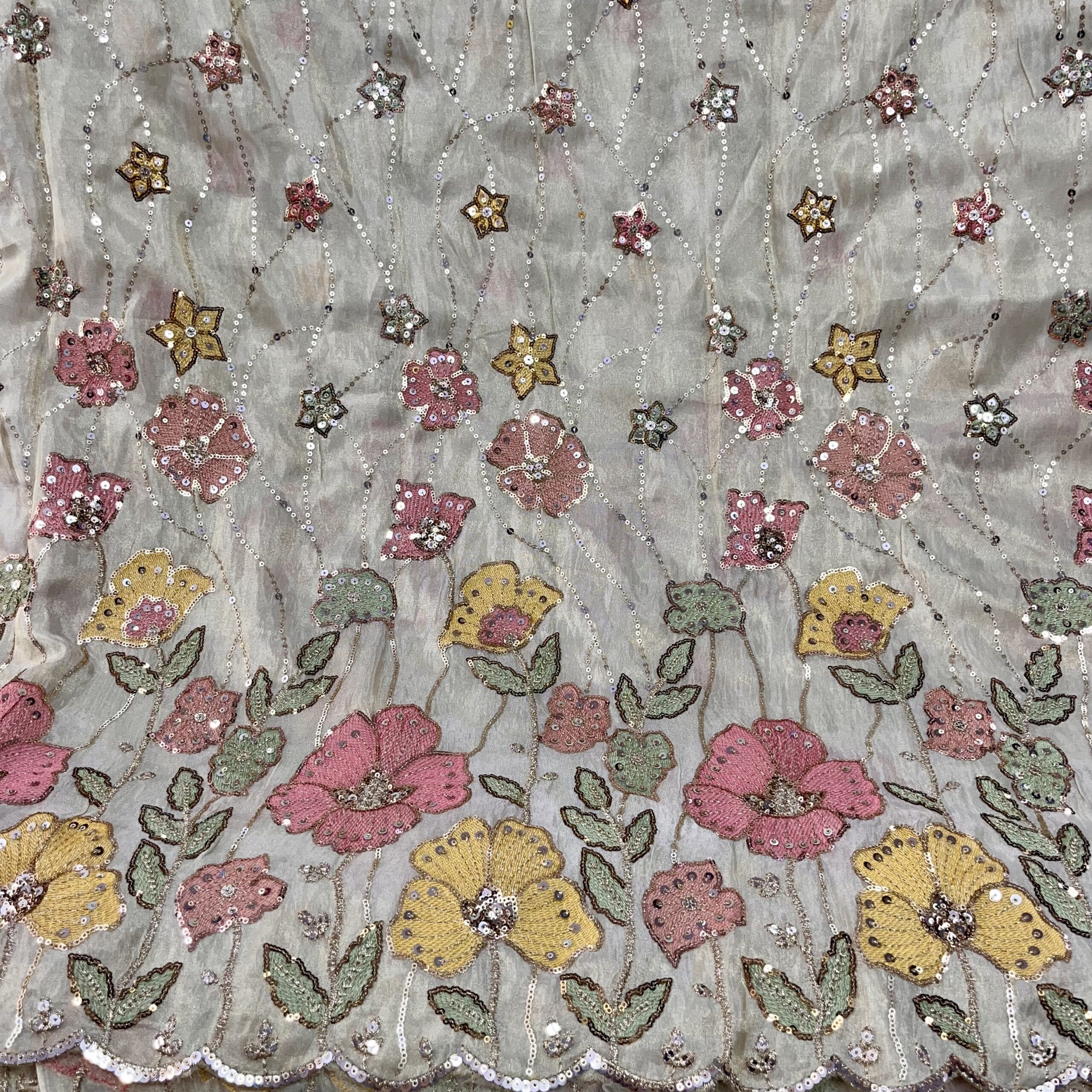 Discover timeless elegance with our zari tissue fabric featuring delicate thread embroidery, perfect for creating wedding and party wear ensembles. This dyeable fabric offers customization flexibility while maintaining a rich, festive appeal. Ideal for designing lehenga, sharara suits, Anarkalis, gowns, and Indo-western outfits, its luxurious texture and wide width provide excellent drape and finish.